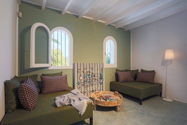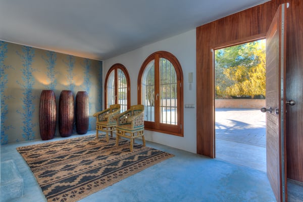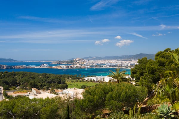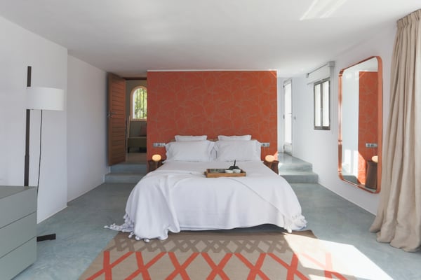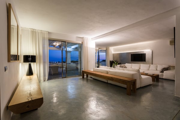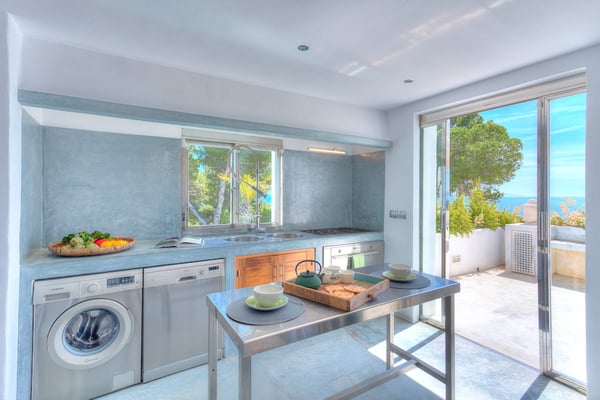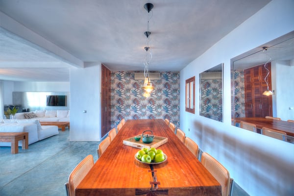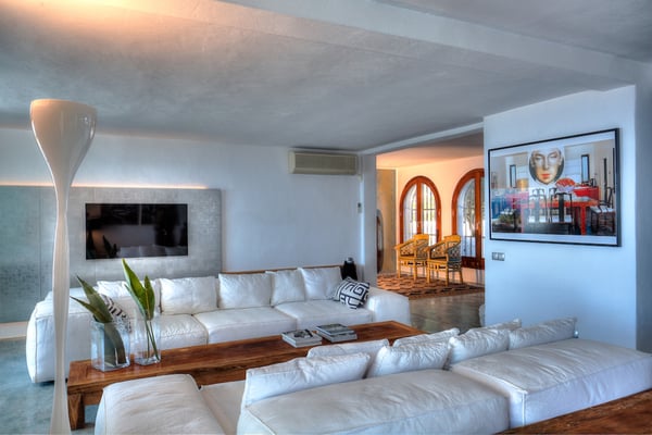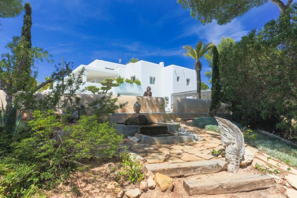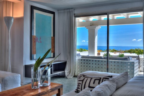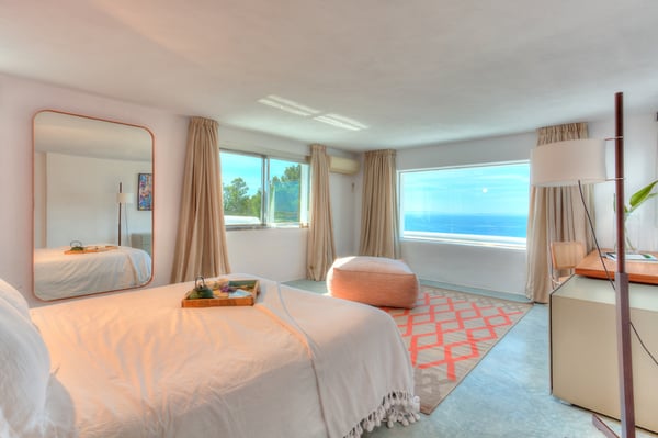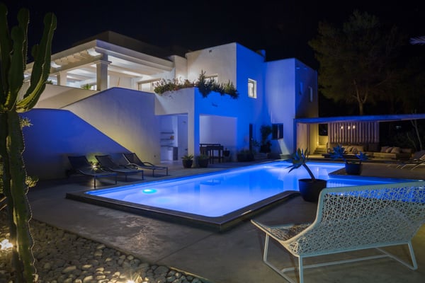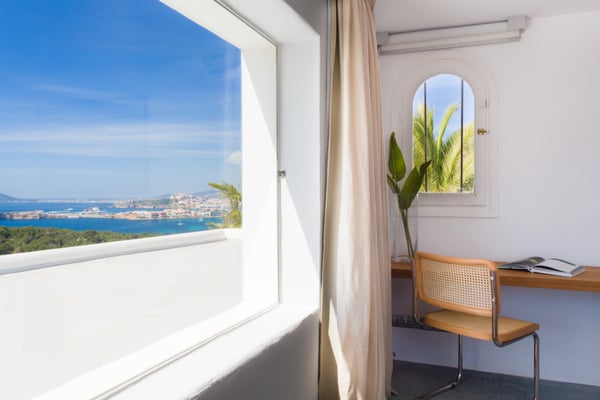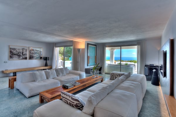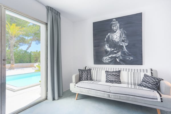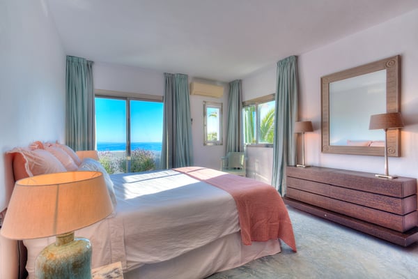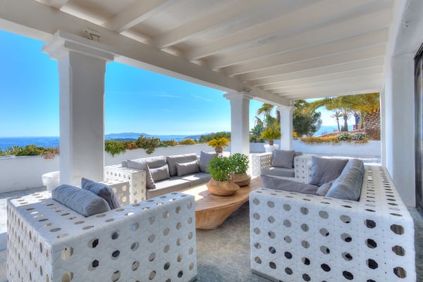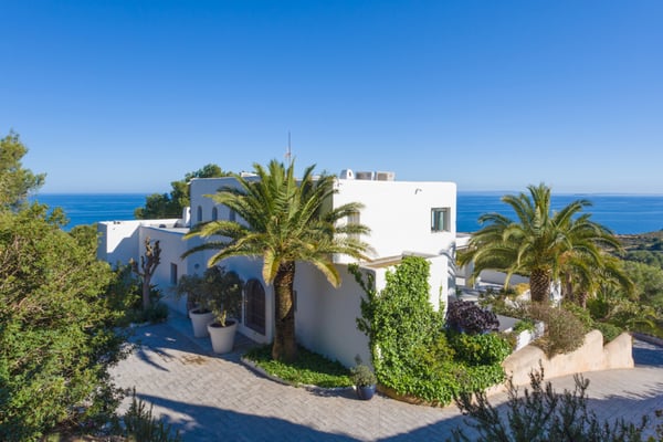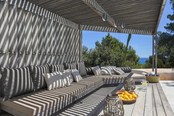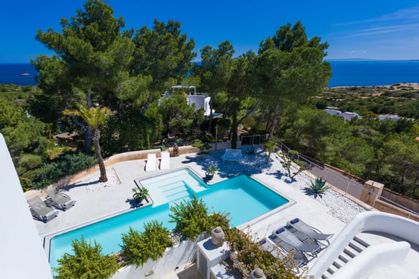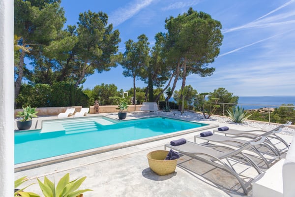 This delightful family villa for ten with a salt-water pool is surrounded by woodland and sits on a hilltop in Cap Martinet, commanding breathtaking views across the Mediterranean Sea to Formentera. This truly amazing view is visible from almost every room in the house. Sturdy stone walls and a private automatic gate provide the highest level of privacy and security. The beautifully paved drive gives easy access to parking for four cars. Also situated on the first floor are the wonderfully designed, large, open-plan lounge and dining areas that open out onto the terrace. The living areas have polished cement floors and are bright and beautifully furnished with modern fixtures and fittings. The lounge area boasts generous seating, a large Smart TV with Sky TV and Apple TV, while the spacious dining area features a large dining table easily accommodating ten guests. There is an alarm system, high-speed internet and air conditioning throughout the house. The salt-water swimming pool, sunbathing area and day bed area are on the ground floor and are fully equipped with sun loungers and parasols; the area is beautifully sculpted and overlooks a woodland nature reserve and the sea. Also on the ground floor, you will find a separate guest bedroom. For outdoor entertaining, the terrace on the first floor boasts a spacious dining area easily seating ten guests, a comfortable covered chill-out area with wonderful views and an outdoor plancha.
