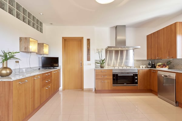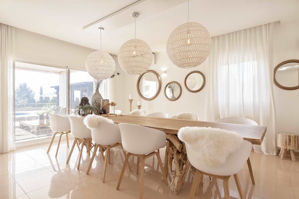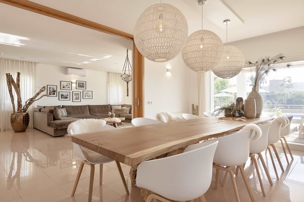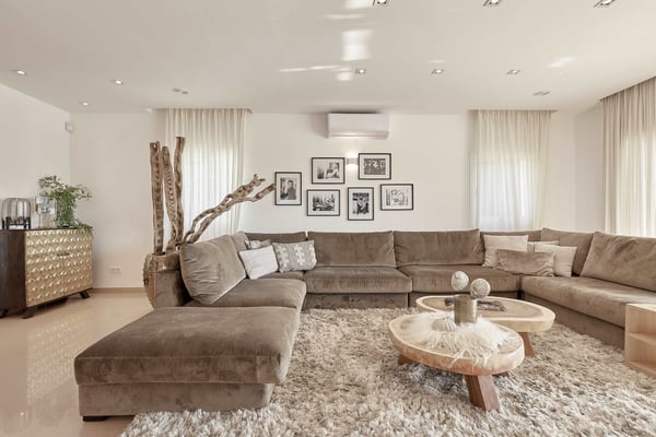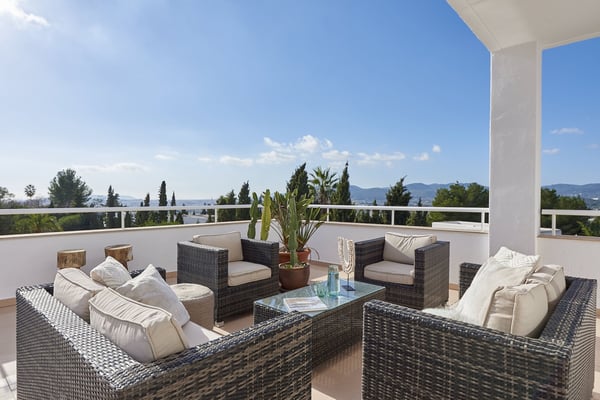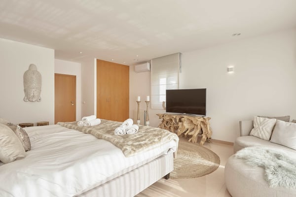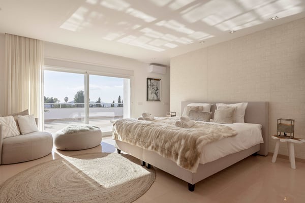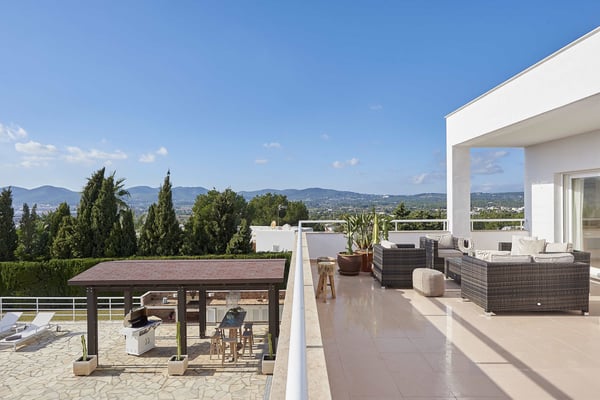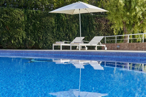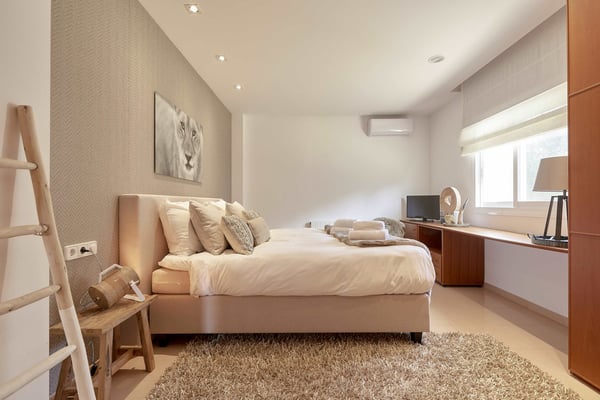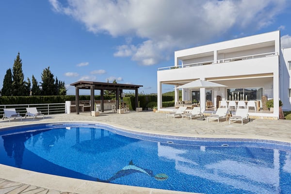The interior space offers five luxurious bedrooms distributed over two floors, all with fully equipped en-suite bathrooms and a separate guest bedroom with an en-suite bathroom in the garden. The living areas are bright, spacious, beautifully styled and furnished, fully air-conditioned, and have wireless internet access. The lounge area consists of a huge comfortable sofa, large TV, and huge sliding windows accessing the covered terrace leading to the pool area and gardens. The dining area is beautifully furnished and easily seats 12 people, this room also has access to the terrace. The fully equipped modern kitchen features high-quality appliances. Sports lovers also have their space as there is fitness equipment downstairs in the basement. The stunning outdoor areas are spacious and perfect for relaxing in the shade or in the sun on the sun loungers overlooking the large swimming pool, or the roof terrace where you can relax and enjoy the view. The beautifully maintained gardens are fully fenced and boast lush green lawns, perfect for kids to play; there's an outdoor covered dining terrace and chill-out area where you can enjoy barbecues and al fresco dining, a separate covered outdoor kitchen and there are several outdoor parking spaces.