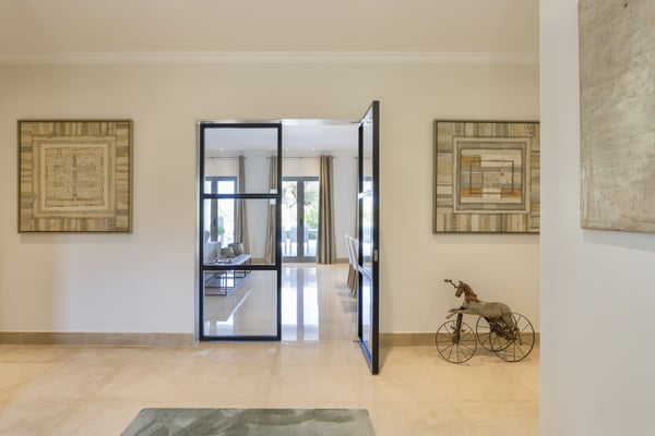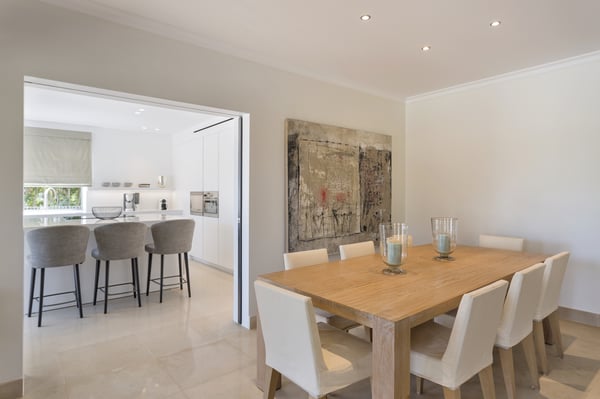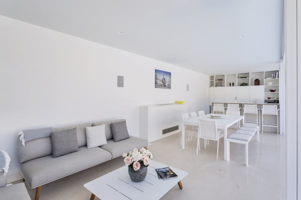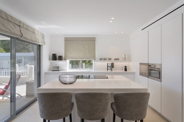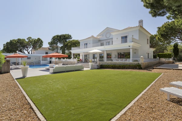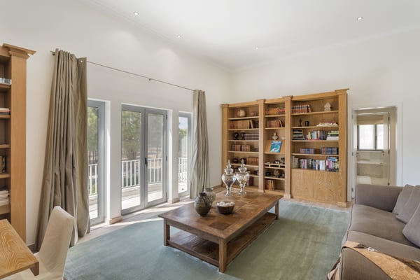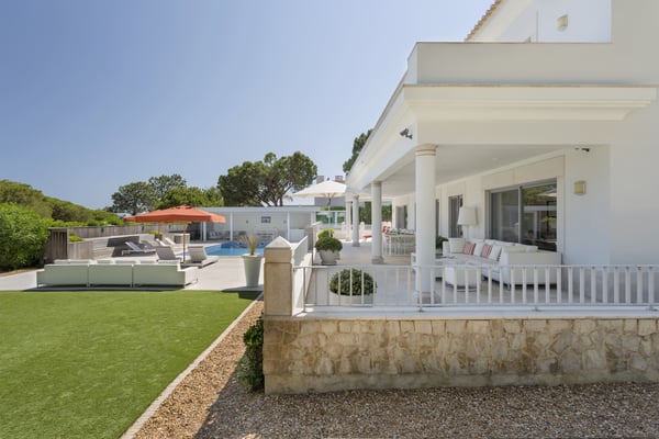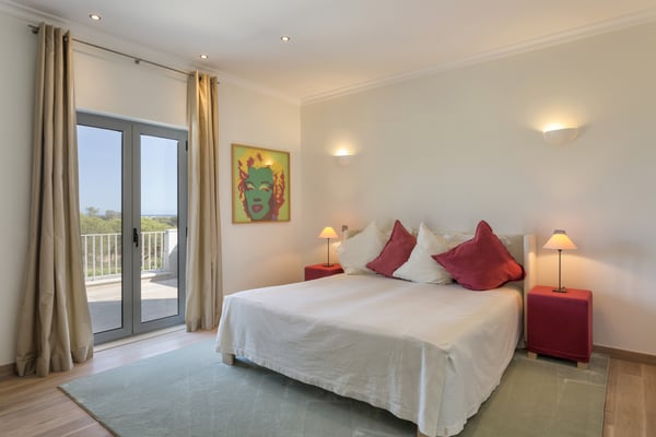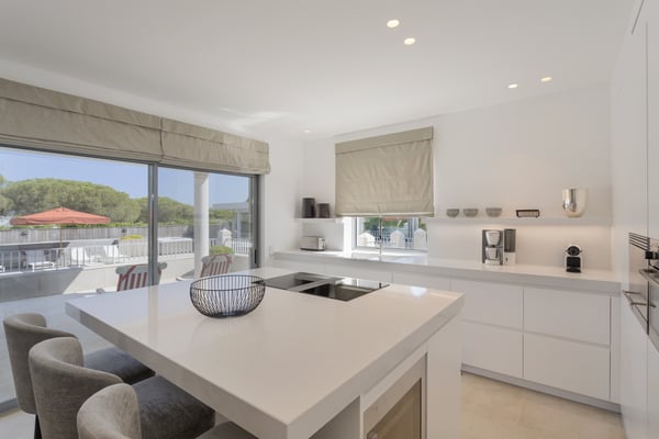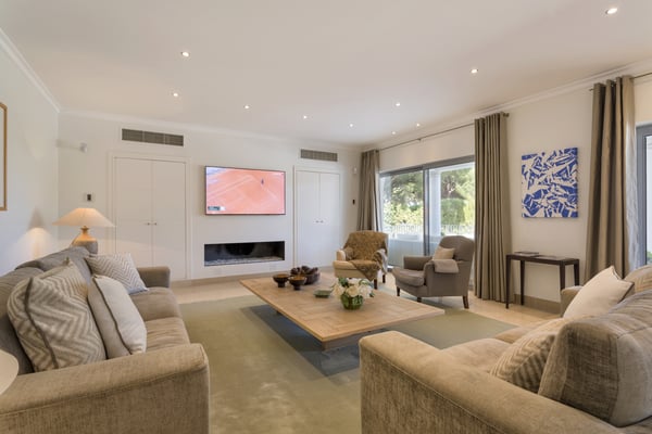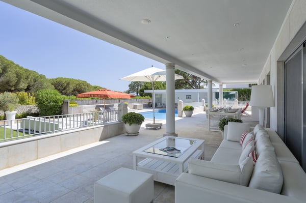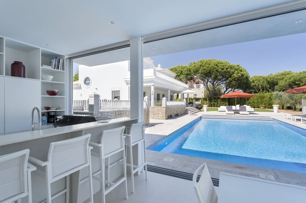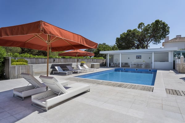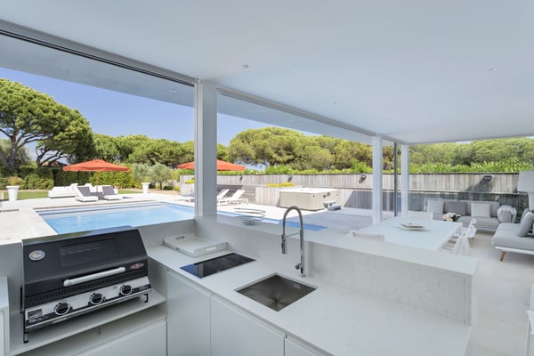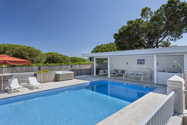 A private large heated swimming pool, Jacuzzi, sauna and golf views are just some of the features of this Algarve modern villa for eleven guests in Quinta do Lago, just five minutes' drive from the beach. Villa Warhol is a substantial contemporary villa situated in the Atlantico Norte section of Quinta do Lago, enjoying lovely views over hole 11 of the famous San Lorenzo golf course. Minimalist garden room with dining table and fully equipped, gas barbecue. In addition in the expansive garden, there is a large outdoor dining table, comfortable seating, sun loungers and parasols, private heated swimming pool and Jacuzzi.