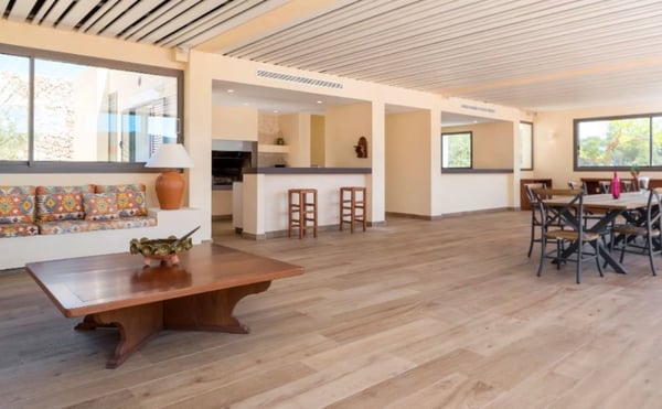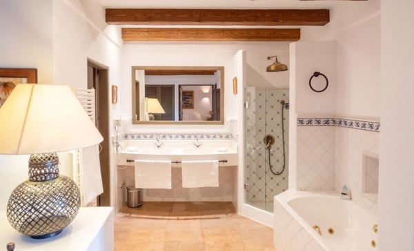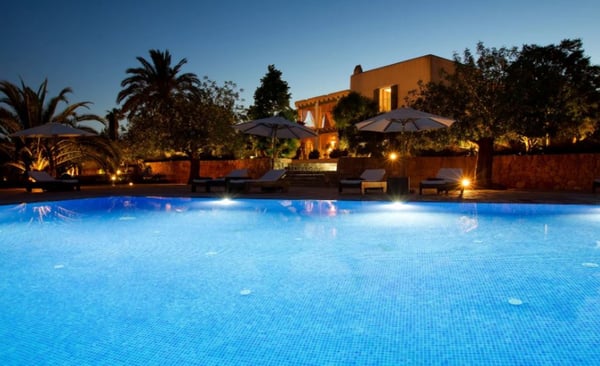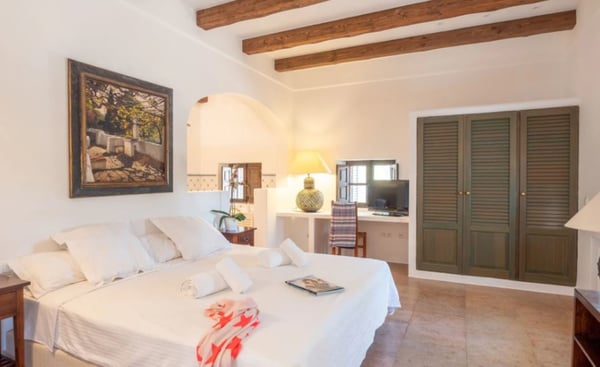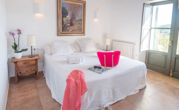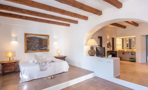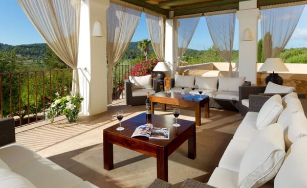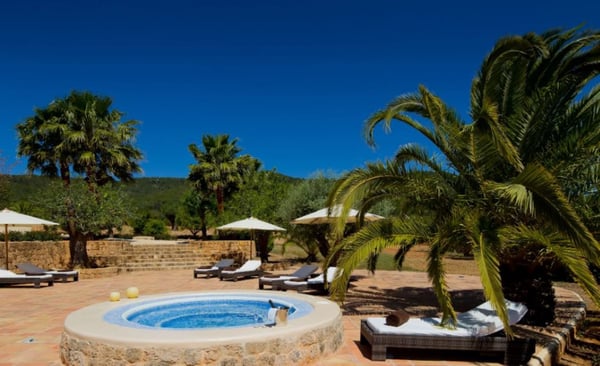 Surrounded by extensive private grounds this newly built, traditional-style villa with pool and jacuzzi is perfect for a relaxing holiday in the green heart of Ibiza, close to St Eulalia. The property boasts 720 square metres of living space built within a 40,000 square metre plot with beautiful countryside views of the mountains in the Santa Eulalia area. Private grounds comprising wonderful gardens and orchards. You will find a swimming pool with Roman-style steps, an outdoor jacuzzi, sunbathing area, a covered terrace with lounge facilities on the first floor. a fully equipped pool house, private garage and ample parking within the property. Please note: the service rooms are only to be used by staff members working on the property or children up to 12 years.