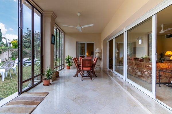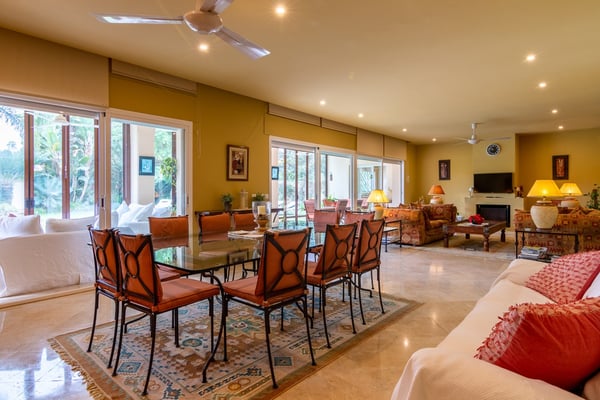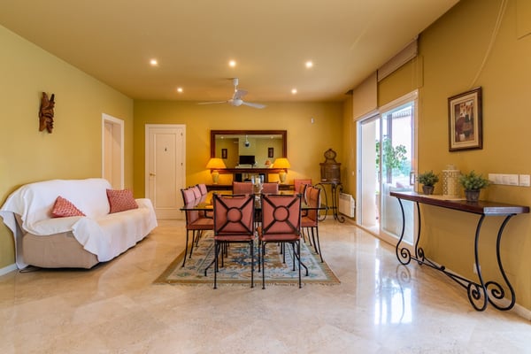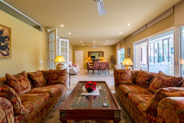 A short stroll from one of Marbella's long sandy beaches, shops and restaurants in Guadalmina Baja, near Puerto Banus, lies this lovely, spacious family villa with heatable pool, ample gardens and pool bar The situation of this six-bedroom property makes it ideal for those wishing to have the sea, the beach and all amenities close at hand. Families travelling with young children will find this villa appealing thanks to features such as the large private flat lawn, the gated heatable pool and table tennis. Grown ups can easily relax and bask in the Andalusian sunshine whilst children play around safely. Large flat grounds comprising mature trees, shrubs, palm trees and ample lawn areas. Private, gated, heatable pool (Roman steps), sunbathing terrace. Pool bar and covered outdoor dining area, BBQ. Table tennis.