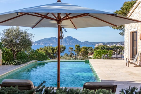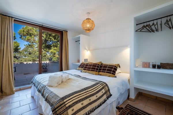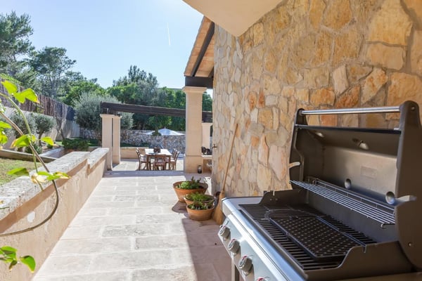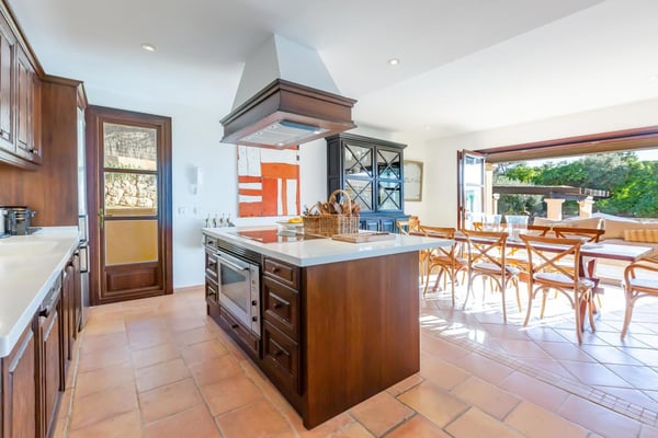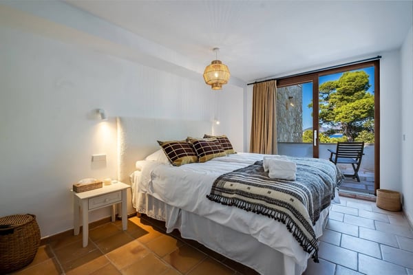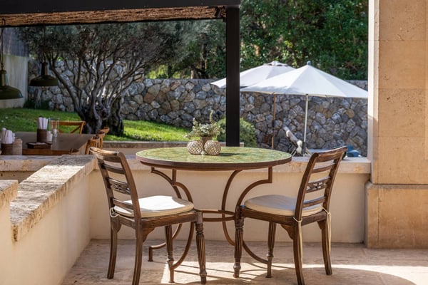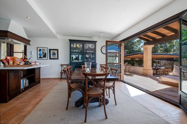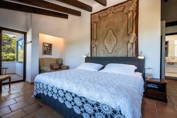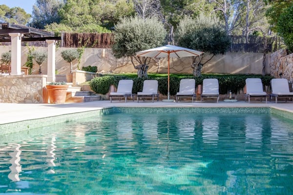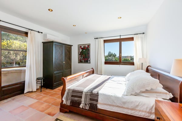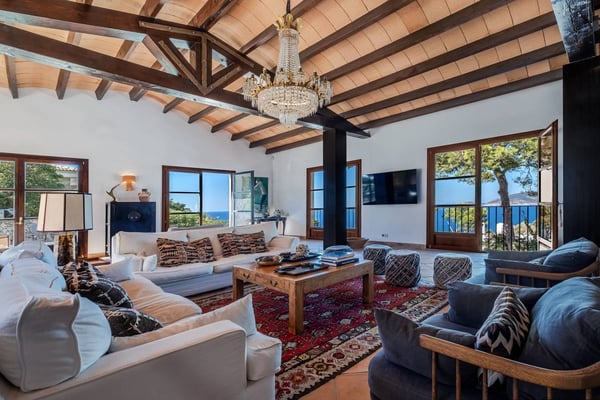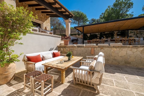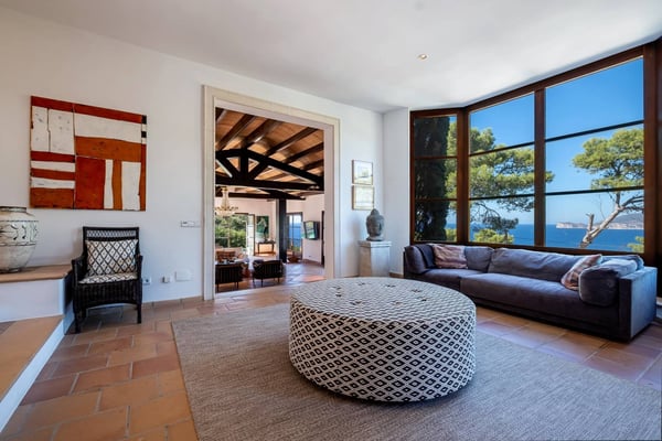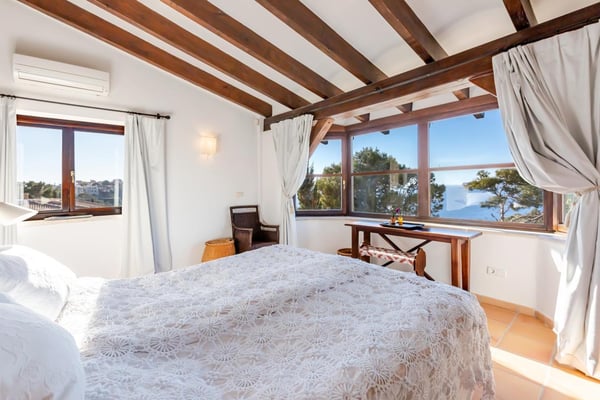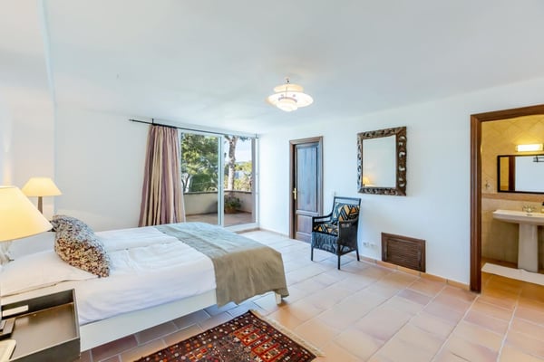 This traditionally stone-built Mallorcan villa with breath-taking views over the Bay of Port Andratx is a luxury home with private infinity pool and spacious terraces for up to 10 guests on the exclusive area of La Mola on the island's south-western coast The high vaulted, wooden beamed ceilings convey a sense of spaciousness to this magnificent Mediterranean style villa which has been completely renovated to very high specs. Set against a rocky backdrop of verdant mountains, this property is situated close to the Gran Folies Beach Club and to an array of chic restaurants and trendy bars in Port Andratx, known to be one of Mallorca's finest resorts. A range of water sports, including scuba diving, are available within easy reach from the villa. With an 18 hole golf course just five minutes away, and five more within a 20 minute drive, this villa will appeal to those passionate about this outdoor sport. Private 1,000 m2 grounds comprising: (newly renovated and separate garden annex with 2 bedrooms sharing a bathroom). Private infinity 11m x 5m pool (Roman steps), large sunbathing area. Terraces with open and shaded lounging areas. Terrace with al fresco dining area, BBQ.