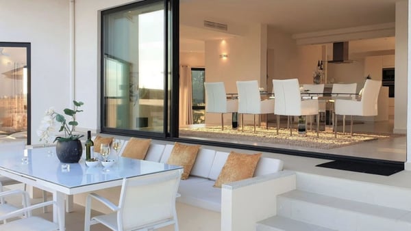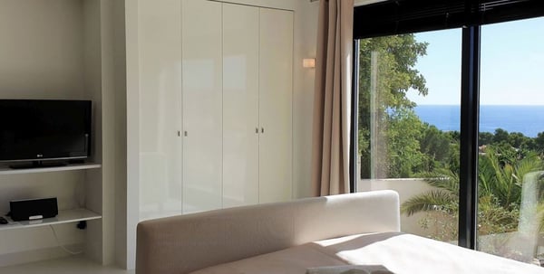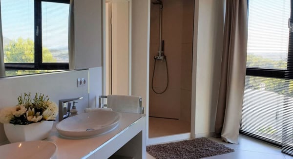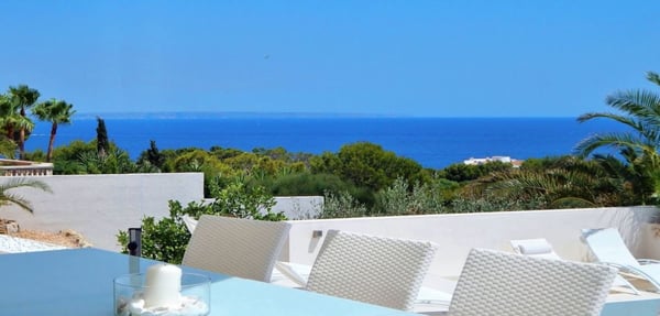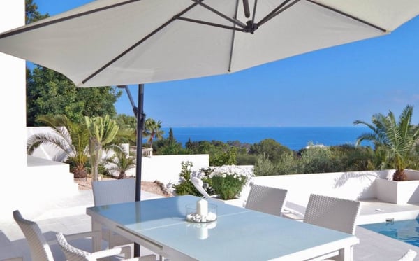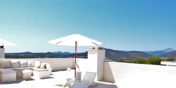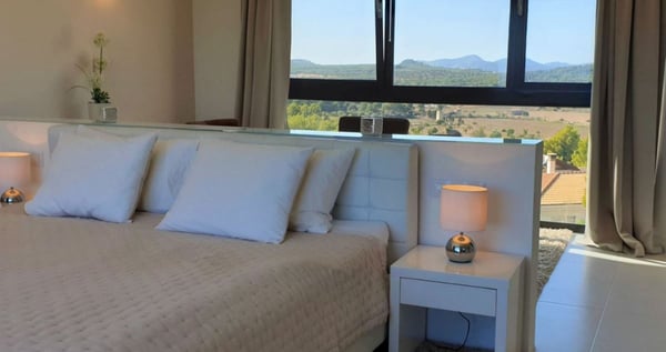 The villa sits high on a hilltop near Sol de Mallorca and offers luxury accommodation to ten people in five bedrooms, all overlooking the sea or the beautiful mountain range. The outdoor space is generous and arranged over terraces furnished for outdoor living, with corners designed to relax, to sunbathe or dine alfresco whilst gazing at the striking panorama. Private grounds comprising cypress and palm trees. Covered and open terraces with table and seating, pool terrace with private pool (Roman steps) and sunbathing area. Al fresco dining area, BBQ. Parking