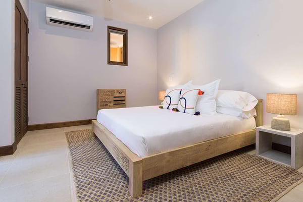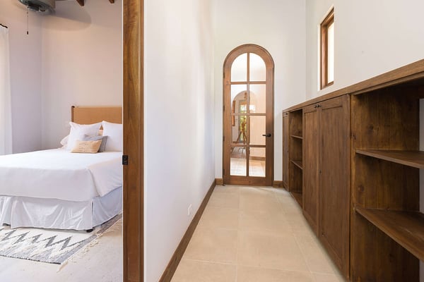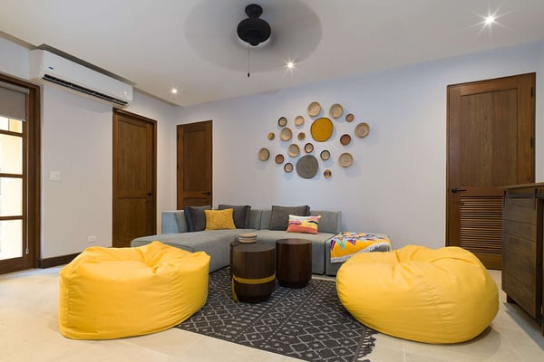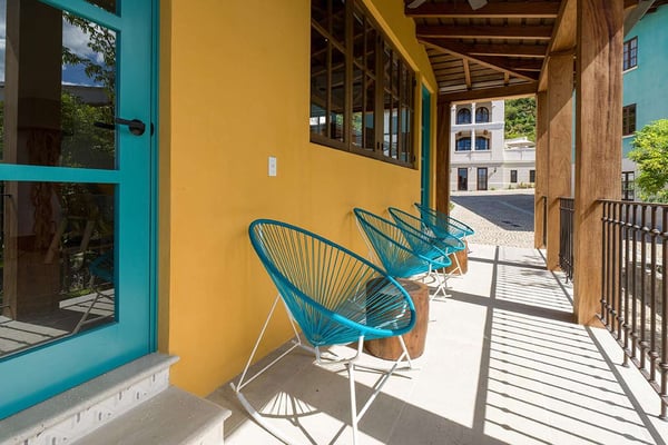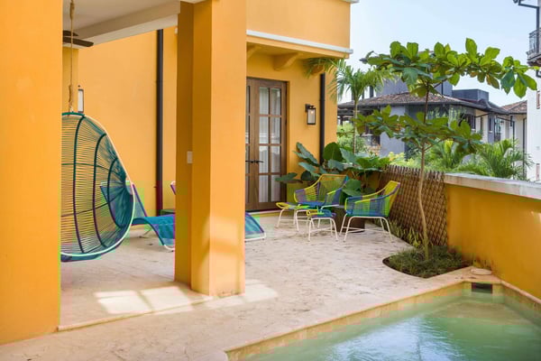 Construction is taking place nearby and may create some noise issues. Contact a villa specialist for more information about how this may impact your stay. Its exterior painted cheerful butterscotch yellow, 4 Calle Cartagena is ideal for families and other groups traveling together. With four king bedrooms (all with town views, two with terraces), as well as a bunk bed, this spacious home is built for fun, both inside and out. (There’s a desk in one of the bedrooms for a little work, too.) 4 Calle Cartagena stands just across Puente San Miguel, the pedestrian bridge that joins Plaza Lucía with Calle Cartagena. In the social tradition of old Guanacaste homes, a long front porch engages with the street. The porch has doors to the front entry and to the kitchen, making it an extension of the interior living areas. Cooking together is an opportunity to connect with loved ones and to experiment with local seasonings and ingredients. This home’s large, windowed kitchen is up to the task, with a six-burner stove; center island with three stools; and full complement of appliances, pots and pans, dishes, and utensils. Next to the kitchen is a dining room with a table for six. Common indoor areas offer natural places to convene. The bright and airy living room invites relaxation, with a sofa, two chairs, and two puffs. Kids both big and small will enjoy the media room, which has access to the pool area, laundry facility, and ice maker. Perhaps the property’s most prized feature is its open-air courtyard, graced by a pool; two loungers and other seating; hammock terrace; covered terrace; and covered dining room, with a cross-barrel vaulted ceiling, table for eight, barbecue, and bar.