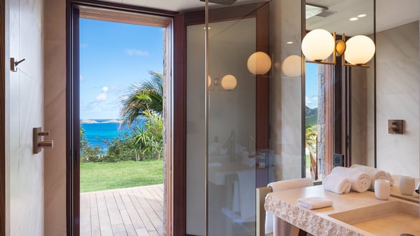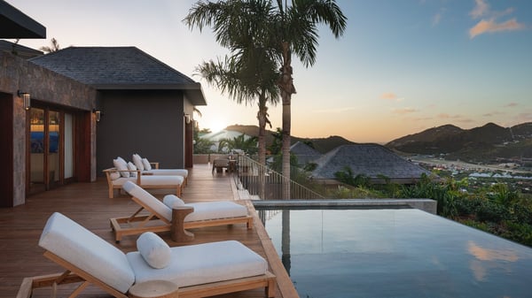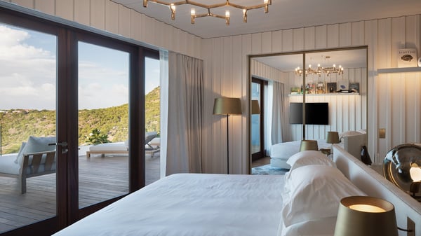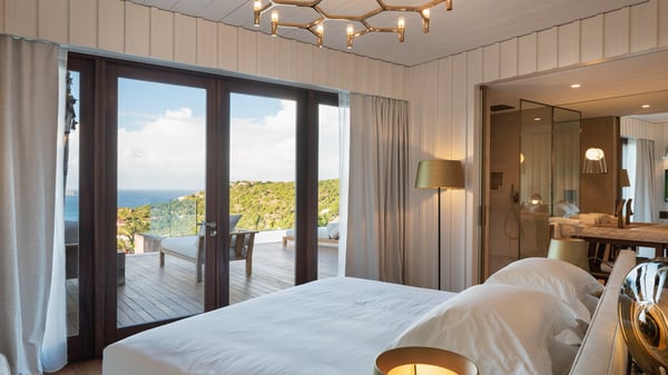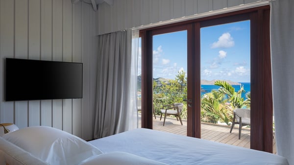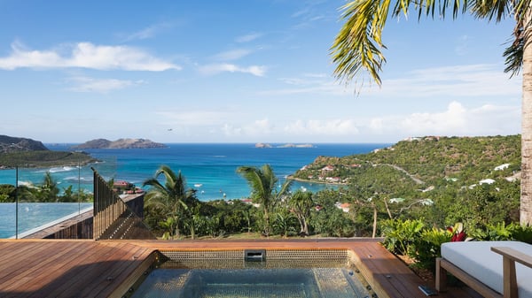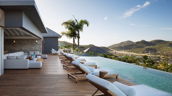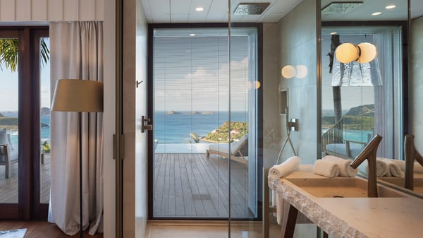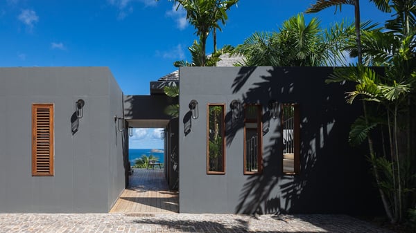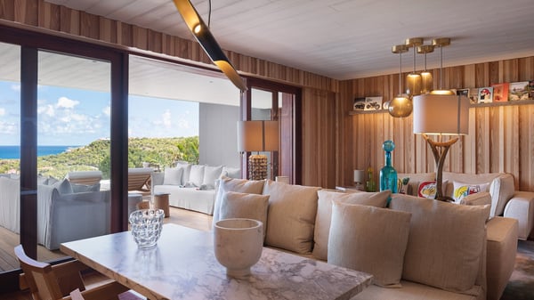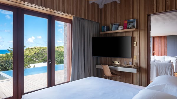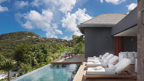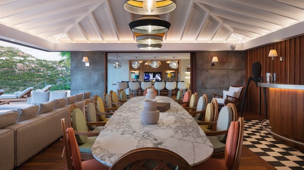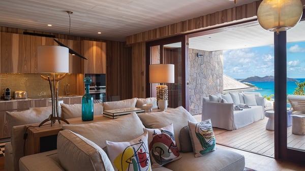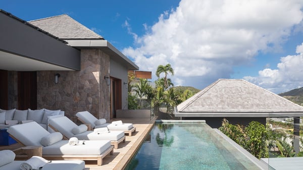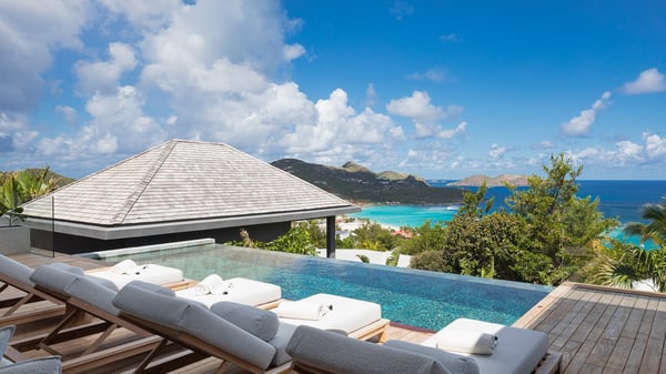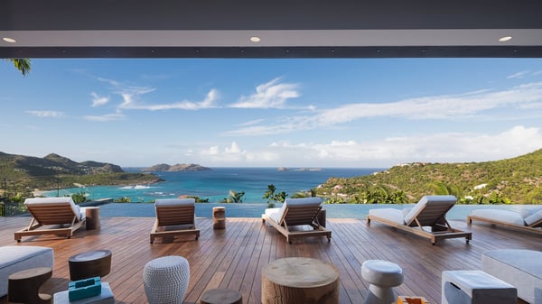 The vacation rental in St-Barth Villa Unik is a sumptuous property located on the heights of St-Jean in front of a stunningly beautiful panorama. This very exclusive vacation rental offers noble materials and inspired architectural style, making this ten-bedroom holiday house the privileged place in St-Barths for an unforgettable stay in front of the infinite ocean. Built over two buildings, villa Unik is a splendid contemporary-style property. The decoration by Philippe Starck creates a delightfully exclusive atmosphere in the heart of the beautiful environment. There is a fully air-conditioned living room furnished with sofas and colourful cushions. The indoor dining room is located close to the kitchen with a breakfast bar featuring a white and black checkerboard style. Onto the front, the large openings offer a breathtaking view over the ocean and the tropical garden planted with lush vegetation, while large windows also open onto the back of the villa, a true fresh island letting the trade winds blow in. For any events, a professional kitchen is available, whenever you wish to call upon a private chef. The front terrace offers a breathtakingly beautiful view over the ocean and the rolling hills. The luxurious furnishings make it a heavenly place to enjoy the Caribbean beauty. The 20m long, heated infinity swimming pool is surrounded by sunbeds, outdoor lounges and coffee tables in a very private atmosphere. Under the covered area, you’ll find a dining room with pastel-coloured chairs that can accommodate sixteen guests close to the cocktail bar. What’s more, a mosaic-covered jacuzzi is available for relaxing sessions in absolute luxury, under the lovely foliage of the Caribbean palm trees. Villa Unik consists of ten bedrooms with bathrooms and views over the ocean or the garden. Seven suites are in the main building, four of which are on the same level as the living room, and three on the lower level. The other three bedrooms are located in a separate building called "The Cottage," which features a checkerboard kitchen, a comfy living room and a second infinity heated pool. A cinema room and a fitness room are also at your disposal in this luxurious property, right in the incredible beauty of St-Barths.