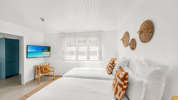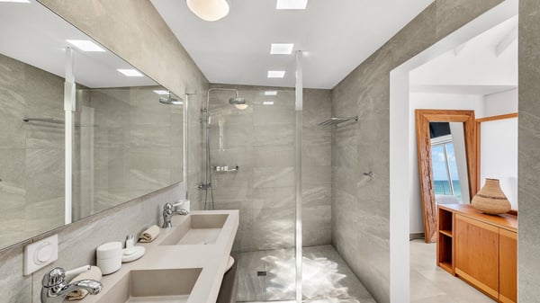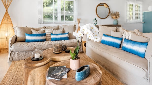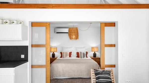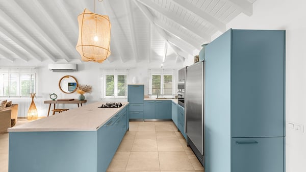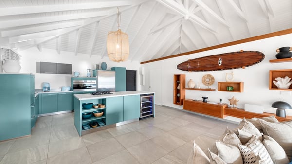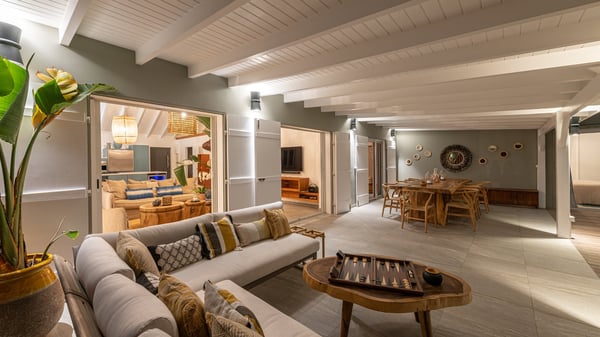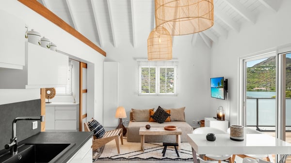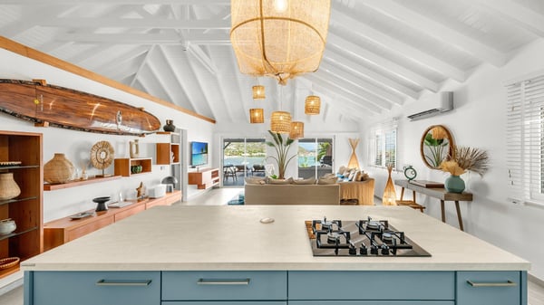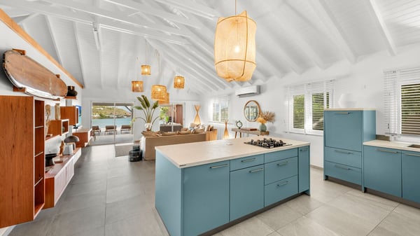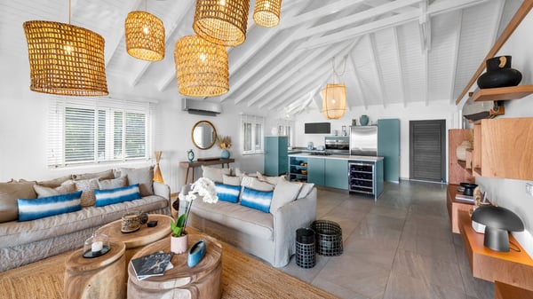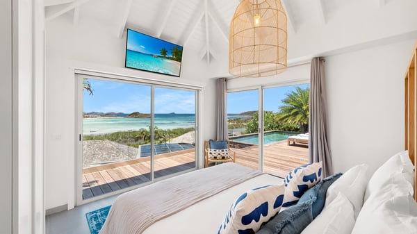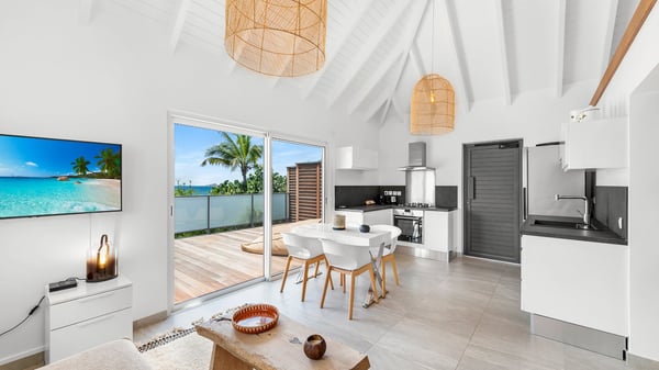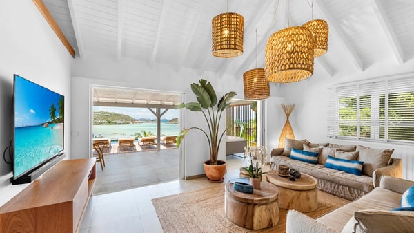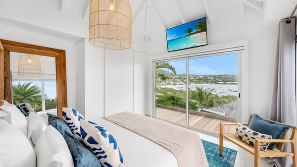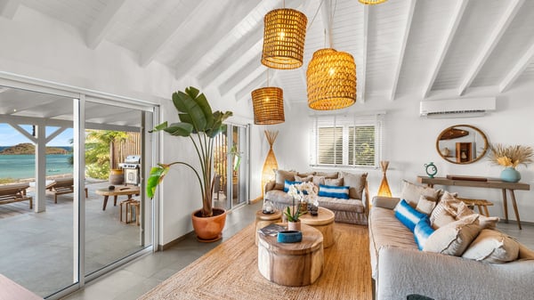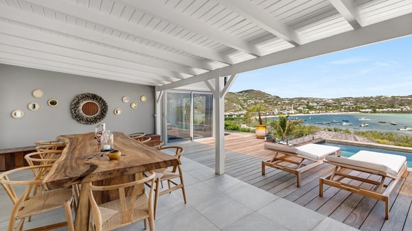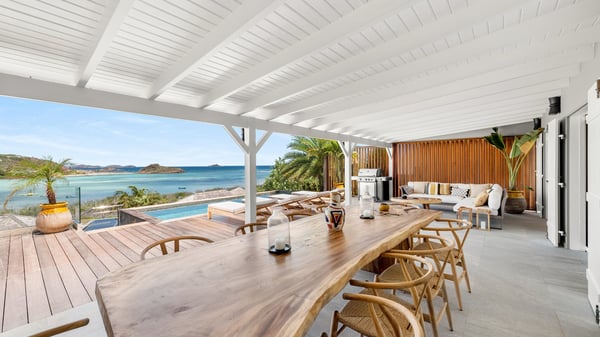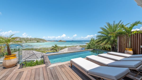Located in front of an outstanding view over the lagoon of Grand-Cul-de-Sac, Essenia is a true gem in the Caribbean nature. Spacious and modern, this four-bedroom property with swimming pool offers the best amenities in a refined décor and welcomes groups of up to eight people for an unforgettable stay in St Barths. Built on a main building and a separate bungalow, Essenia is a fully air-conditioned property in front of the lagoon of Grand-Cul-de-Sac. The amazing view over the translucent waters creates a dream atmosphere through the many openings onto the terrace. The bright living room features windows that let the light in through the room, comfortably furnished with a sofa with cushions, an HDTV and coffee tables in a warm décor of natural fibres and wood. The kitchen shares this open space and is fully equipped to cook meals and prepare drinks. Under the open ceiling, the gentle trade winds softly blow, unless you prefer to enjoy the air conditioning in a cozy atmosphere. At the front of the villa, the terrace offers a fabulous view over the lagoon of Grand-Cul-de-Sac with crystal-clear, translucent turquoise colours. Under the covered area, the dining room welcomes up to ten guests around a raw wood table, close to the comfortable outdoor living room with a corner sofa. A few steps ahead is the swimming pool with deckchairs, the perfect place to relax and sip a cocktail while admiring the ocean view. A barbecue is also available whenever guests wish to cook under the stars and dine al fresco. Eseenia consists of four air-conditioned bedrooms with en-suite bathrooms. Three of them are located in the main building, two of which on the left of the living room with king beds and a lagoon view, and the third is furnished with twin beds. The fourth room is a separate luxury suite located in a bungalow above the villa, with a kitchenette, lounge, dining room and private terrace with sunbathing area and lagoon view. The decoration is elegant, with soft cushions and cozy wood touches. Ideally located in a residential area of Grand-Cul-de-Sac, Essenia is the perfect place for an eight-person stay in St Barths.