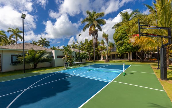 • Fully lit pickleball court, with half basketball court and court-side seating area on a deck