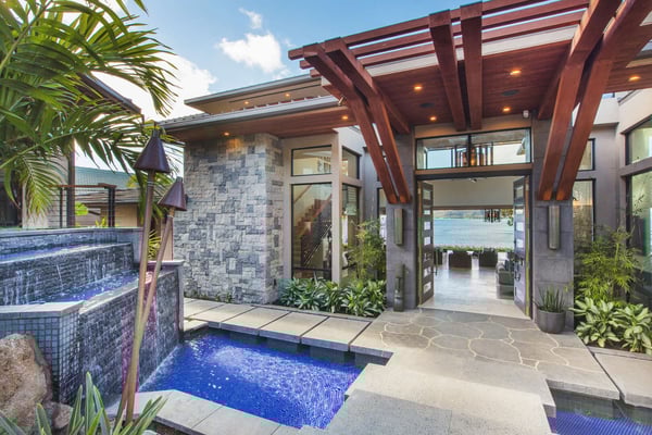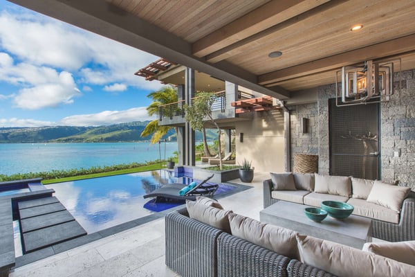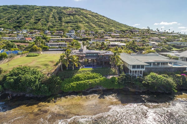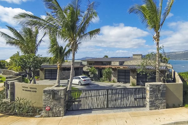 The staircase leading to the primary bedroom does not have a railing. All persons are advised to use the stairs with caution and do so at their own risk. Minors should have adult supervision at all times. Ocean House is the newest residence in the collection of ultra-luxury homes designed by renowned Hawaii Architect Jim McPeak and built by San Diego-based developer Mark Gosselin. This estate is a modern take on Oahu's well-known Banyan House. It captures a similar style of oversized, grand spaces all centered around the stunning ocean view. With three ocean view suites, each room affords its own level of comfort and privacy. Each bedroom is spacious with its own en-suite bathroom. The upstairs primary has its own sitting room with a desk and the downstairs primary has an extended split-level room with gym equipment. The owner's trademark style was used throughout the home and is quickly apparent with the round-about driveway, floating step entrance, and oversize front door. The grand room, the center of the home, boasts 25-foot ceilings and endless ocean views. Its indoor waterfall only adds to the already relaxing atmosphere. Designed for Hawaii's signature indoor outdoor lifestyle, the grand room's doors pocket back entirely and open the home to the outdoor lounge and oceanside yard. The infinity-edge pool and jacuzzi disappear into the horizon and pull the ocean even closer to you. Beneath the oceanside yard is a hidden sand terrace with two chaise lounges. It is like your own private cove perched above Oahu's most stunning seascape. Just below the same terrace is your private ocean access to the Portlock tide pools where dipping your toes and searching for hermit crabs, shells and colourful reef fish is only too fun. Located in southeast Oahu, Portlock is a desirable, affluent neighbourhood known for its luxurious estate homes with ocean views. Overlooking Maunalua Bay, Portlock offers a unique perspective facing west where spectacular sunsets over Diamond Head can be enjoyed each evening. Though Portlock itself has no sandy beach, the famous snorkeling paradise, Hanauma Bay, is just around the corner. Also conveniently nearby is Hawaii Kai Town Center and Koko Marina filled with shops, eateries, adventure tour companies, and much more! This neighbourhood is perfect for a family that wants a little more space, privacy, and a more local island experience.