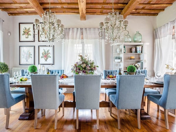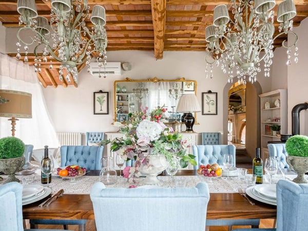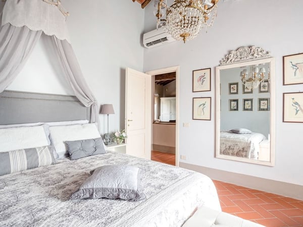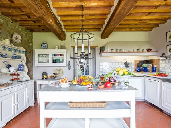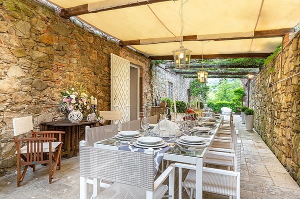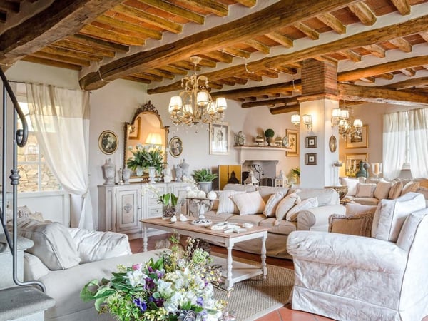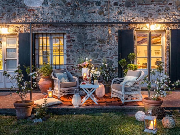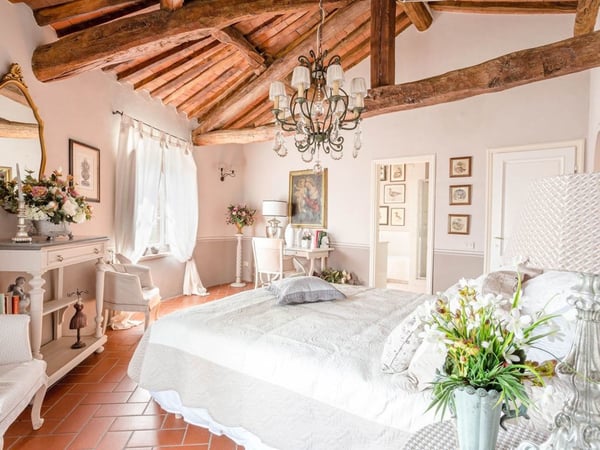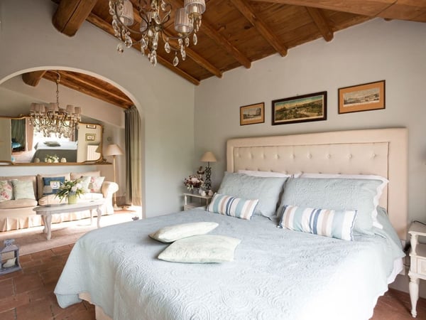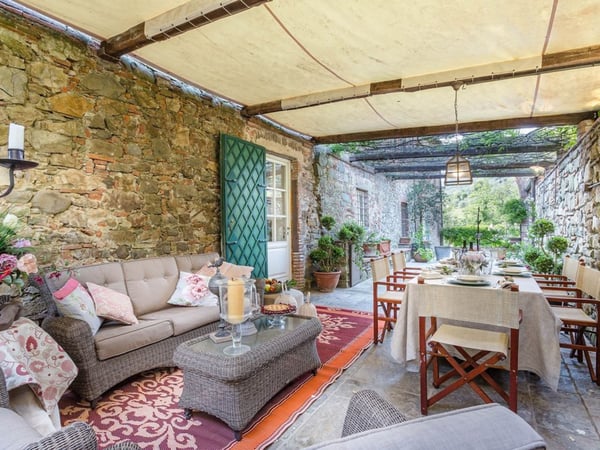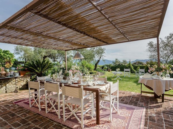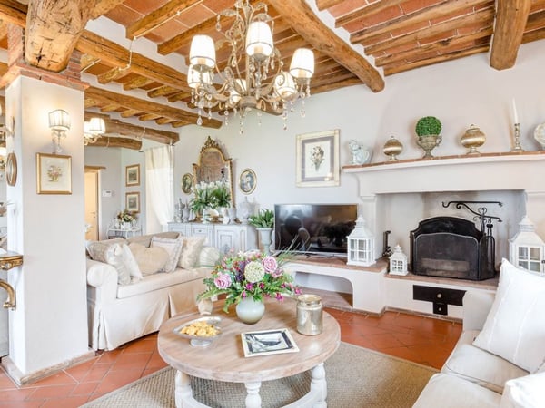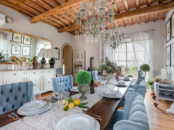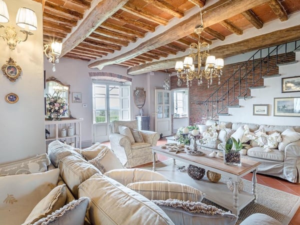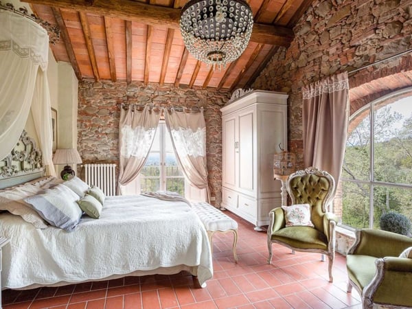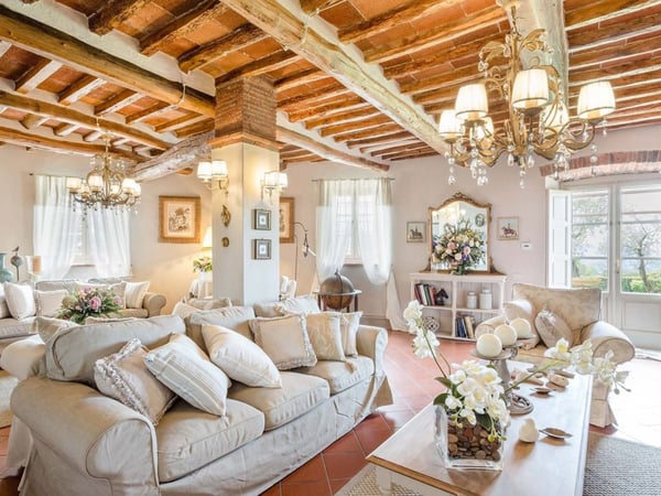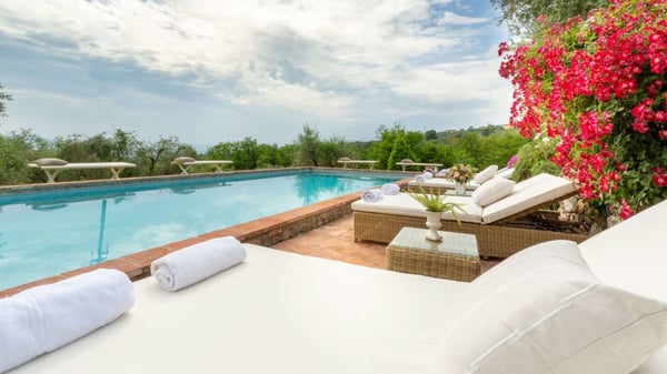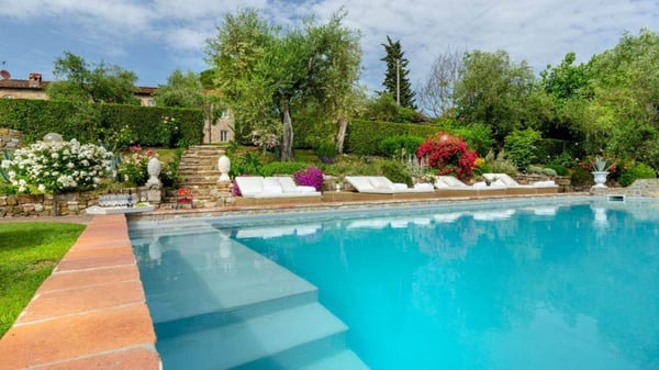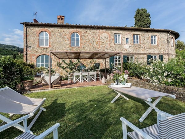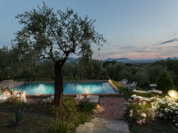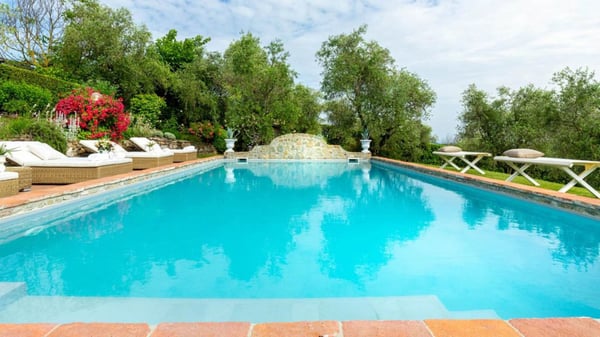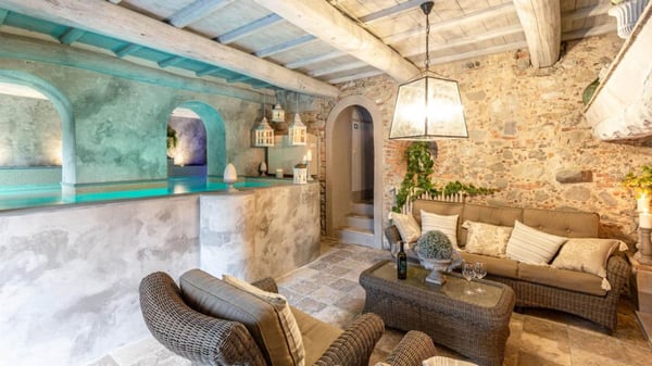 Nestled amidst the vineyard-coated hills of Lucca, this magnificent country residence is exquisitely decorated and styled to welcome fourteen guests in luxury and comfort featuring two swimming pools, a Jacuzzi hot tub and fabulous gardens with olive groves and woodland all around, just a short drive from the Versilia coast. Enter the grand living room with beamed ceilings to uncover a life of luxury. You will find seven bedrooms to host you and all of your guests, each of them being classically decorated. On the lower floor, spend time in the salt-water heated pool with power jets and seats to wind down for the evening. Step outdoors to several outdoor covered and open terraces with outdoor lounge and dining areas, a barbecue, a wood-fired pizza oven, jacuzzi hot tub and waterfall. Pool terrace, private pool with Roman-style steps, sunbathing area with sun loungers.