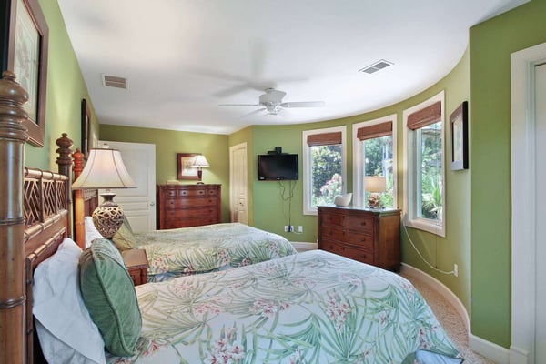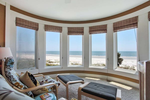 Located on the beautiful island of Hilton Head, Palmetto Dunes offers an array of activities for the entire family to enjoy, such as bike trails, tennis, boating, shopping, golf, kayaking and paddleboarding. The Dunes are also home to loggerhead turtle nests, dolphins and a variety of bird species such as herons and ospreys. This amazing Hilton Head oceanfront home offers spectacular ocean views and luxurious furnishings. Twelve steps lead to the entry where you will find a great room with a sectional couch with a sleeper sofa, decorative chair, wall-mounted flat-screen TV, DVD, stereo, powder room, bar area with a sink, granite, refrigerator, and ice maker. This level has five bedrooms. The first has a king bed, a flat-screen TV with a built-in DVD player, a door to the pool area, an ocean view, and a private bath. The next two bedrooms have queen beds, flat-screen TVs with built-in DVD players, and private baths. The fourth bedroom has a queen bed, a twin bed, a flat-screen TV with a built-in DVD player, and a private bath. Next is a bedroom with 2 queens, a flat-screen TV with a built-in DVD player, a private bath, and doors leading to the pool and spa. A dual staircase leads to the second floor of this beautiful home. The main living area, kitchen, dining area, and primary plus a powder room are located on the second floor. The main living area features a sleeper sofa, a matching sofa, two decorative chairs, plenty of seating, and a door to a spacious balcony overlooking the Atlantic. The beautiful living room also has a wall-mounted plasma flat-screen TV with a DVD player. The kitchen/dining area features two stoves, two dishwashers, all stainless steel, granite countertops, and a laundry room with a full-size washer and dryer. There is seating at the dining bar for seven, plus a formal dining table for nine. Off the dining area is a screened porch overlooking the pool and ocean with a propane grill. Two minutes from the Palmetto Dunes golf course The enormous master suite is furnished with a king bed, flat-screen TV with a built-in DVD player, a door to the oceanfront balcony and a large walk-in closet. The magnificent primary bath has a luxurious shower with body sprays and a rainfall showerhead plus a jacuzzi tub. A spiral staircase from the master leads to a private observation loft overlooking the ocean.
