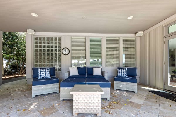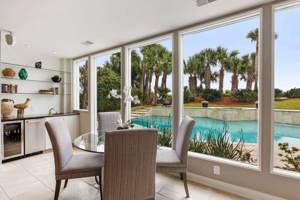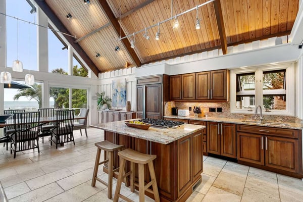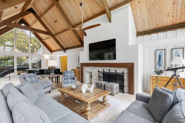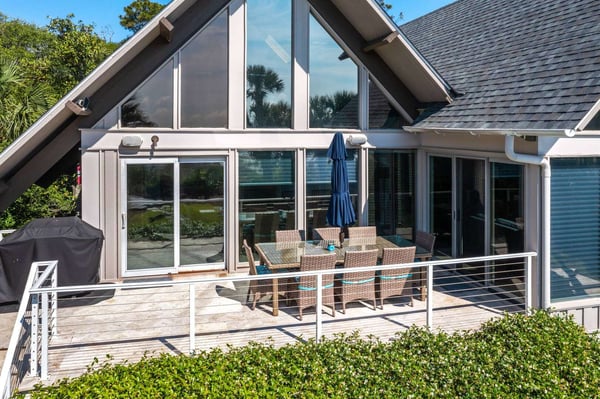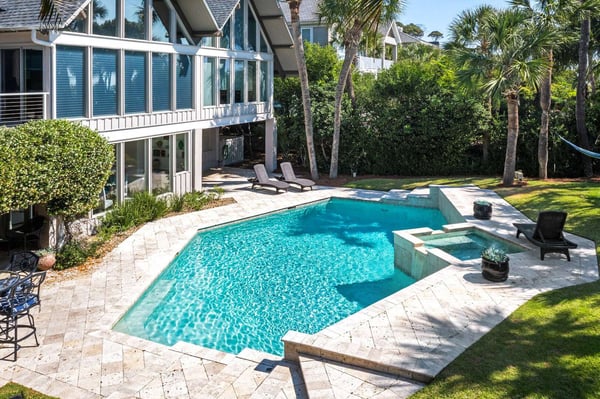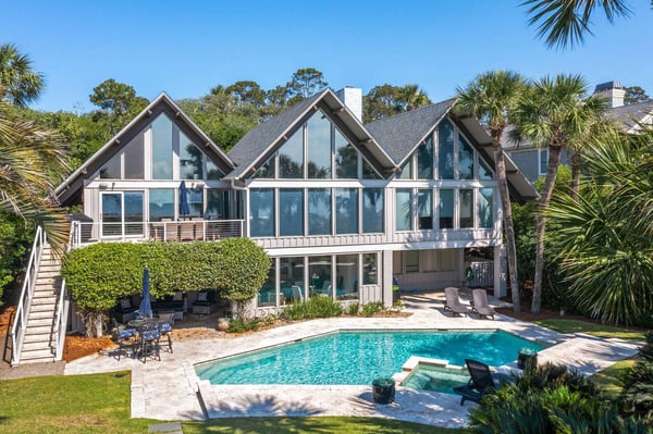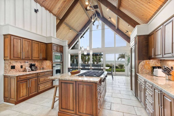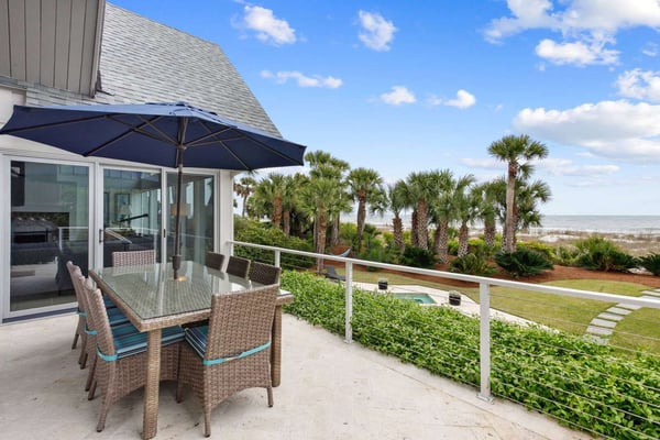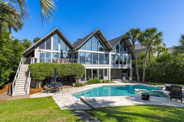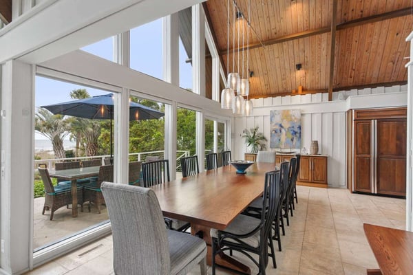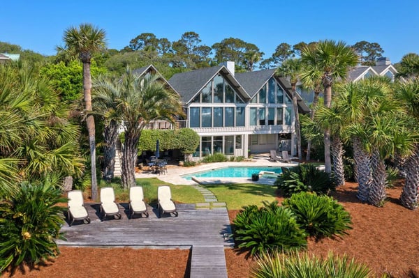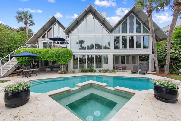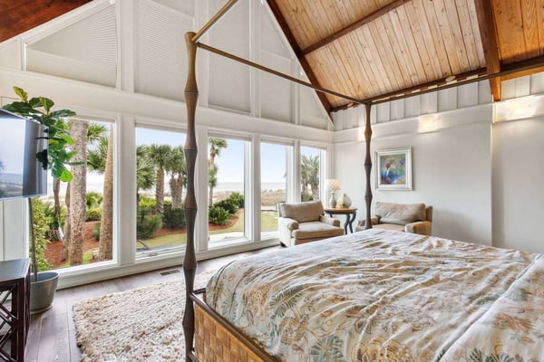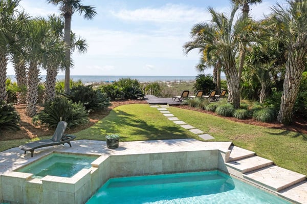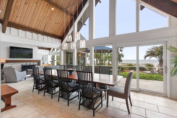 Hilton Head is a small island, popular with golfers, 95 miles from Charleston and 40 miles from Savannah, Georgia. Apart from almost 30 golf courses, it also offers 12 miles of stunning sugar white beaches, marinas and subtropical forests. Here you can hire bikes, beach comb, jog, swim or bird watch in the delightful surroundings of this beautiful tropical island. Amazing oceanfront 5,300 square foot home…..your ideal vacation getaway! The home is perfect for entertaining with six bedrooms, six and a half baths, two large living areas with large TVs (82 inches and 65 inches) and relaxing sitting areas to enjoy the beachfront life. Featuring spectacular ocean views, a large pool with a waterfall feature and outdoor seating with private access to the beach! Main Floor: The two-story entry welcomes you to the home. A wall of windows brings the light into the cozy living room with a large TV, sectional couch and wet bar. Walk out directly to the pool deck. There is travertine tile throughout the entry and living room spaces. On the main floor are three bedrooms with the fourth bedroom set up with a king bed, the fifth bedroom with two Schoolhouse twin bunk beds with stairs and one additional twin trundle and the sixth bedroom with a queen bed. All bedrooms have large plank-styled floors, en suite bathrooms, TVs and closet and drawer storage. The spacious laundry room is also on this level with a matching GE washer and dryer. Top Floor: A curved staircase brings you to the top floor where you will be awed by the +20-foot cathedral ceilings with wood beams that create a natural, light-filled experience. Then take in the view of the beach from the living and dining/kitchen space and the sound of the waves from the deck on this level. The living room takes advantage of the high ceilings with an 82-inch TV mounted over the fireplace mantel, grand piano and comfortable space to enjoy time together or enjoy the view. The dining room has a handcrafted, live-edge custom wood table that seats 14. This leads into the kitchen with a large island, Dacor stainless steel and built-in appliances and well-stocked kitchenware to enjoy a culinary adventure. Step out of the kitchen onto the deck which overlooks the pool. Grill your meal and dine al fresco at the deck table. In addition, there is an office/den space off the kitchen that has a pull-out queen-size sofa and TV. On this floor, there are three bedrooms, all with cathedral ceilings. The first bedroom is the master suite with a king bed and sitting area. The master bathroom has a tray ceiling with an oversized shower and his and her vanities and closets. The second bedroom has a king bed and en suite bathroom. The third bedroom has two side-by-side queen beds and an en suite bathroom with two separate vanities. All bedrooms have TVs and ample storage space. Main Floor Pool Deck: There is room to enjoy the outdoors with a covered patio area that has table-top seating for 6 and a second covered patio area with sectional seating and outdoor toys all leading to the large pool. The upper pool seating area is above the main pool which allows for a gentle waterfall. Nestled below the shade of the palm trees near the beach are loungers. The private path to the beach has a sunning area with more loungers…..and the sound of the waves where you will feel like you are on your own private beach.
