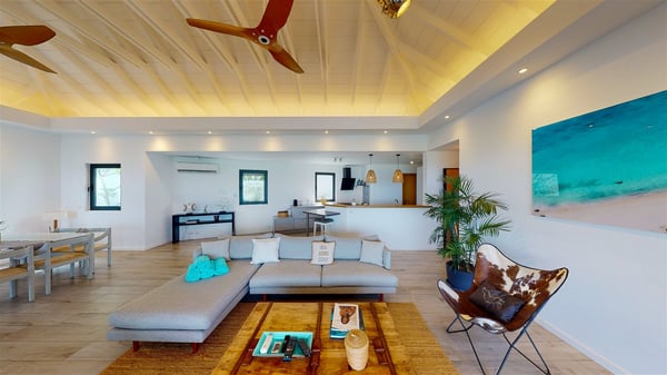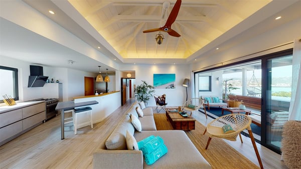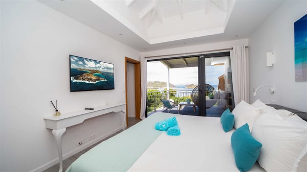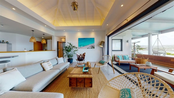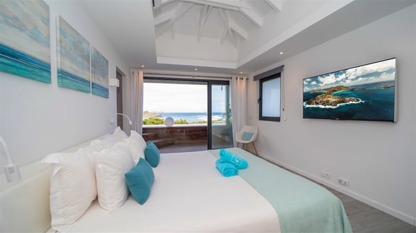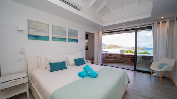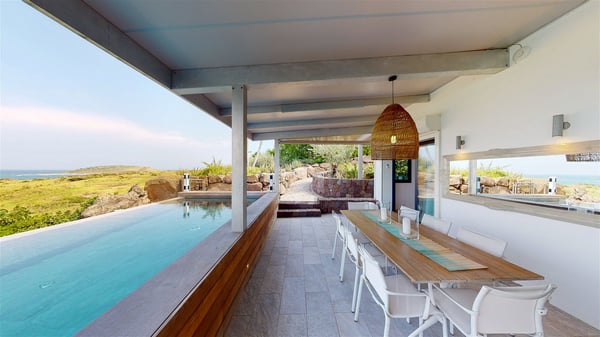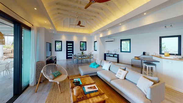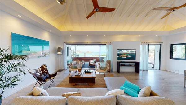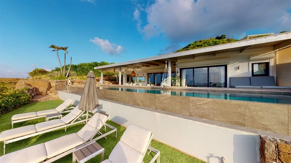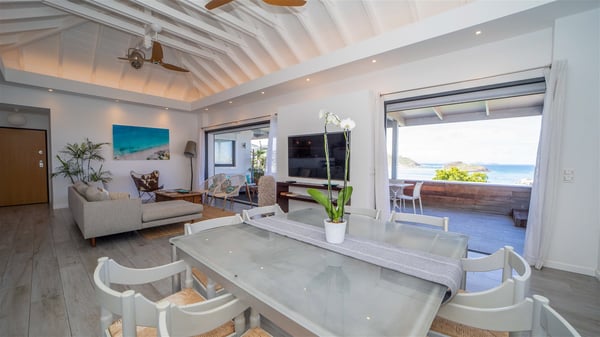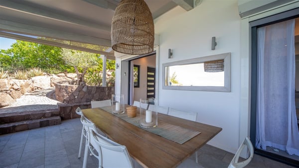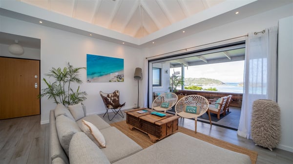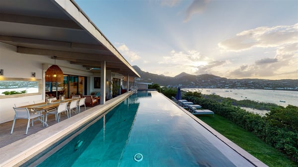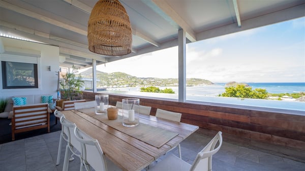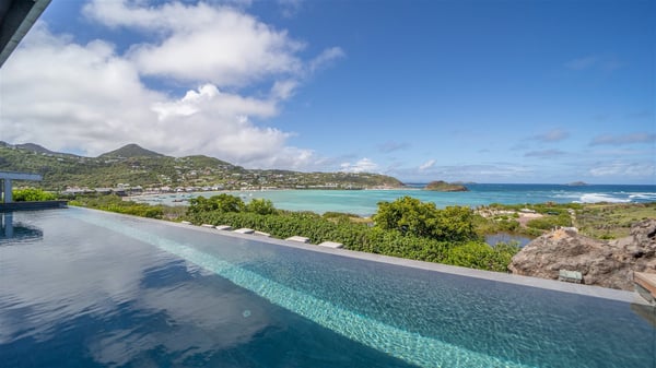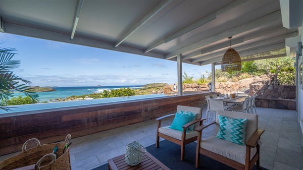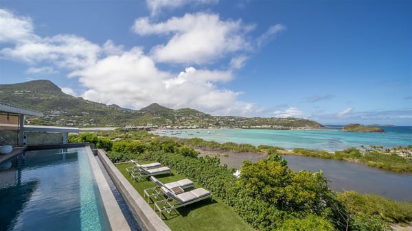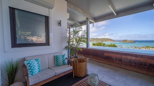The vacation rental villa YOLO is a beautiful property located in Grand-Cul-de-Sac in front of the crystal-clear waters of St. Barths. Spacious and luxurious, this three-bedroom holiday home offers a wide range of upscale amenities in a romantic and natural setting, the perfect place for a stay with family or friends in the Caribbean beauty. Villa YOLO in St-Barth is a contemporary-style holiday rental built over two levels in front of a breathtaking ocean view. Nestled on the hillside above the bay of Grand-Cul-de-Sac, this amazing property features beautiful indoor spaces, with a fully air-conditioned living room consisting of a lounge with comfy sofas, as well as an indoor dining room that can accommodate eight guests. The light-wood parquet floors are brightened by the strikingly white walls with fine hints of colors in a welcoming atmosphere, in front of the openings onto the terrace with swimming pool and the deep blue ocean. In a most relaxing ambience, villa YOLO is a daydream, restful place to stay. At the front, YOLO’s terrace features a splendid infinity swimming pool in front of the incredible lagoon below. A second outdoor dining area for eight guests as well as a garden lounge are located under the covered area which runs alongside the living room, for fantastic moments in the gentle trade winds. A fine lawn area is also set up with comfortable loungers for pleasant sunbathing sessions in St. Barths’ sun. You will love spending time watching the perfect horizon, in the heart of the natural St-Barths’ beauty. What’s more, hiking trails are available near the villa whenever you wish to explore the Caribbean wild beauty. The vacation rental villa YOLO in St. Barths consists of three air-conditioned bedrooms with en-suite bathrooms over two levels. Located on the main level, two of them open onto amazing ocean views that can be enjoyed from the bedrooms’ private terraces. The third one is on the lower level and opens onto a lovely, well-appointed terrace overlooking the tropical garden, in an idyllic vegetal atmosphere. Located close to the lagoon and its many water activities, the holiday rental villa YOLO is the perfect place for an unforgettable vacation in St. Barths.