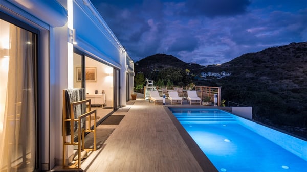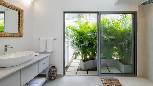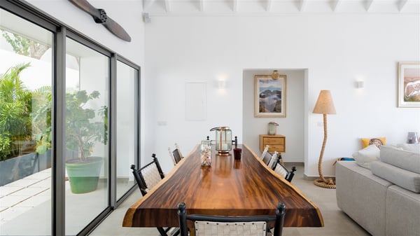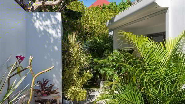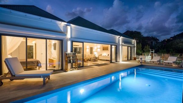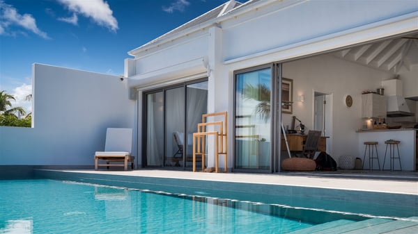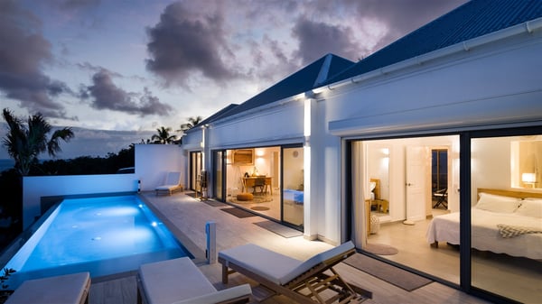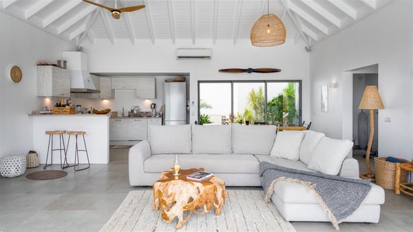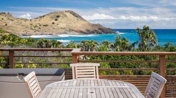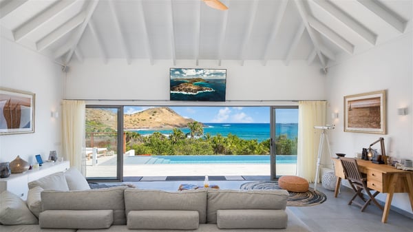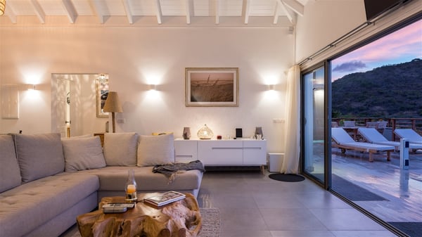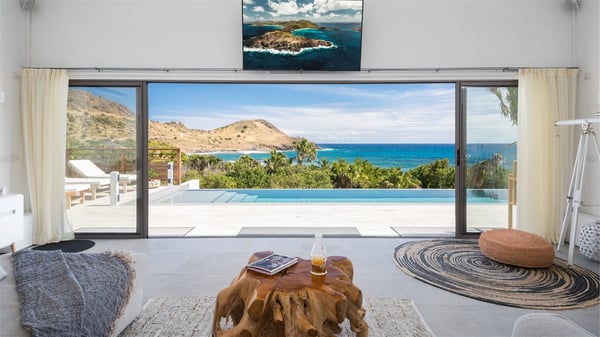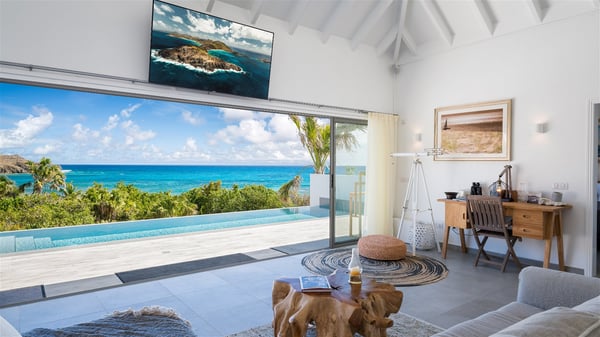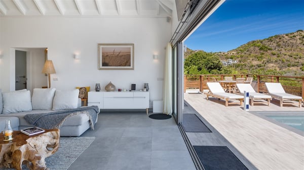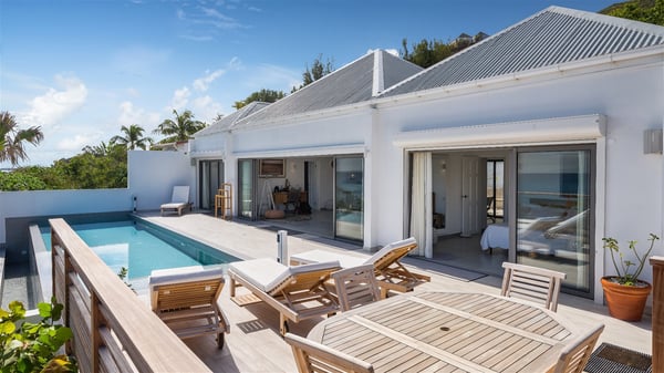 Villa Bella is a beautiful two-bedroom property ideally located in Toiny in front of an outstanding panoramic ocean view. In a heavenly setting nestled between sky and sea, Bella welcomes families or couples of friends in utmost luxury and comfort with bright and well-appointed spaces, for an unforgettable stay in St. Barths. Recently built, Villa Bella is a spacious property blown by the tropical glow of the Caribbean. Widely open onto the amazing ocean view, this vacation rental features a spacious lounge furnished with a comfy sofa under the white, vaulted ceiling. The soothing lights provide a cozy touch to this indoor space, in front of the breathtaking view over the sparkling waters of St. Barths. At the back of this comfortable living room, there is a well-equipped kitchen with a breakfast bar to cook delicious meals. Close to it, the dining room can accommodate up to six guests around a beautiful wooden table in front of a bay window that overlooks the back of the villa, planted with vegetation, in a soft poetic freshness swept by the gentle trade winds. At the front of Villa Bella, the long swimming pool welcomes guests on the sunny terrace in front of the fantastic view over the deep blue ocean. For pleasant relaxing sessions, there are loungers close to the pool and an exotic wood dining table for four people for al fresco dining in the mild tropical air. What’s more, an outdoor shower allows guests to cool off at any time, as well as the lovely outdoor area located at the back of villa Bella, where the shade and calm reign in a very private atmosphere. The vacation rental villa Bella consists of two bedrooms with en-suite bathrooms and king-size beds. Located on either side of the living room, they both offer a spectacular ocean view and open onto the furnished terrace. They feature soft colours, fine curtains and HDTVs for perfect relaxing after days resting by the pool, walking on Toiny beach or discovering the island's hidden treasures. In front of the breathtaking ocean view, Villa Bella is the perfect place for a four-people stay in the Caribbean.