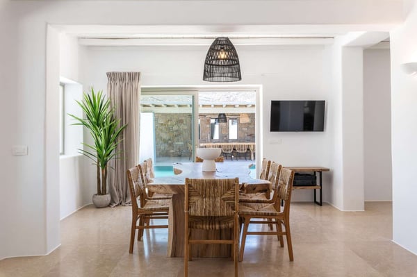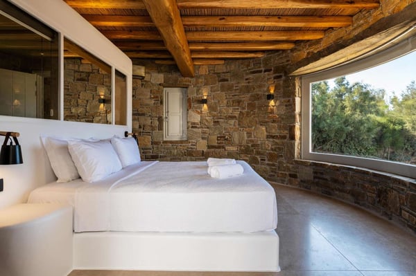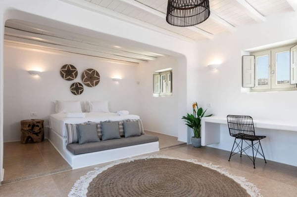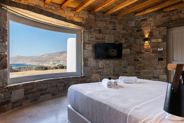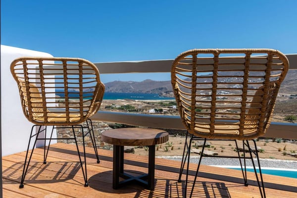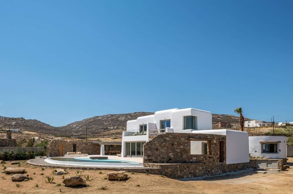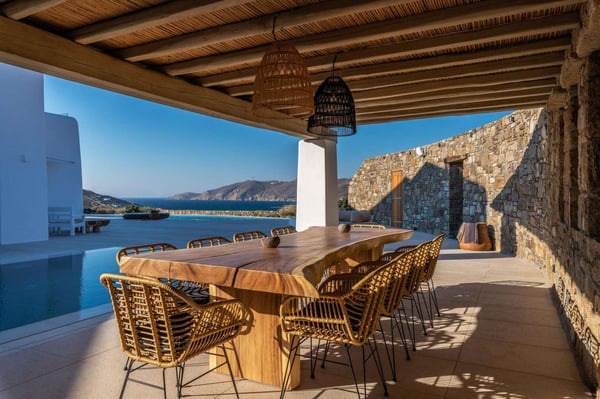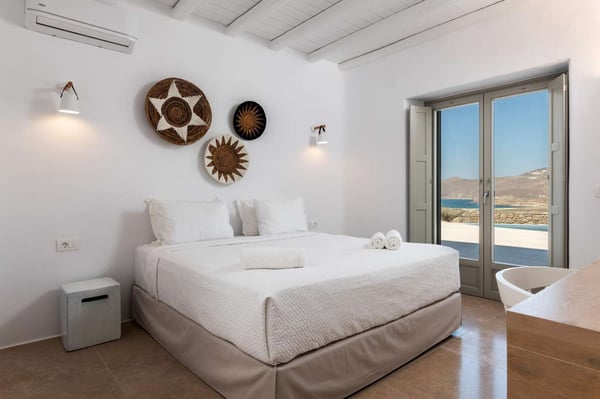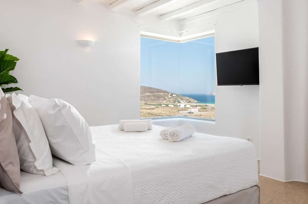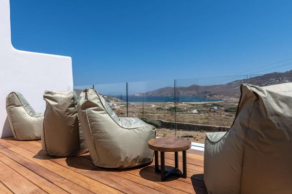 Villa Marylin is a brand-new villa, which was built in 2020. Located among fields above Ftelia Beach, a seven-minute drive from Mykonos town. The property extends on a plot of 1500m2 with an outstanding sea view of the northern Aegean Sea. Villa Marylin provides five en-suite bedrooms and can comfortably accommodate ten guests, divided into two sections. Property License Number 1102676