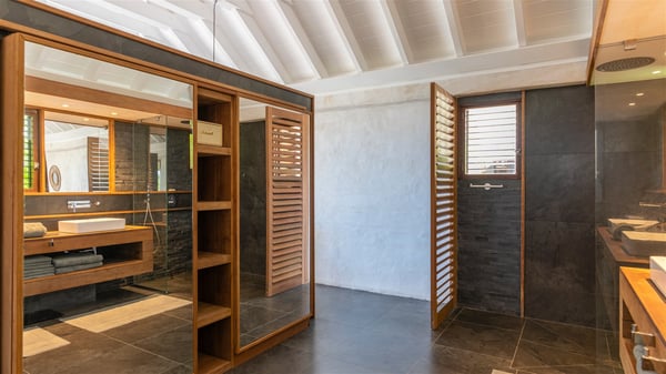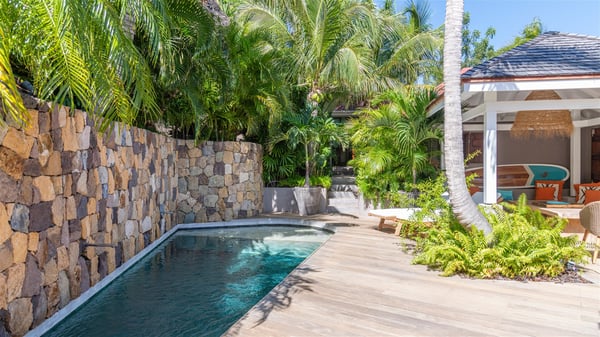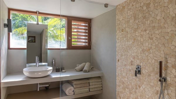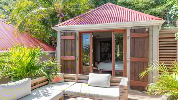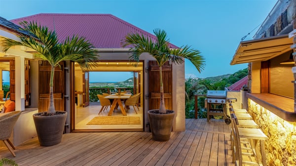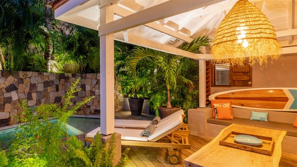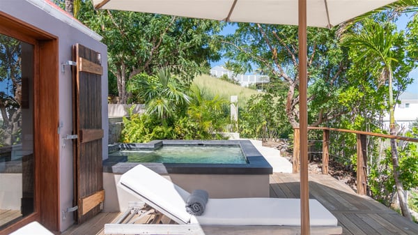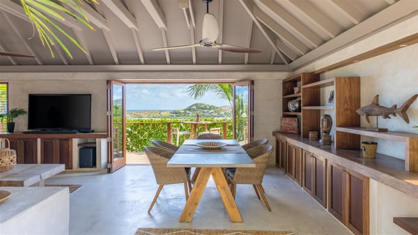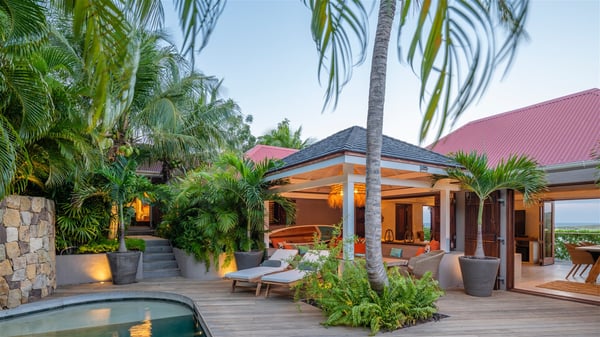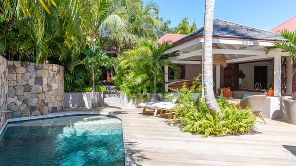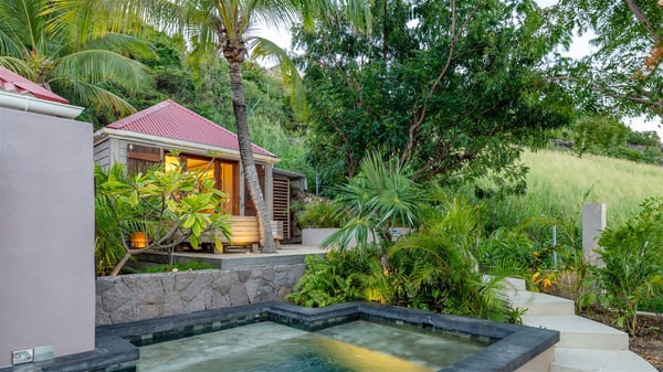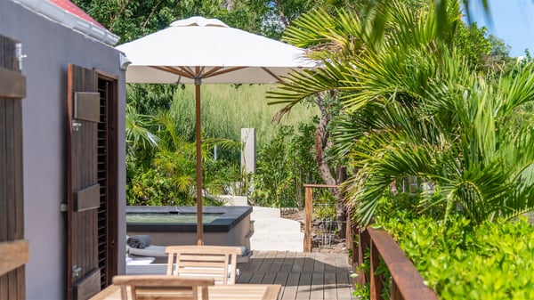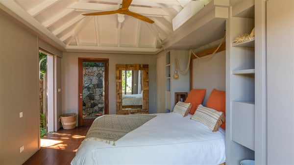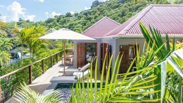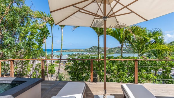 Villa Ti Rock is a beautiful Caribbean property with swimming pool and jacuzzi offering a breathtaking view over Grand-Cul-de-Sac lagoon. Nestled in the heart of St-Barths’ lush vegetation, this spacious vacation rental is the privileged place for an unforgettable six-people stay in St-Barths. Built over three bungalows, the rental villa Ti Rock faces the crystal-clear waters of Grand-Cul-de-Sac lagoon. It welcomes guests in its comfy living room featuring bright wood hints under a typical Caribbean vaulted ceiling. Widely open onto the terrace, the lounge is furnished with an elegant sofa and a coffee table. The dining room is located in the same open space and can accommodate guests around a wooden table and rattan armchairs. On the side of the main building, you’ll find an independent bungalow with a well-equipped kitchen, the perfect place to cook delicious meals to be enjoyed inside or outside. The decoration with wood and woven fibers creates a warm and comfortable atmosphere, in front of the beautiful panorama. Villa Ti Rock offers wide outdoor spaces to relax in the mild Caribbean air. At the front, two teak tables with chairs and stools face the amazing ocean view, overlooking the lush palm trees. In an idyllic scenery, the jacuzzi sparkles under the Caribbean sunlight. You’ll love the second terrace located at the back of the villa, with an al fresco dining room open onto the indoor living room and furnished with surf-style seating and orange and turquoise hints. This is the perfect place to relax close to the swimming pool nestled in this very private area, where time seems to stand still. The vacation rental villa Ti Rock consists of three air-conditioned bedrooms with en-suite bathrooms, one of which is outside. They are furnished with king size beds and offer beautiful views over the lagoon and the tropical vegetation. One of them is located in a separate bungalow, which can be accessed via a few steps. You will appreciate the quiet and soothing atmosphere of these very private bedrooms after days exploring St-Barths’ hidden treasures. Ideally located in Grand-Cul-de-Sac, the vacation rental villa Ti Rock is the perfect place for a six-person stay in St-Barths.