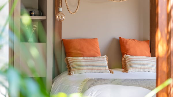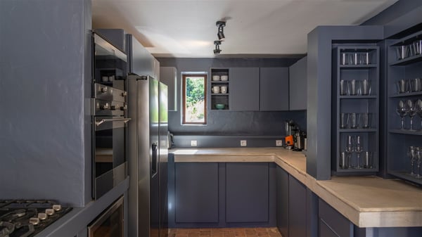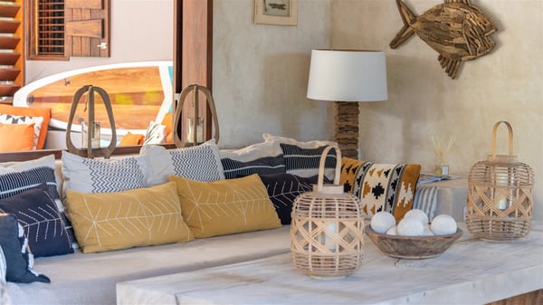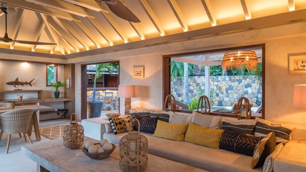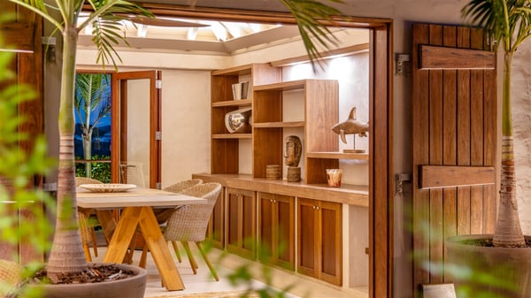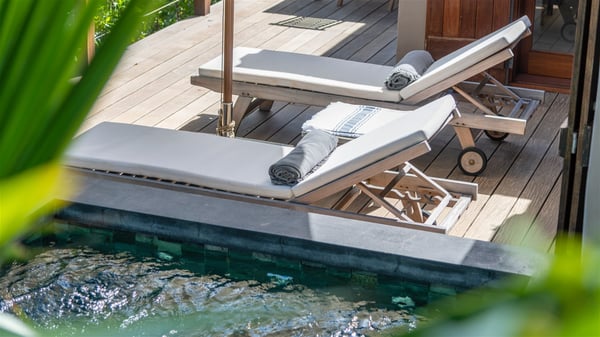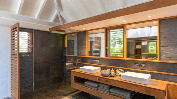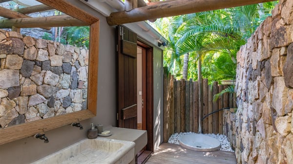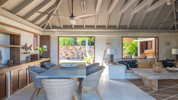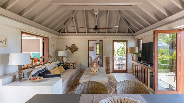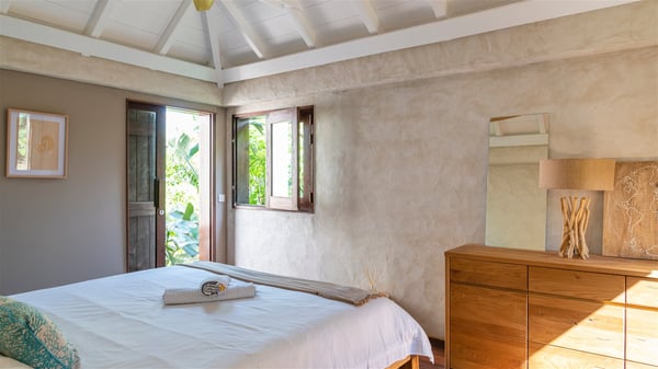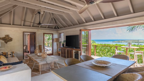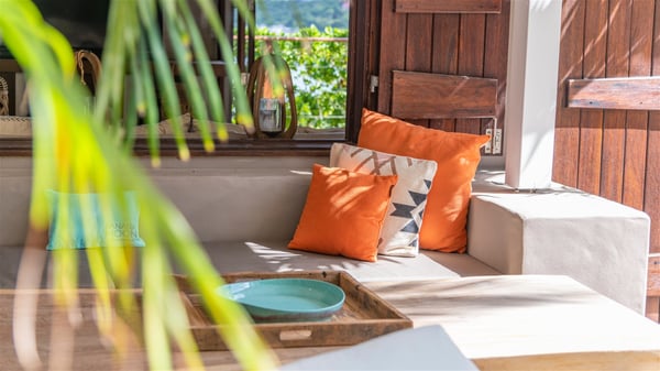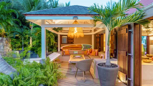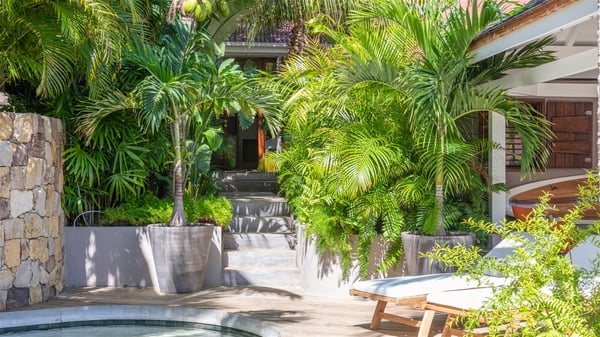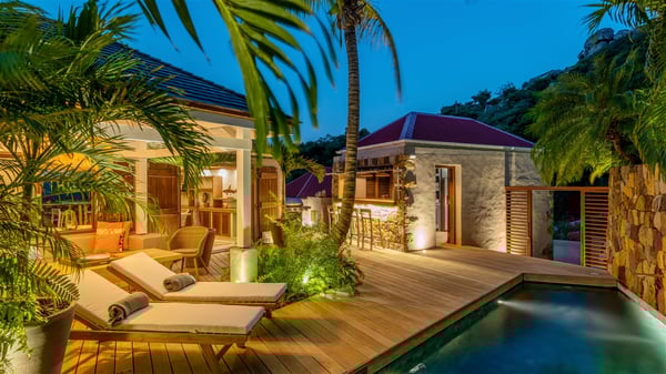 Villa Ti Rock is a beautiful Caribbean property with swimming pool and jacuzzi offering a breathtaking view over Grand-Cul-de-Sac lagoon. Nestled in the heart of St-Barths’ lush vegetation, this spacious vacation rental is the privileged place for an unforgettable six-people stay in St-Barths. Built over three bungalows, the rental villa Ti Rock faces the crystal-clear waters of Grand-Cul-de-Sac lagoon. It welcomes guests in its comfy living room featuring bright wood hints under a typical Caribbean vaulted ceiling. Widely open onto the terrace, the lounge is furnished with an elegant sofa and a coffee table. The dining room is located in the same open space and can accommodate guests around a wooden table and rattan armchairs. On the side of the main building, you’ll find an independent bungalow with a well-equipped kitchen, the perfect place to cook delicious meals to be enjoyed inside or outside. The decoration with wood and woven fibers creates a warm and comfortable atmosphere, in front of the beautiful panorama. Villa Ti Rock offers wide outdoor spaces to relax in the mild Caribbean air. At the front, two teak tables with chairs and stools face the amazing ocean view, overlooking the lush palm trees. In an idyllic scenery, the jacuzzi sparkles under the Caribbean sunlight. You’ll love the second terrace located at the back of the villa, with an al fresco dining room open onto the indoor living room and furnished with surf-style seating and orange and turquoise hints. This is the perfect place to relax close to the swimming pool nestled in this very private area, where time seems to stand still. The vacation rental villa Ti Rock consists of three air-conditioned bedrooms with en-suite bathrooms, one of which is outside. They are furnished with king size beds and offer beautiful views over the lagoon and the tropical vegetation. One of them is located in a separate bungalow, which can be accessed via a few steps. You will appreciate the quiet and soothing atmosphere of these very private bedrooms after days exploring St-Barths’ hidden treasures. Ideally located in Grand-Cul-de-Sac, the vacation rental villa Ti Rock is the perfect place for a six-person stay in St-Barths.