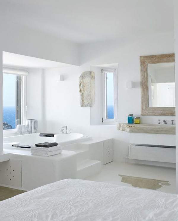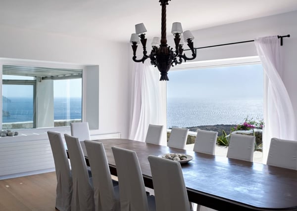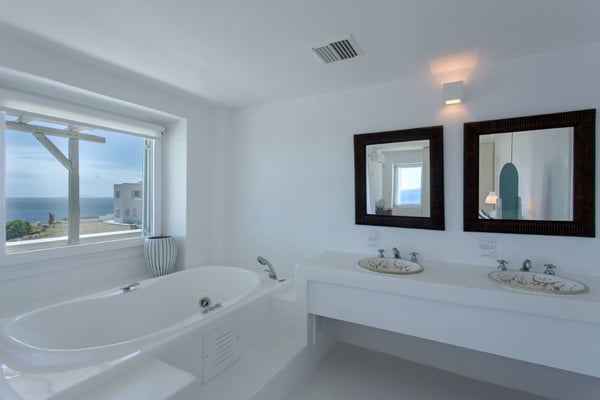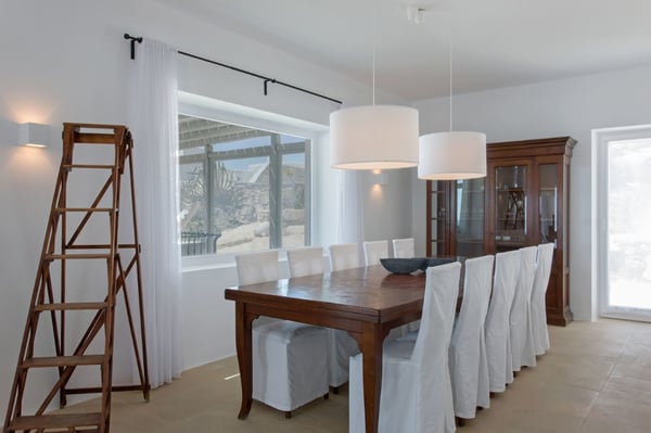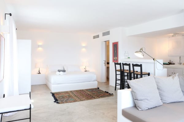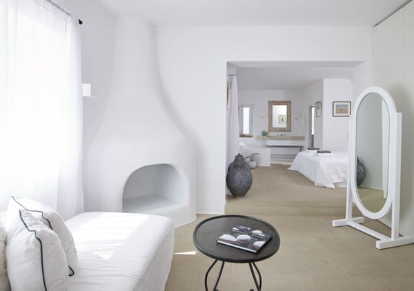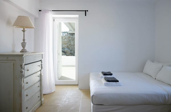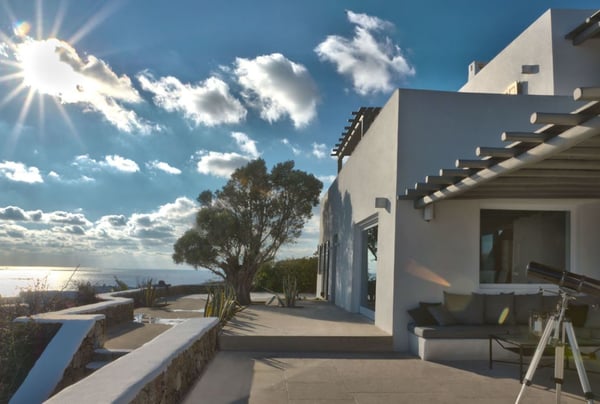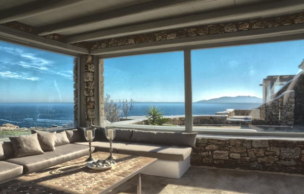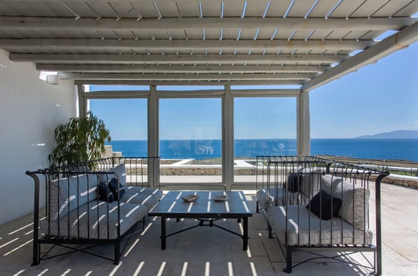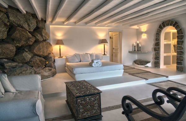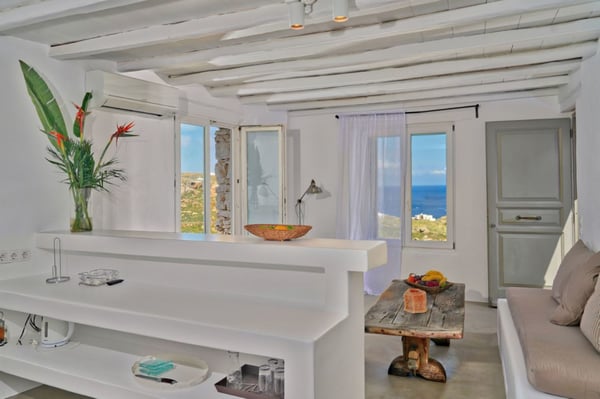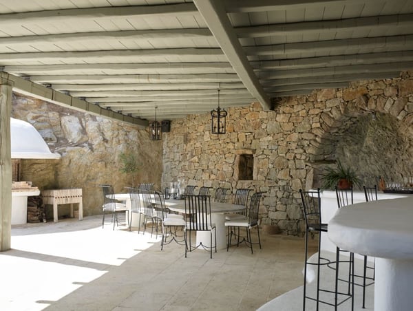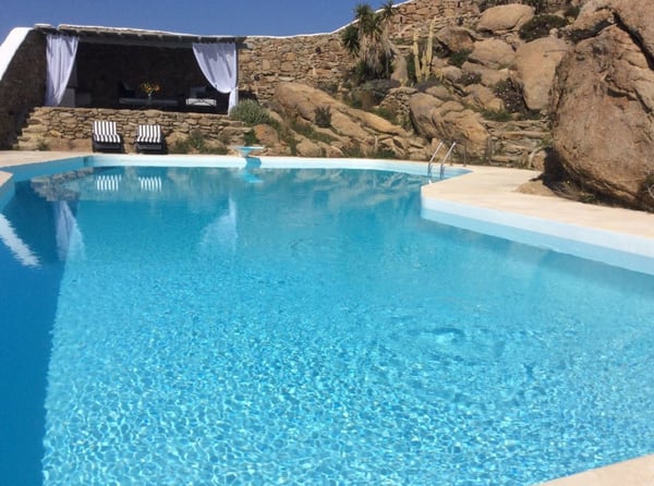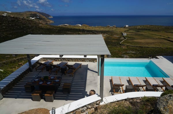 This majestic Mykonian estate is the ultimate private resort for a large group of people. With its vast luxurious common areas, its two separate villas and numerous independent guest houses, it can accommodate up to 30 guests and is an ideal venue for a family reunion, a special event, or a lavish company retreat. Ideally located to offer maximum privacy but also easy access to some famous beaches, this luxury compound is a gated domain with gorgeous panoramic views of the Aegean Sea, in the area of Pyrgi and very close to Super Paradise, on the island's southern coast. Designed in multiple levels and in traditional island architecture, it incorporates natural elements of the landscape and the earth and grows organically around it. The swimming pool melts into the rocks, brilliant white complements the stone, and exceptional details pay homage to tradition: a wood oven, a stone-paved terrace, a pergola, a little white chapel. The compound consists of two main buildings: a five-bedroom villa and an eight-bedroom villa; also it includes an additional unit with a private swimming pool and four separate guest houses with unique design and equally equipped with modern appliances. There are several common areas, indoor and outdoor, allowing for everyone to come together, or spend some private quality time enjoying the stunning views if they so choose: the estate features three swimming pools (one per unit) with sun beds, day beds, dining areas, lounges, seating areas, terraces, a BBQ area and outdoor bar. The compound also includes a helipad, a charming chapel overlooking the sea and a stand-alone professional kitchen facility.