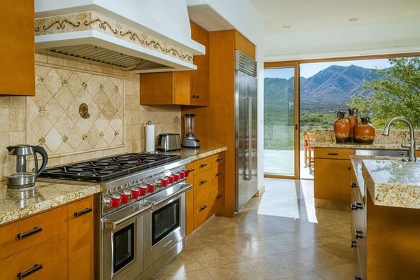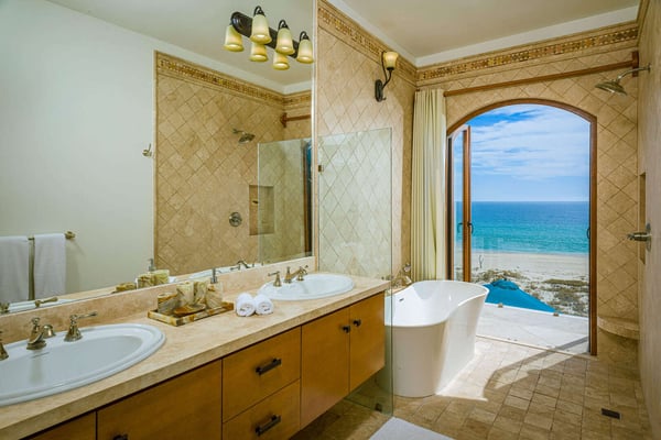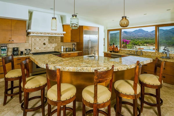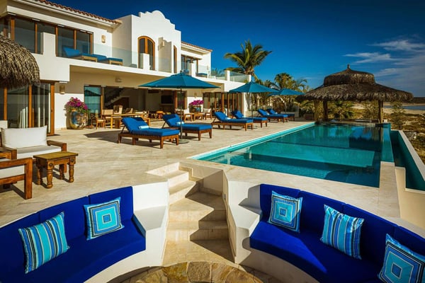 Casa Cabo Pulmo is a stunning 5200 square foot home on the sand of beautiful Frailes Bay five min south of Cabo Pulmo; safe ocean swimming in 70 to 85F water is available year-round and surfing is nearby. Each oceanfront bedroom is of equal size but unique, with bath and shower en-suite, pocket doors on two walls in each bedroom, double sinks, walk-in closets, and travertine floors. The beachfront deck features six custom lounges, a 45' infinity pool, swim-up bar, sunken Palapa Bar with refrigerator, ice maker, mesquite bar stools, and granite countertops; a ten-person heated jacuzzi, deck shower, fire pit, and outdoor granite kitchen with wood-fired St. Maria-style grill and Wolf gas BBQ with rotisserie enhance the outdoor living; A parota wood outdoor dining table, chairs, and benches seat ten with additional seating as required. Air conditioning is available but rarely needed as there is always a breeze, good ventilation, and a deck in the sun or the shade as you prefer. The indoor kitchen is fully equipped with dishes, pots, pans, and silverware and includes a 42" Sub-Zero refrigerator/freezer, an eight burner Wolf range, double ovens, wine storage, separate island prep station with sink, microwave drawer, and island seating for six. The dishwasher is built into a second island with a large sink overlooking the mountains to the west. The dining room is finished with glass cabinets and a massive hand-carved table and chairs comfortably seating ten. The dining room windows open 30' wide to the pool deck allowing the outdoors to come in and join you for dinner. Carved onyx lighting indoors and out completes a warm and elegant atmosphere that is relaxing and enchanting; memories made here last forever.