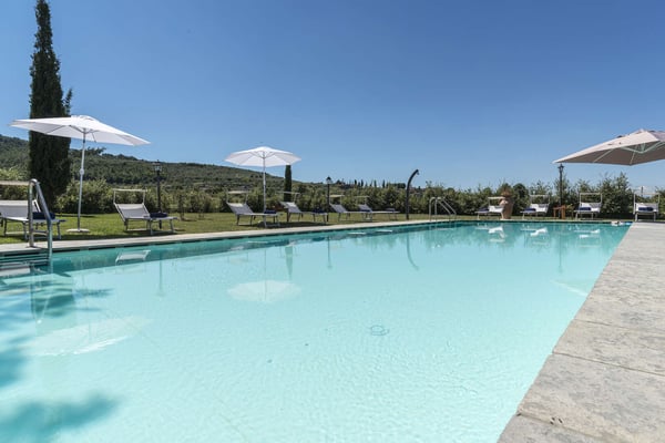 Villa Ivana is a 17th-century frescoed Italian Villa located at the foot of the Etruscan town of Cortona, not far from “Villa Bramasole” where the movie “Under the Tuscan Sun” was filmed. Villa Ivana is a historic residence dating back to 1600, it has become, thanks to recent restoration, a prestigious Italian villa in which modern accessories blend with original recycled materials and local architectural features conferring warmth and a typical Tuscan atmosphere to the rooms. Antique furniture, precious tapestries, elegant windows and doors, original chandeliers and accessories, painted ceilings and splendid terracotta-tiled floors dress the more than 1000 Square Meters of the villa. The ground floor is dominated by an imposing living room with decorated vaulted ceilings and frescoed walls, with an antique billiards table. On the upper floors are the 9 intimate, panoramic bedrooms characterized by romantic four-poster beds and served by splendid cozy bathrooms in inlaid marble. Thanks to its large indoor and outdoor spaces, Villa Ivana is a perfect location for your Tuscan vacation as well as for the organization of cultural events, a reunion of groups and families and for destination weddings (being equipped with a private chapel) and other ceremonies, to spend in a prestigious and enchanting setting. The completely fenced-in park that surrounds Villa Ivana covers a flat area of about 7000 Square Meters, most of which is planted with grass with a large variety of centuries-old plants and trees, pots of lemon trees around the villa and a lush row of oleander bushes that border the paved drive leading to the main entrance. The large gazebo surmounted by stone columns located a few steps from the big swimming pool and from the many entrances to the villa, is furnished with marble tables and chairs for relaxing and dining al fresco, with the complicity of the silent garden embellished by the gentle setting of the Tuscan hills. At the entrance to the property, just after the main gate and the tree-lined access drive, is a large parking area. CIN: IT051017B5WIKXTPTK