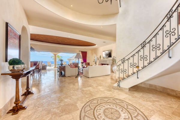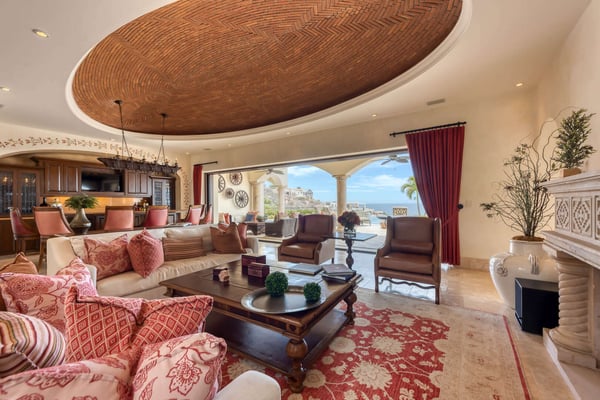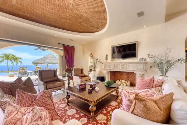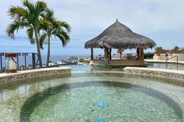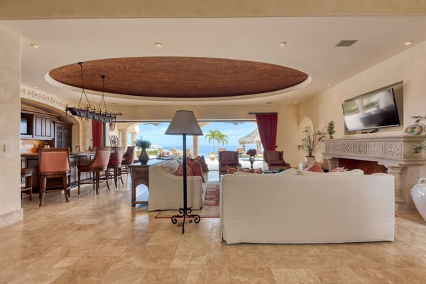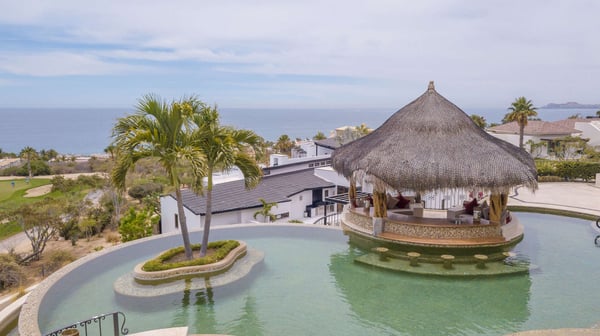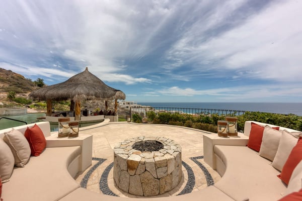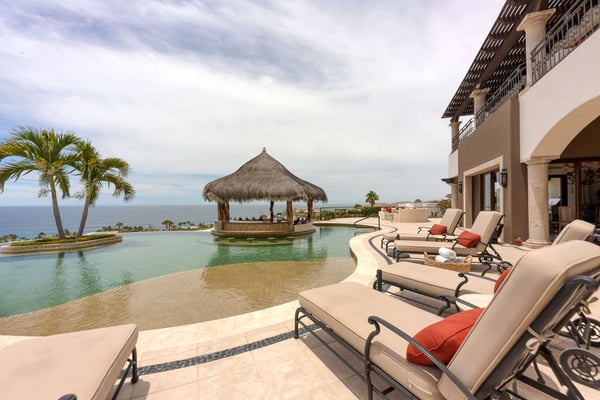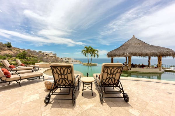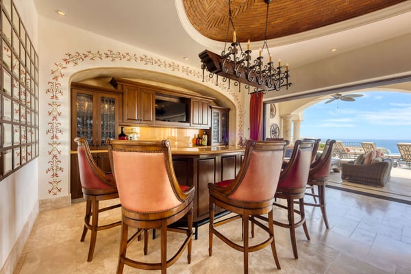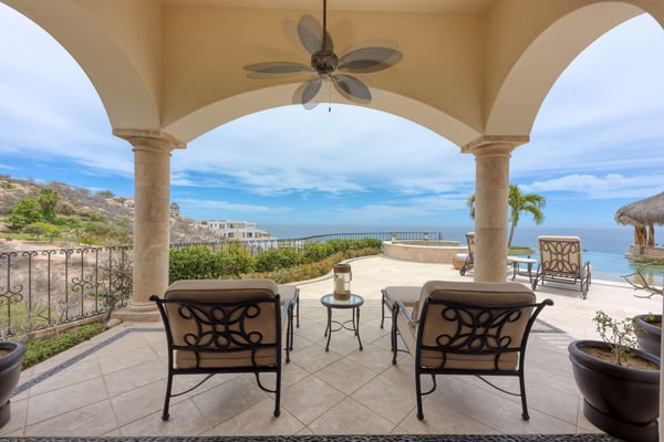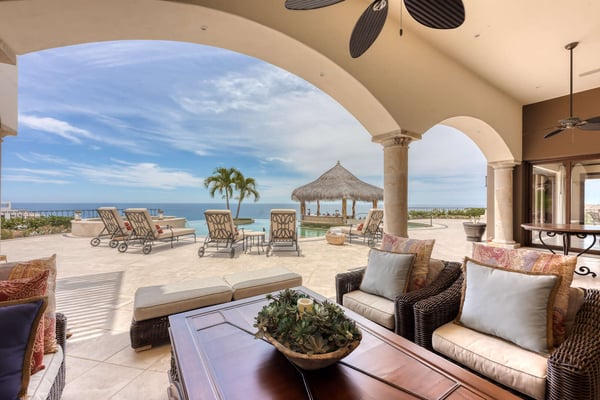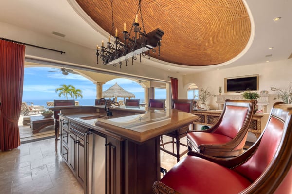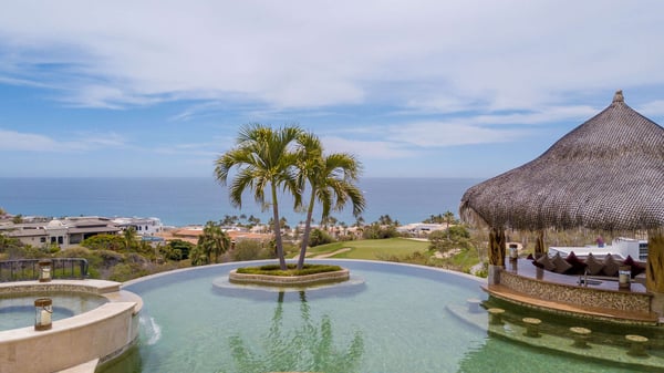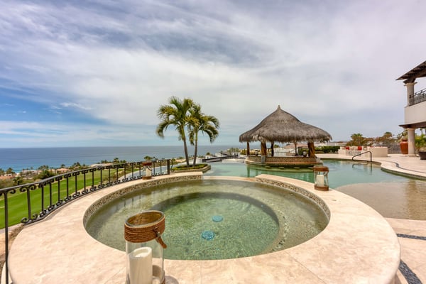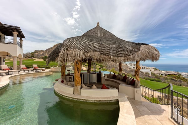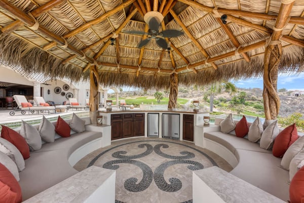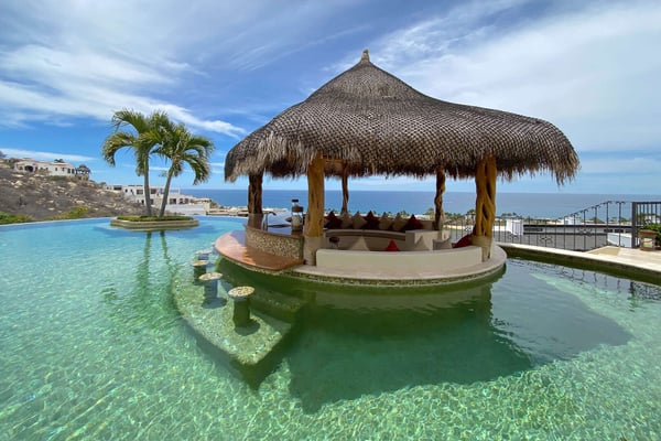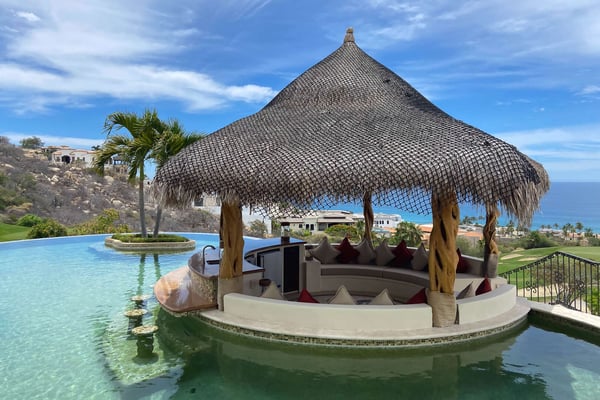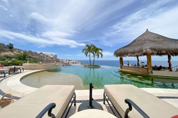 Much like your own personal resort within a resort, this opulent vacation villa capitalizes on sensational views and abundant private luxuries. From the lavish outdoor space to the sumptuous indoor space, this upscale villa in Puerto Los Cabos delivers the ultimate vacation experience for visitors to Los Cabos. Perched on the hillside overlooking the ocean in gated Fundadores, up to twelve guests gain access to an array of upscale experiences from the comfort of this six-bedroom, seven-bath home. Seemingly like an extension of its elevated surroundings, the villa overlooks panoramic views of the ocean and beyond. At the center of the private outdoor space is a resort-like, infinity swimming pool, which features a thatched palapa sheltering a swim-up bar and lounge space. Spend your afternoons and evenings here soaking up the views, complemented by palm trees that extend directly from the pool's own "private island". The space also adds a jacuzzi tub and six poolside deck loungers, as well as a nearby firepit with circular seating. White arches and columns frame the covered portion of the pool deck, complete with an outdoor living room, a barbecue, and a dining table overlooking ocean views. Pass through massive glass doors to the ground floor of the home, complete with a richly appointed living room surrounding a fireplace and flatscreen TV, along with a bar area with additional seating. The space further expands to add a dining table for ten and a gourmet kitchen with rich wood cabinetry, as well as an island with more counter seating. Take the home's private elevator or the winding staircase to the second level, where many of the six bedrooms and ensuite baths open to partially shaded terrace seating and elevated ocean views. Back outside, terraced desert landscaping descends from the pool deck down the hill, as the rest of the Fundadores comes into view, including the private Club Fundadores, featuring swimming, fitness, dining, and spa services. The rental includes almost daily maid service and a location that's close to many of the personal delights and luxuries of a resort lifestyle in Puerto Los Cabos.