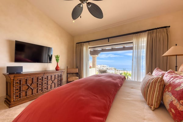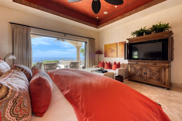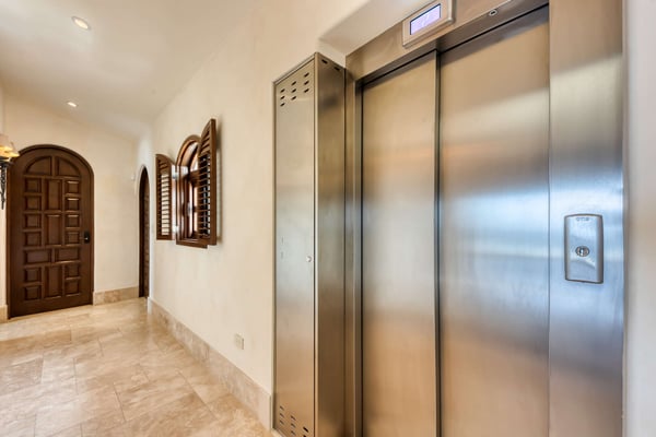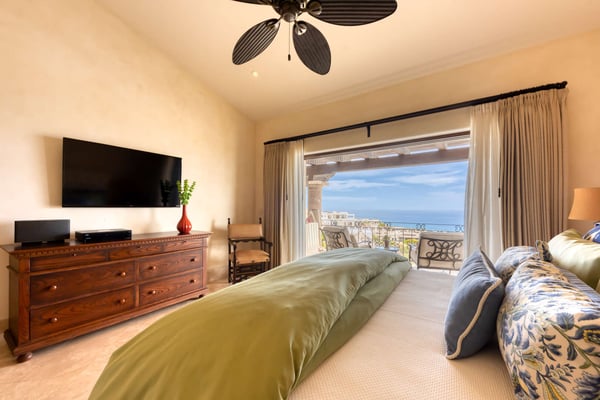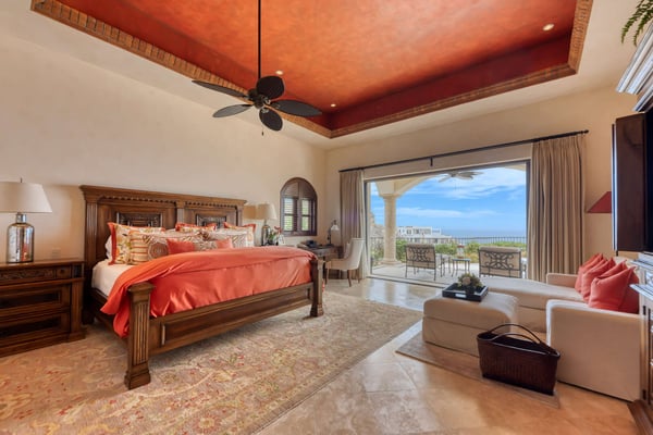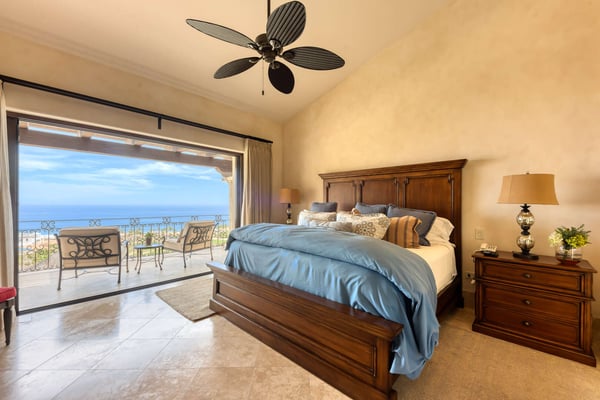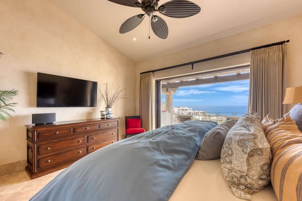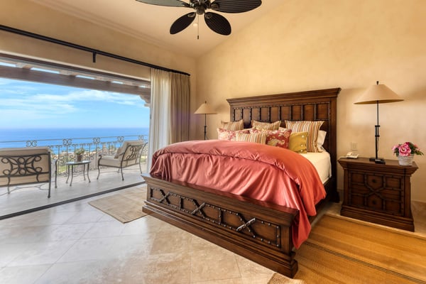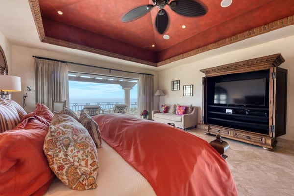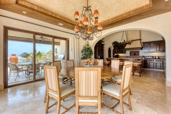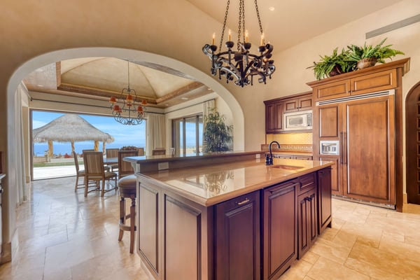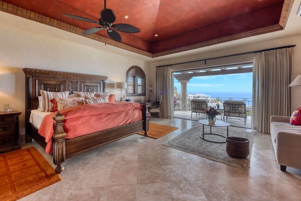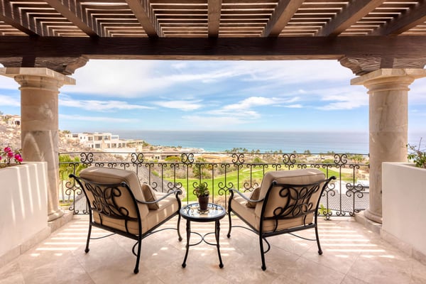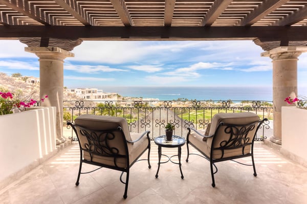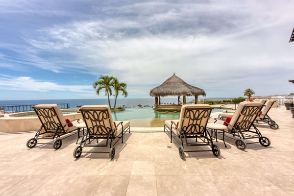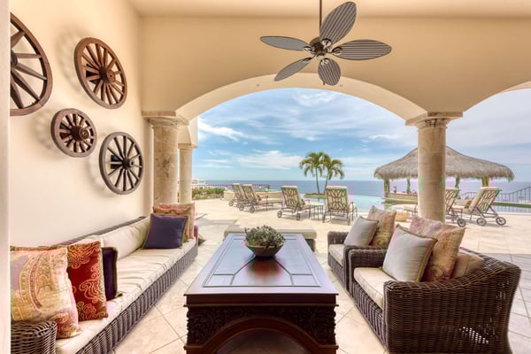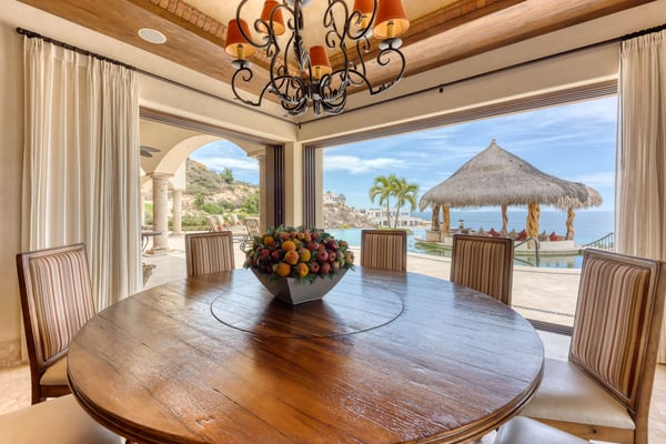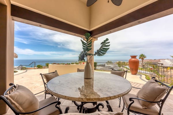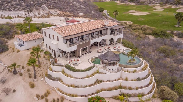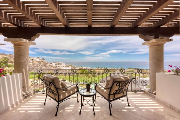 Much like your own personal resort within a resort, this opulent vacation villa capitalizes on sensational views and abundant private luxuries. From the lavish outdoor space to the sumptuous indoor space, this upscale villa in Puerto Los Cabos delivers the ultimate vacation experience for visitors to Los Cabos. Perched on the hillside overlooking the ocean in gated Fundadores, up to twelve guests gain access to an array of upscale experiences from the comfort of this six-bedroom, seven-bath home. Seemingly like an extension of its elevated surroundings, the villa overlooks panoramic views of the ocean and beyond. At the center of the private outdoor space is a resort-like, infinity swimming pool, which features a thatched palapa sheltering a swim-up bar and lounge space. Spend your afternoons and evenings here soaking up the views, complemented by palm trees that extend directly from the pool's own "private island". The space also adds a jacuzzi tub and six poolside deck loungers, as well as a nearby firepit with circular seating. White arches and columns frame the covered portion of the pool deck, complete with an outdoor living room, a barbecue, and a dining table overlooking ocean views. Pass through massive glass doors to the ground floor of the home, complete with a richly appointed living room surrounding a fireplace and flatscreen TV, along with a bar area with additional seating. The space further expands to add a dining table for ten and a gourmet kitchen with rich wood cabinetry, as well as an island with more counter seating. Take the home's private elevator or the winding staircase to the second level, where many of the six bedrooms and ensuite baths open to partially shaded terrace seating and elevated ocean views. Back outside, terraced desert landscaping descends from the pool deck down the hill, as the rest of the Fundadores comes into view, including the private Club Fundadores, featuring swimming, fitness, dining, and spa services. The rental includes almost daily maid service and a location that's close to many of the personal delights and luxuries of a resort lifestyle in Puerto Los Cabos.