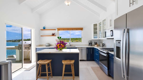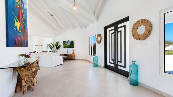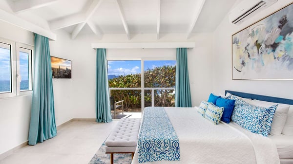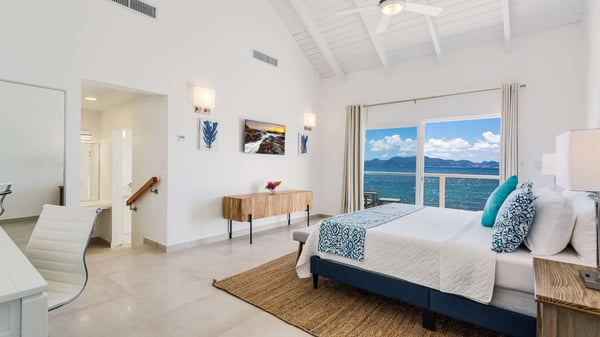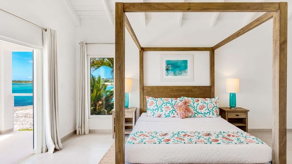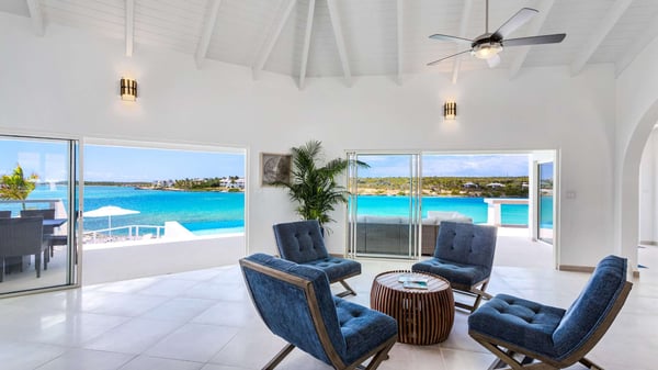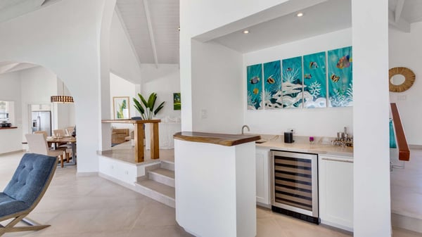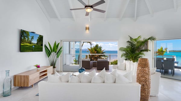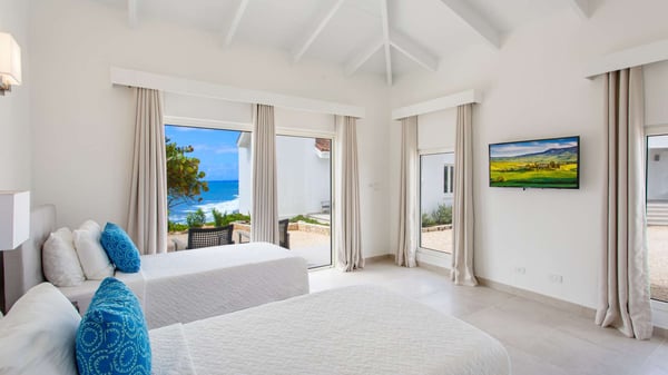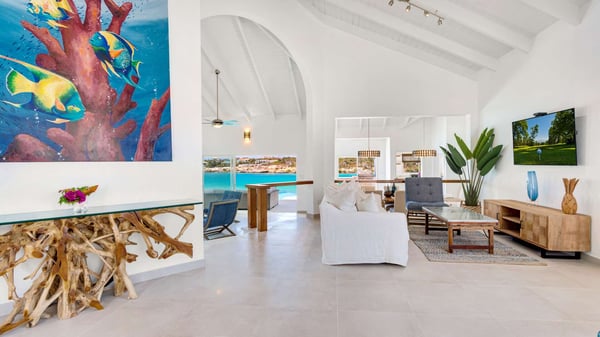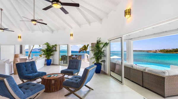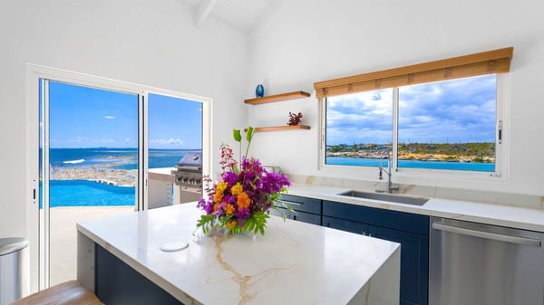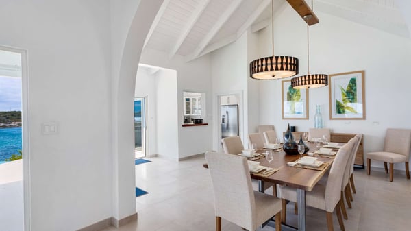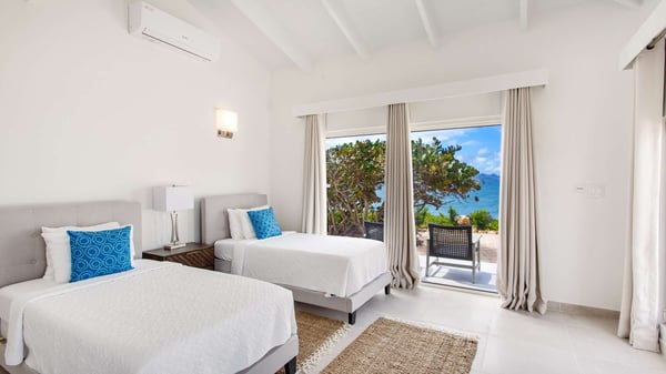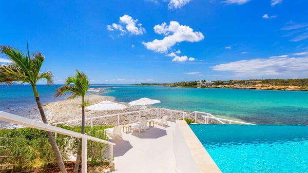 Villa Angel Point is a luxurious five-bedroom retreat on Anguilla's tranquil Caribbean coast. Completely renovated in 2023, this contemporary villa in Anguilla offers breathtaking views of St. Martin from its sun-soaked terraces, furnished with comfortable loungers and sofas surrounding the private pool. The poolside area is an oasis of relaxation with covered seating, a barbecue grill, and ample space to unwind. For the adventurous, kayaks and paddleboards are available to explore the nearby Little Harbor beach, just a short paddle away. The villa seamlessly blends indoor and outdoor living with floor-to-ceiling sliding doors that invite the refreshing ocean breeze. The spacious common area features two living rooms, perfect for entertaining, and a modern kitchen equipped with high-end appliances. Guests can enjoy meals at the custom wooden dining table or al fresco on the harbor terrace. The villa comprises two separate houses, each with three generously sized bedrooms. Conveniently located in Little Harbour, Angel Point is just minutes from the ferry port, airport, adjacent villas such as Indigo Villa, and island attractions like golf and tennis. It’s the ideal escape for those seeking tranquility and luxury in a stunning Caribbean setting. Angel Point is divided into two parts, the main house and the bungalow. This increases your privacy and expands its capabilities.