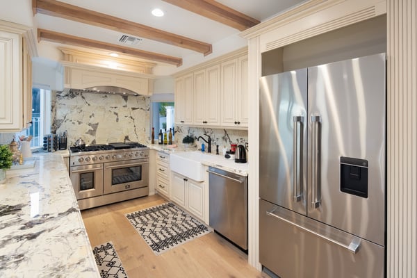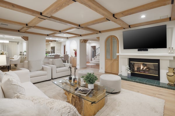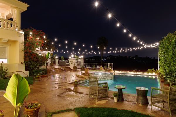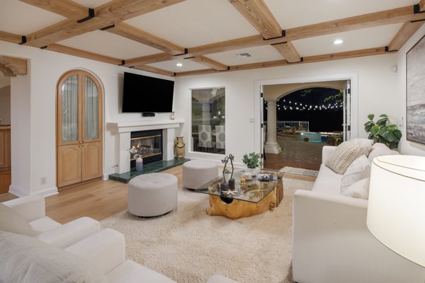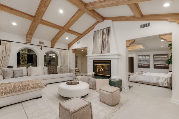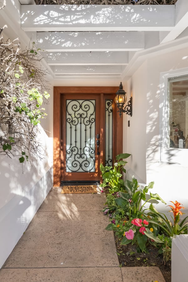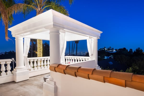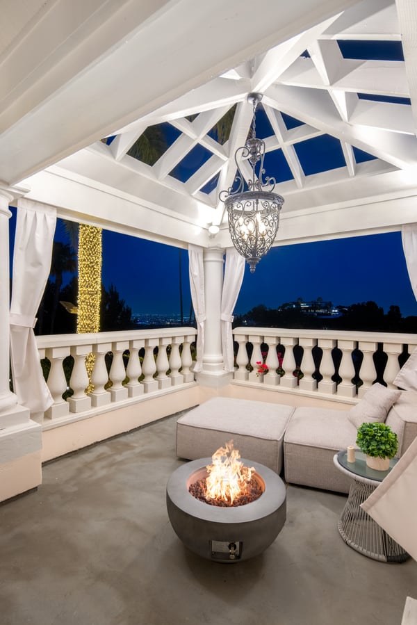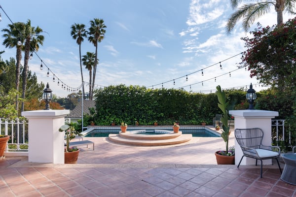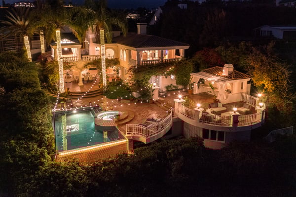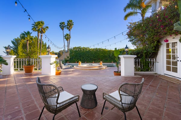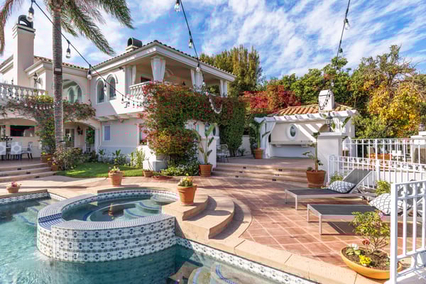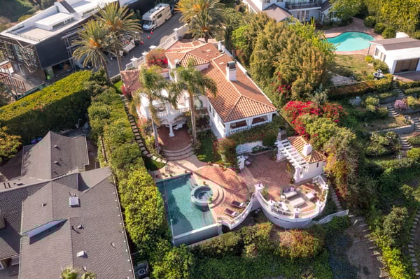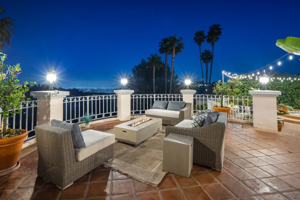 This spacious, gated contemporary Mediterranean estate is perfectly situated on prime lower Stradella Rd, taking advantage of the bucolic canyon, city, and ocean views. Sun-lit rooms with wood floors, French doors, and beams. A dramatic two-story beamed-ceiling stairwell with an adjacent service bar affords seamless entertainment flow. The entire upstairs of the home contains the grand owner's retreat featuring a large vaulted-ceiling sitting room, dual-sided fireplace, luxuriously large bathroom, and two romantic view terraces. The resort-style yard includes extensive patios, BBQ station, infinity-edge pool, spa, cabana with bathroom, and stunning views. Large storage room under the rear patio. Important Note: Please be aware that cellular reception in the area may vary depending on your provider. To ensure a seamless experience, we recommend downloading Google Maps offline before your arrival. By saving the area in advance, you can easily navigate and access directions even without cellular service or Wi-Fi. This will help you get around with ease during your stay. Please Note: No Garage Access HSR25-000809