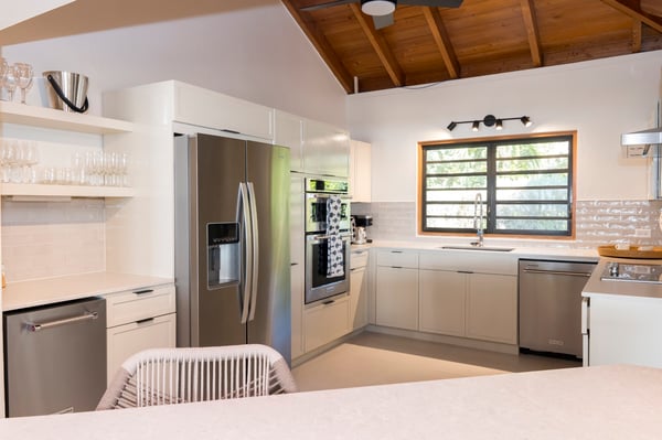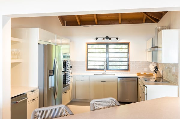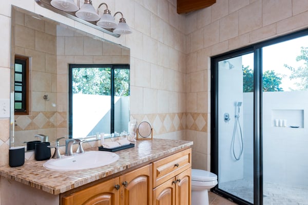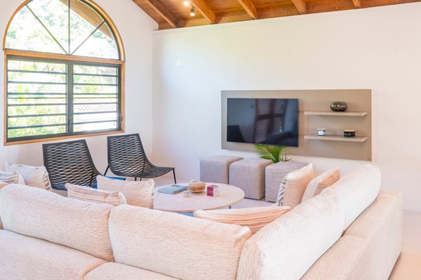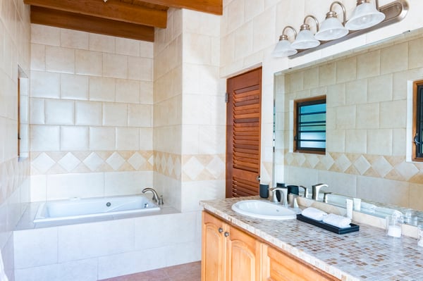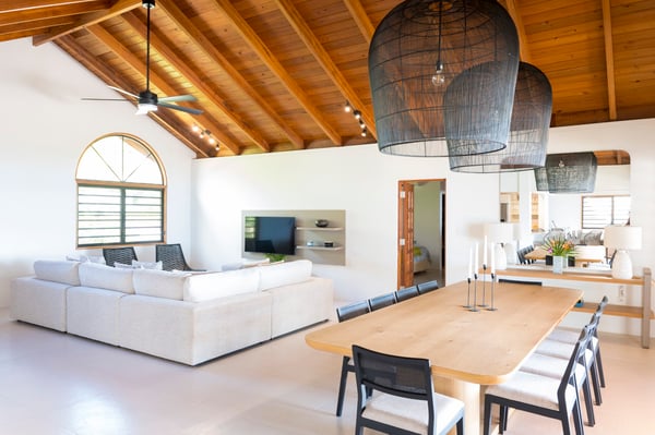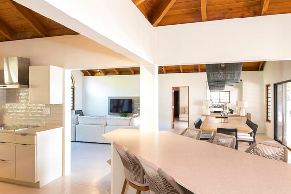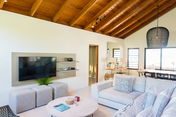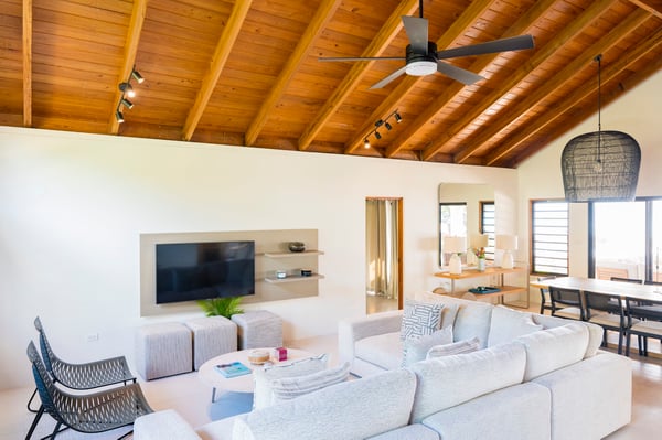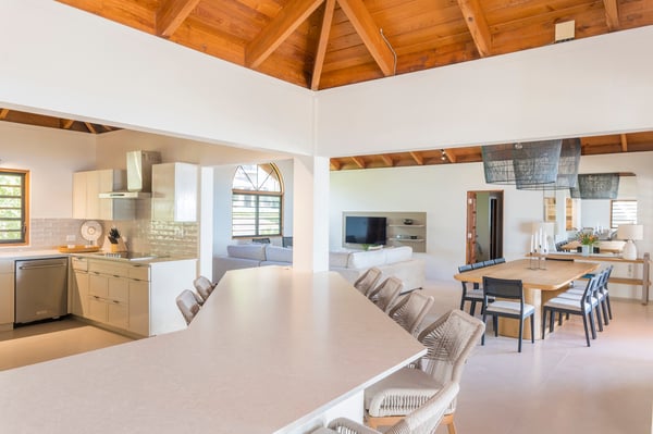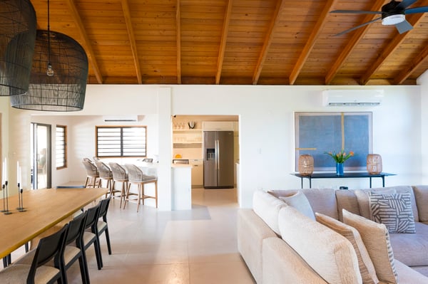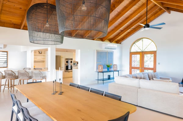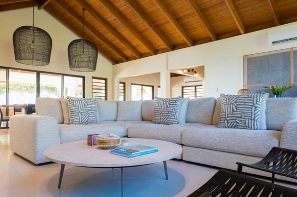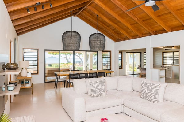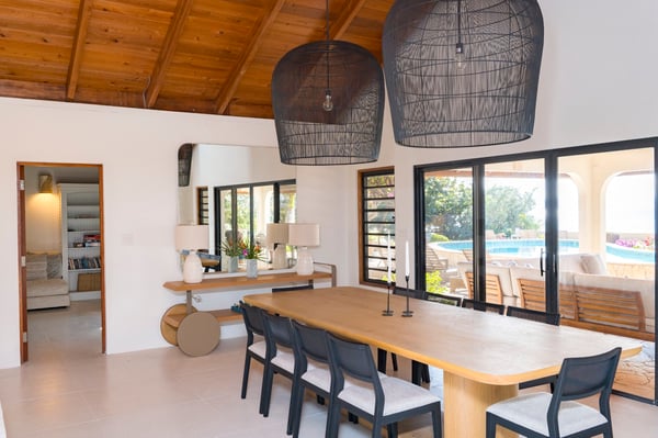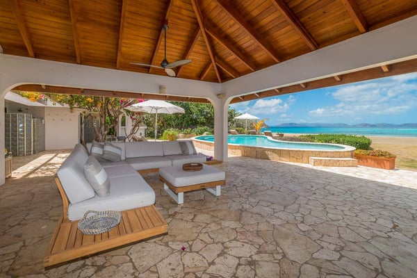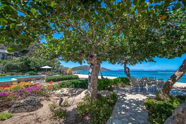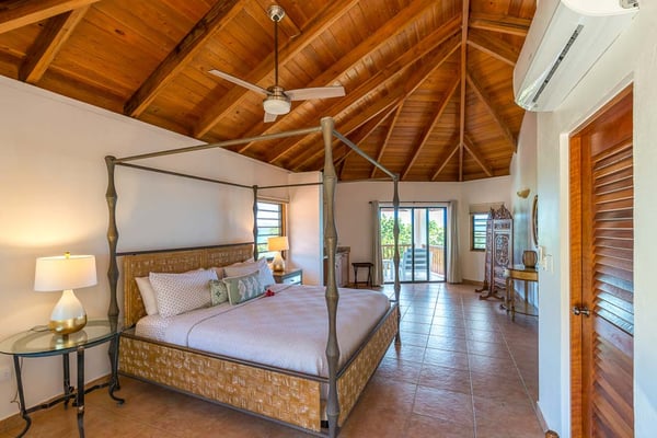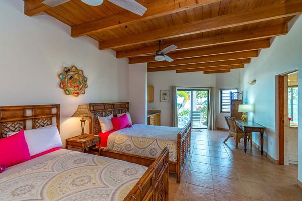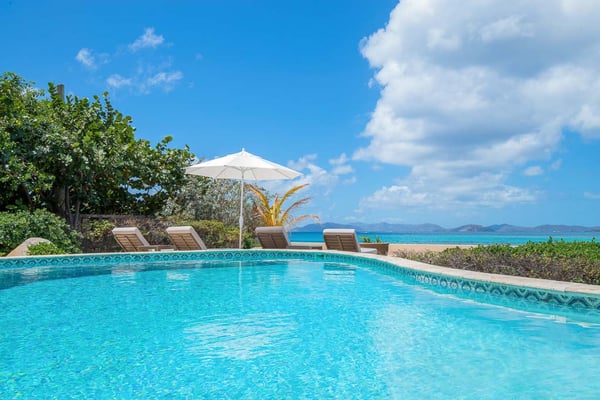 Guests of Sea Palms villa are greeted by a paradise-like setting. The main house features a bright and airy great room with multiple areas for sitting and entertaining. The space has cool tile floors and high, wood-beam ceilings with fans throughout and includes a separate formal dining room and a large, fully-stocked kitchen. Sea Palms provides four spacious bedrooms, each with indoor/outdoor showers and direct access to the patio and manicured grounds. Two are in the main house, including a grand master with an ensuite bathroom and soaking tub on one side and a suite with two queen beds on the other. Two additional bedrooms are in the attached cabana, offering ultimate comfort and privacy for all guests. With elegant outdoor dining, lounging, and reading areas, hammocks nestled under the trees, and a beautiful tropical garden, Sea Palms is a blissful oasis just steps from the sand. Relax in the crystal blue pool, layout in the sun, enjoy the refreshing sea breeze and dreamy views of Mango Bay, and glorious sunsets at the end of the day. A private path takes you right onto the beach, where you will find an outdoor shower to rinse off after playing on the beach and in the water.
