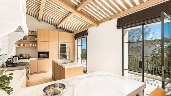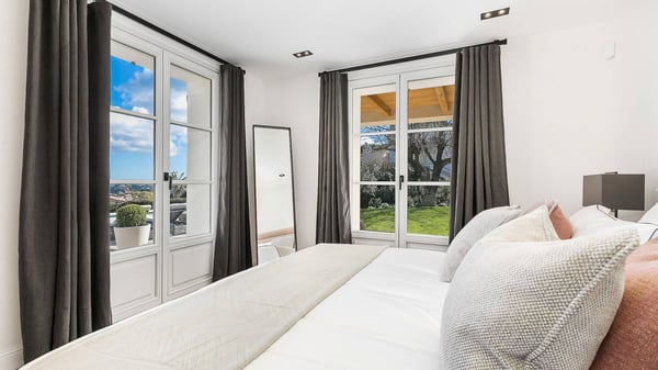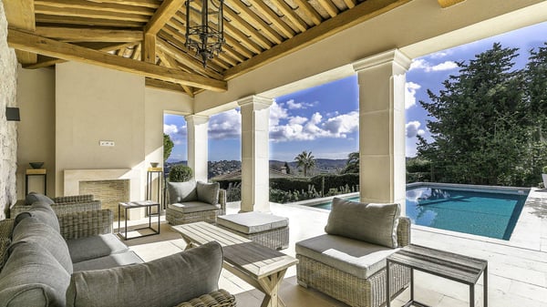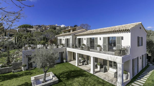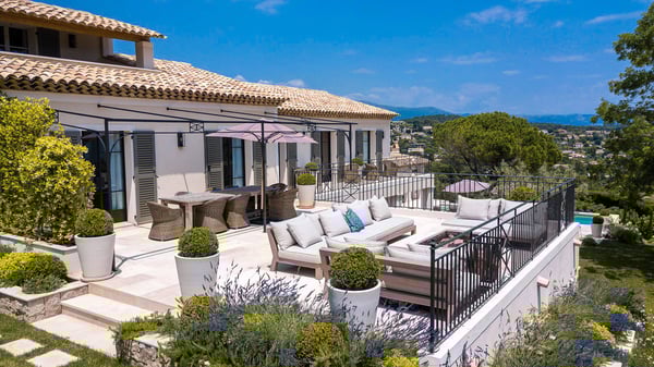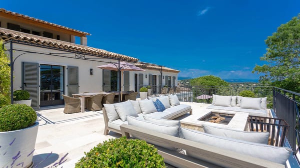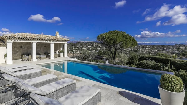 Located only a 3-minute walk to the town centre of Mougins, this Magnificent luxury Villa has been perfectly renovated between modernity and Provençale inspiration. South facing and nested just a step from the old village of Mougins, this haven of peace offers five bedrooms, each with ensuite bathroom, a magnificent fully equipped kitchen with bar, opening onto a spacious living room with a central fireplace, a wine cellar with testing room, nice terraces on each level to enjoy the exceptional panoramic views over the mountains, the bay of Cannes and the Lérins Islands.