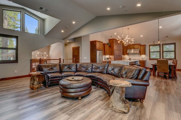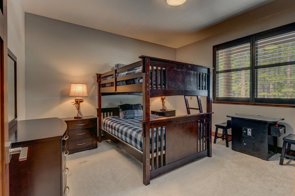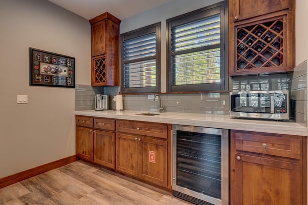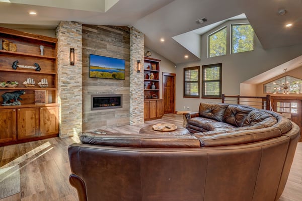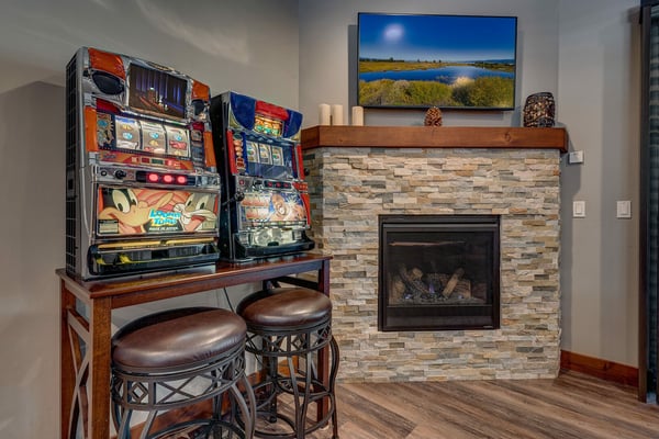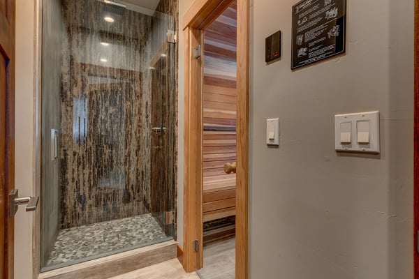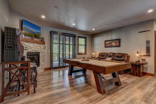 Newly built in 2018, this home certainly makes a statement! The owners have thought of everything, outfitting the entire home with contemporary furnishings and numerous high-end amenities. Upon entering the front door, you’ll begin to notice the details in every direction you look. Walk up a few stairs to reveal the open floor plan with kitchen, dining, and living room all within view. Vaulted ceilings and large windows afford vast views of the surrounding unobstructed forest. Gather the group around the large flat-screen television hung above the gas fireplace for movie night or head downstairs to try your luck at one of the many games in the epic game room. Warning all chefs – you’ll never want to leave this property. The owner has outfitted the entire kitchen with chef-grade Thermador appliances, including a 6-burner stove with a built-in griddle. An oversized refrigerator and freezer, slide-out microwave, and pantry full of small appliances to ensure you’re ready to prepare just about anything. The kitchen is anchored by a dining room table fit for a king and his court, with sweeping views of the surrounding forest. A large deck complete with a gourmet gas grill can be found just off the living room. Head downstairs to find a large pool table, a fireplace with a television above, and a couple of classic slot machines. Did we mention the beverage cooler and plenty of counter space for snacks? An adjoining deck plays host to a little seating area and a covered spa. Again, expansive views of the tall pine trees surround you. Head further down the hall to find the large cedar sauna with an adjoining shower stall. When it's time to retire for the evening, you’ll have five bedrooms to choose from, including a pretty epic primary suite with a king bed, a fireplace, and a connecting master bath that appears as if it belongs in a spa. Three other bedrooms with nearby baths host king & queen beds, another bedroom with a full over full bunk bed, perfect for the little ones in the group.