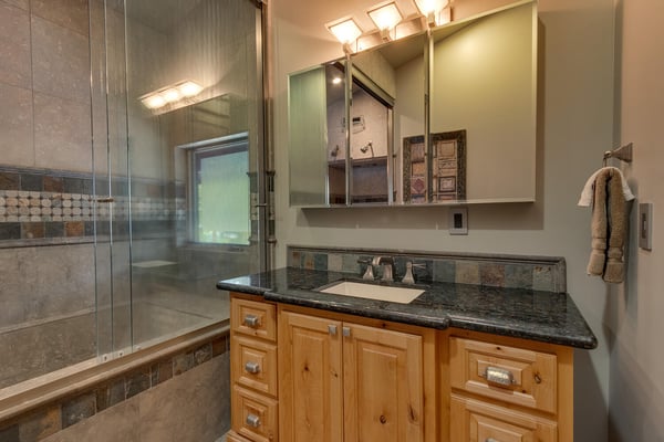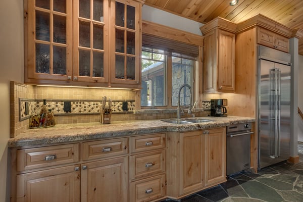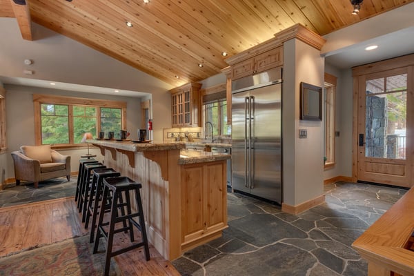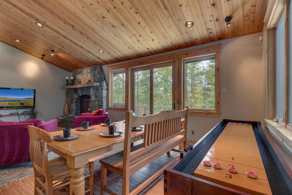 It’ll be difficult to take your eyes off the surrounding mountains and tall pine views just outside the front door. Enter into the main living area, and you’ll notice a cozy sofa seating surrounding the large stacked stone fireplace just waiting for movie and game nights. The adjacent gourmet kitchen is ready for the chef in the family with high-end stainless steel appliances and tons of counter space. If your guests go missing, there’s a good chance they are downstairs settling the score on either the foosball table or the classic upright arcade. There is also a 9’ shuffleboard table, so you’ll never be bored! After the winner is crowned, head out to the lower deck for a dip in the spacious outdoor hot tub. When you’re ready to call it a night, you’ll have eight bedrooms to choose from, including dual master bedrooms complete with a sitting nook, queen bed and mounted flatscreen television. Five additional queen bedrooms await across the three floors. The game room has the option to become the eighth bedroom with its foldout full futon.