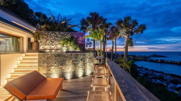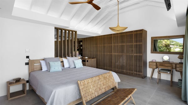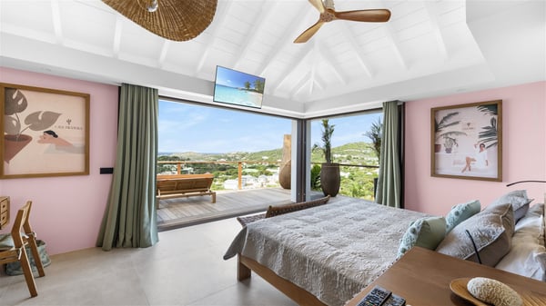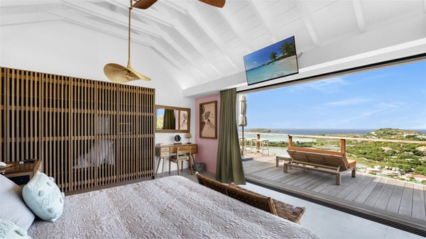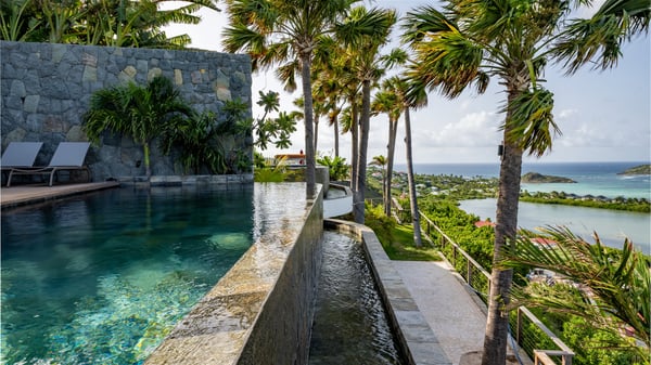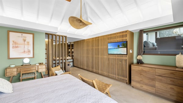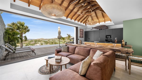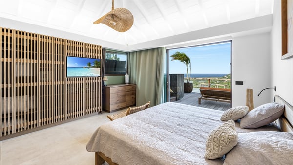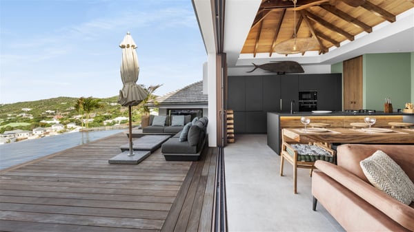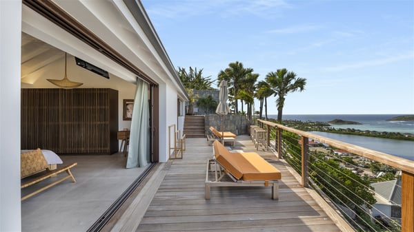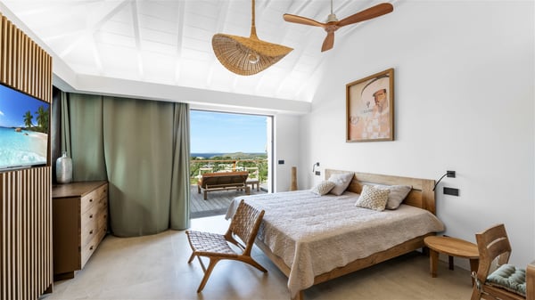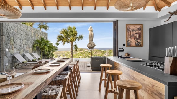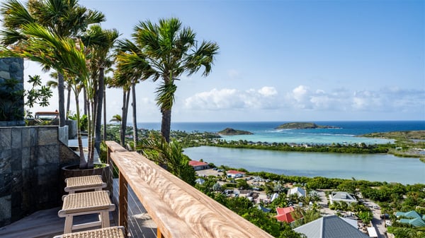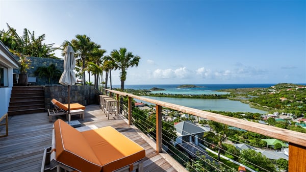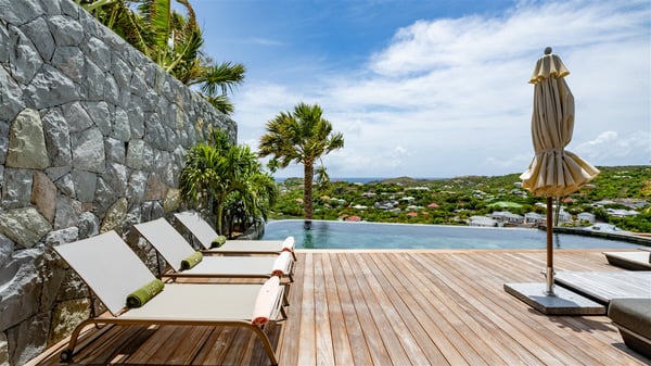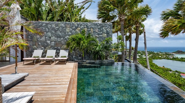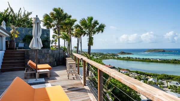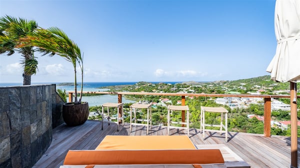 The vacation rental villa rental Takamaka is a superb two-bedroom property ideally located in Grand-Cul-de-Sac, overlooking the breathtaking ocean view. Facing the sparkling ocean in a privileged environment, this vacation home with a heated swimming pool welcomes groups of friends and families in utmost luxury, for an unforgettable stay in St-Barths. Built over two levels, villa Takamaka offers wide and spacious spaces gently blown by the trade winds, in front of the crystal-clear waters of Grand-Cul-de-Sac lagoon. The air-conditioned living room can be accessed through an exterior staircase and opens onto the terrace with a swimming pool. Bright and lovely, it welcomes guests into a soothing, cozy atmosphere, with a comfortable sofa and mocha-coloured cushions under the high, vaulted ceiling with exposed beams. Close to this lovely part of the room, you'll find the dining area with a long table and lined-up chairs, next to the fully-equipped kitchen. The soft Caribbean light makes this indoor area a truly paradisiac one, as the mild island breeze comes in. At the front of Villa Takamaka, the terrace offers a fantastic view over the crystal-clear lagoon and the deep blue ocean. On the lounge side, the lovely heated infinity swimming pool sparkles under the Caribbean sun, next to the tall palm trees, in a tropical ambience you’ll love experiencing. You’ll also enjoy the fine deckchairs and the outdoor lounge facing the view, sipping a cocktail and marvelling at the beauty of nature. In this dreamy setting, take time to relax and watch the beauty of the island of St-Barths, under the shade of the white parasols in utmost quiet luxury. The vacation rental villa Takamaka consists of two air-conditioned bedrooms with en suite bathrooms. Both are on the lower level, accessible via a few outside steps on the side of the terrace. They are furnished with large beds and feature HDTVs, and they open onto a long terrace with breathtaking ocean views and large, comfortable deckchairs in a very private atmosphere, the best place to relax after beautiful days exploring the island. In the heart of the tropical beauty, the villa rental Takamaka is the dream location for a vacation with family or friends in St-Barths.