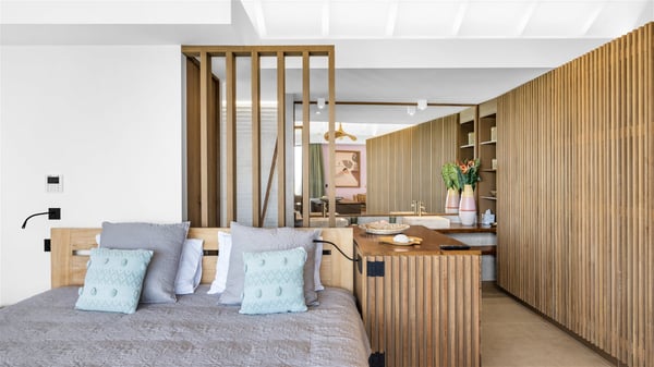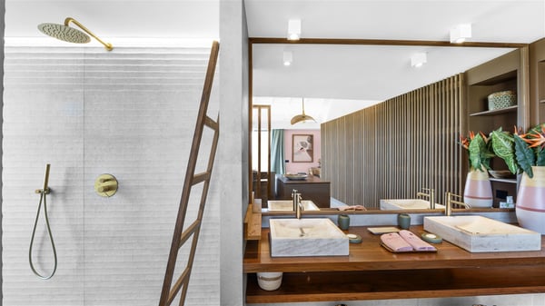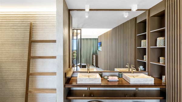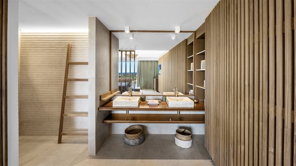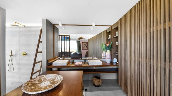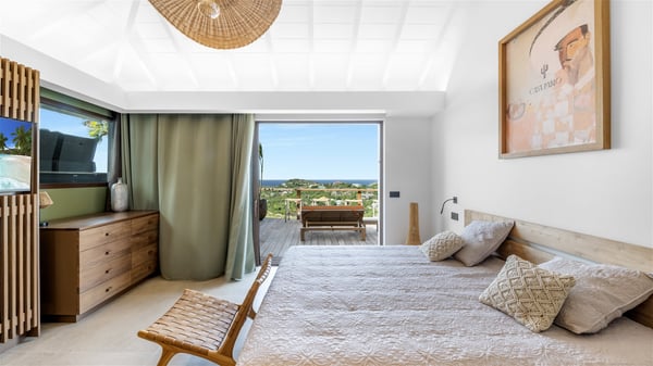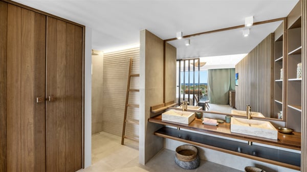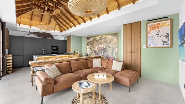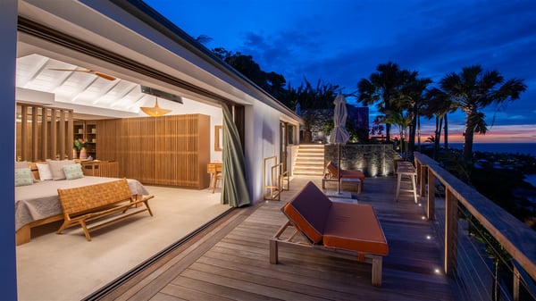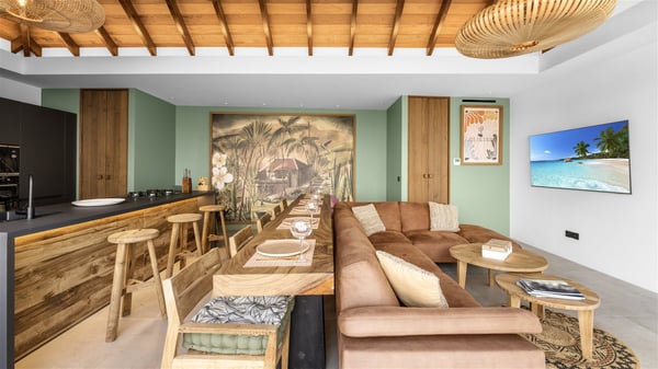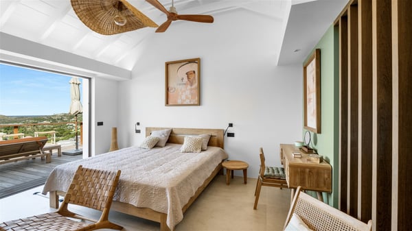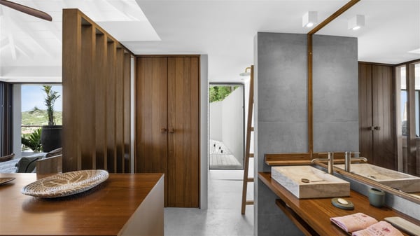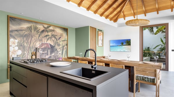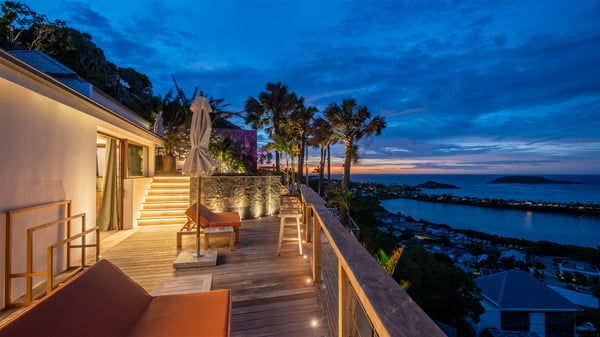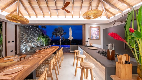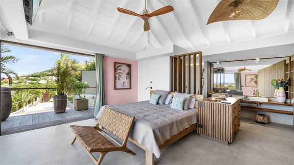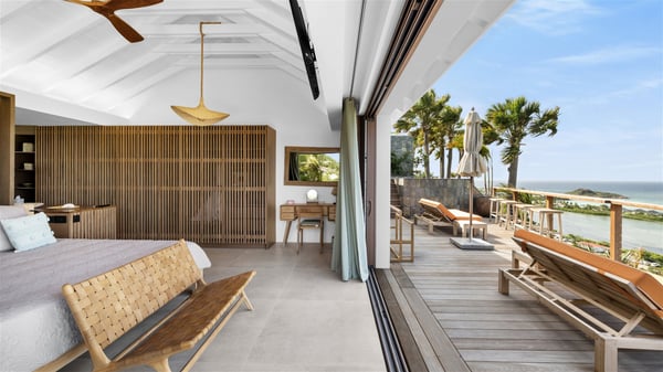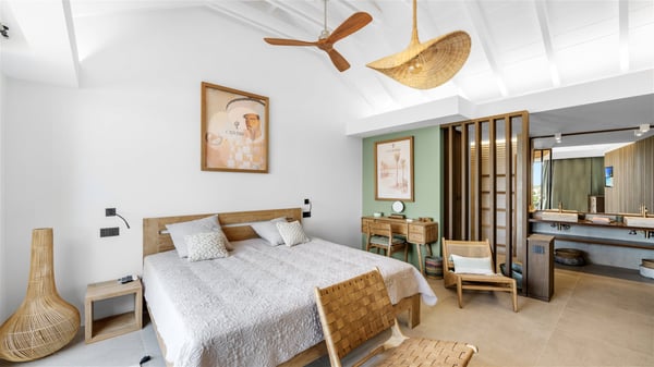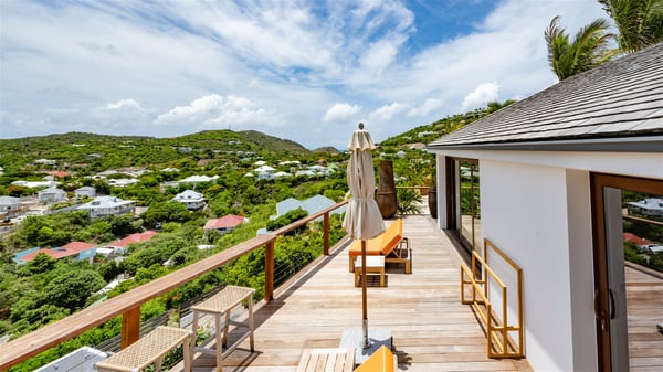 The vacation rental villa rental Takamaka is a superb two-bedroom property ideally located in Grand-Cul-de-Sac, overlooking the breathtaking ocean view. Facing the sparkling ocean in a privileged environment, this vacation home with a heated swimming pool welcomes groups of friends and families in utmost luxury, for an unforgettable stay in St-Barths. Built over two levels, villa Takamaka offers wide and spacious spaces gently blown by the trade winds, in front of the crystal-clear waters of Grand-Cul-de-Sac lagoon. The air-conditioned living room can be accessed through an exterior staircase and opens onto the terrace with a swimming pool. Bright and lovely, it welcomes guests into a soothing, cozy atmosphere, with a comfortable sofa and mocha-coloured cushions under the high, vaulted ceiling with exposed beams. Close to this lovely part of the room, you'll find the dining area with a long table and lined-up chairs, next to the fully-equipped kitchen. The soft Caribbean light makes this indoor area a truly paradisiac one, as the mild island breeze comes in. At the front of Villa Takamaka, the terrace offers a fantastic view over the crystal-clear lagoon and the deep blue ocean. On the lounge side, the lovely heated infinity swimming pool sparkles under the Caribbean sun, next to the tall palm trees, in a tropical ambience you’ll love experiencing. You’ll also enjoy the fine deckchairs and the outdoor lounge facing the view, sipping a cocktail and marvelling at the beauty of nature. In this dreamy setting, take time to relax and watch the beauty of the island of St-Barths, under the shade of the white parasols in utmost quiet luxury. The vacation rental villa Takamaka consists of two air-conditioned bedrooms with en suite bathrooms. Both are on the lower level, accessible via a few outside steps on the side of the terrace. They are furnished with large beds and feature HDTVs, and they open onto a long terrace with breathtaking ocean views and large, comfortable deckchairs in a very private atmosphere, the best place to relax after beautiful days exploring the island. In the heart of the tropical beauty, the villa rental Takamaka is the dream location for a vacation with family or friends in St-Barths.