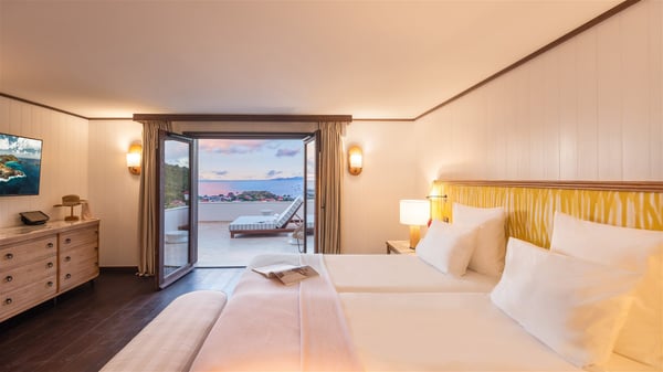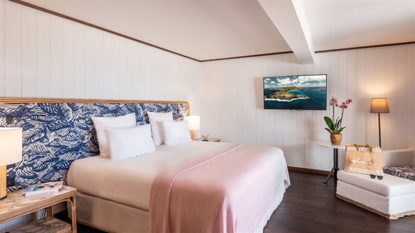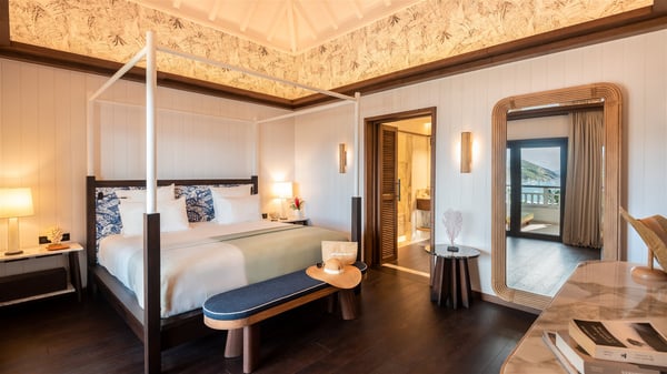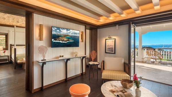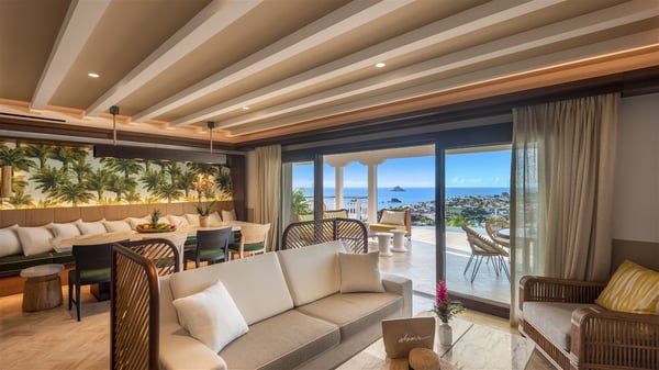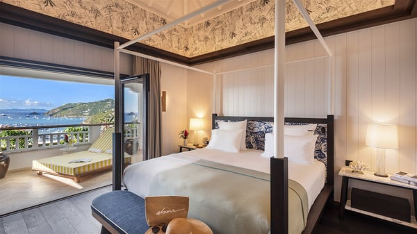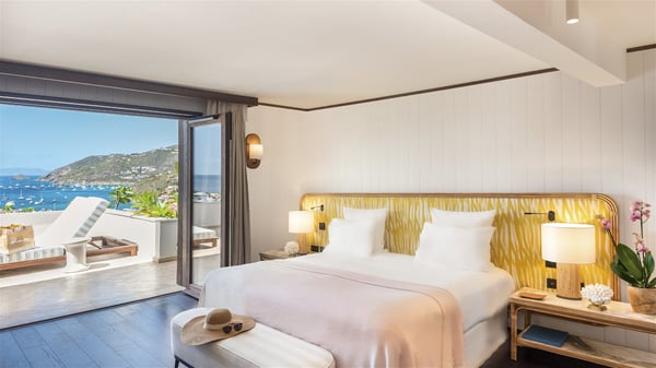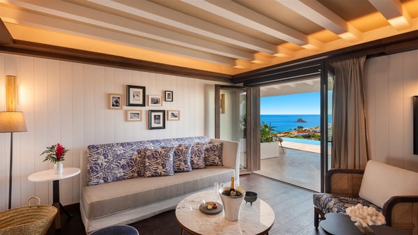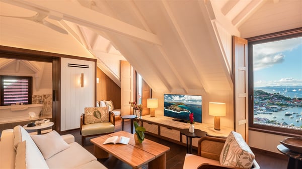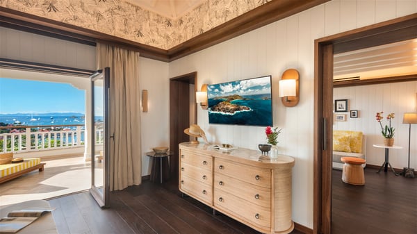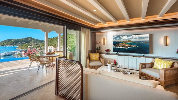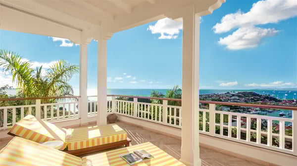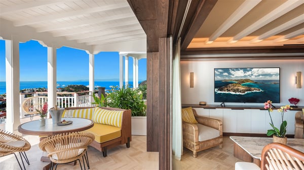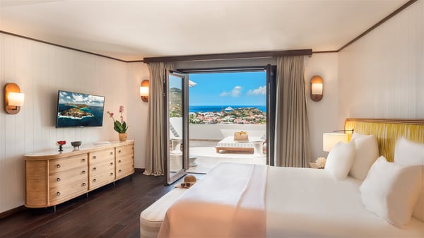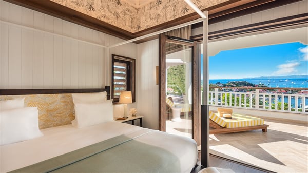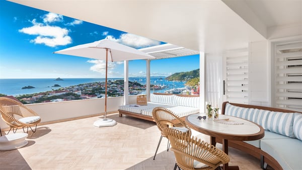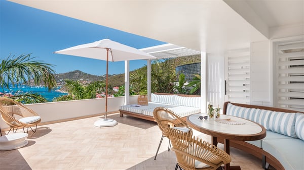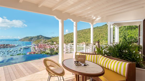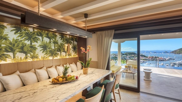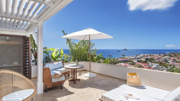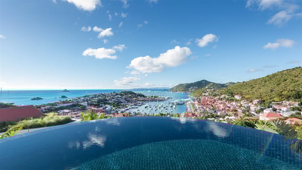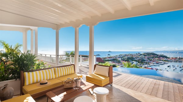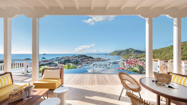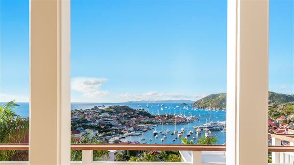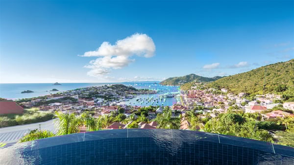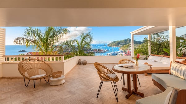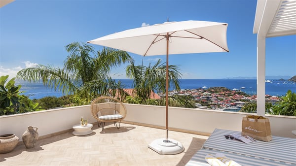 Overlooking Gustavia’s harbour, Villa Diane is a property with luxurious amenities. Facing the breathtakingly beautiful ocean view, this vacation rental in St-Barths is a true gem set on the hillside. In the heart of a privileged environment, the very private villa Diane can accommodate up to ten people for a dream stay in the Caribbean. Built over three levels, the villa rental Diane offers a refined setting in a modern ambience. The interior design by Gilles and Boissier is pure and bright, with fine living spaces overlooking the breathtaking view of the harbour and the ocean. On the main level, the lounge is comfortably furnished with sofas and armchairs on the blond parquet flooring. In the same space facing the opening onto the terrace with a swimming pool, the dining room welcomes up to ten guests around the long table with chairs and banquettes covered with cushions. As the trade winds gently blow through the wide openings, you'll love enjoying delicious meals cooked by your private chef provided with the villa rental Diane. At the front, the main terrace offers a fabulous view over the harbour and the deep-blue ocean. A few steps ahead, the large semi-circular infinity swimming pool is a most relaxing place in a very private atmosphere, close to the spacious deckchairs and the comfy outdoor lounge under the shaded part of the terrace. What’s more, in the evening, the golden hour invites you and your guests to marvel at the glorious sunset show in the golden sky, for unforgettable moments in the mild Caribbean. The villa rental Diane in St-Barths consists of five luxurious suites with king-size beds and private bathrooms. On the upper level, the master suite offers breathtaking views over Gustavia, the harbour and the sparkling horizon, and features a private lounge under the vaulted ceiling. On the main level, there are two suites on either side of the living room, which both open onto terraces facing the view. Finally, on the lower level, the other two suites also open onto their own terraces with a pergola and a lounge. Ideally located in Gustavia near the bustling harbour, Villa Diane is the perfect place for a luxury stay in St-Barths with family or friends.