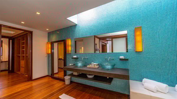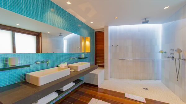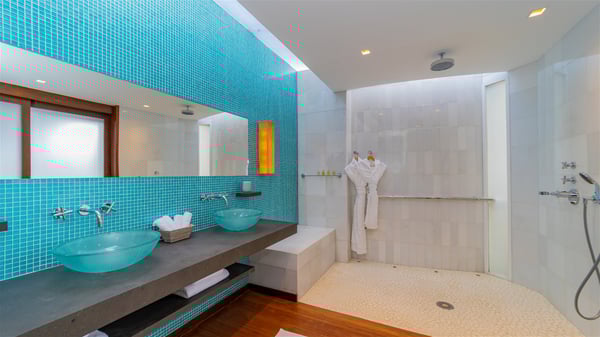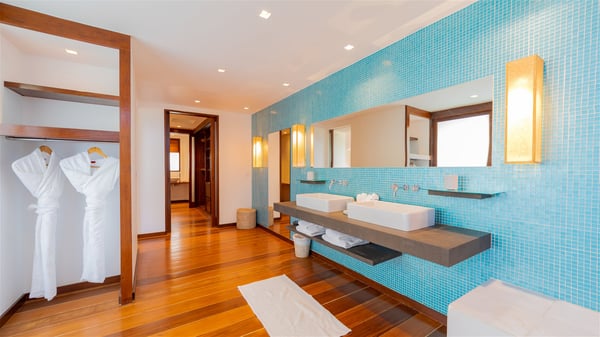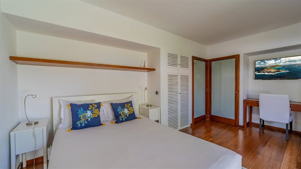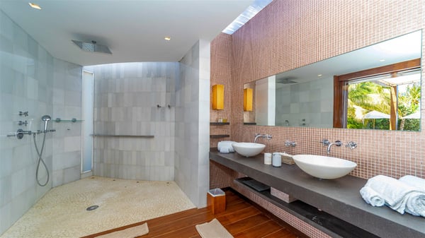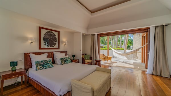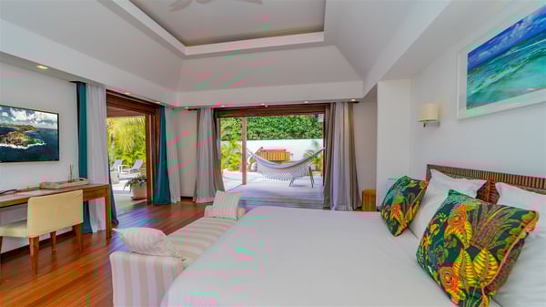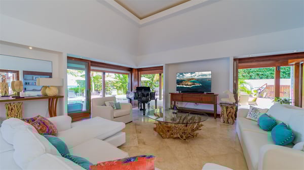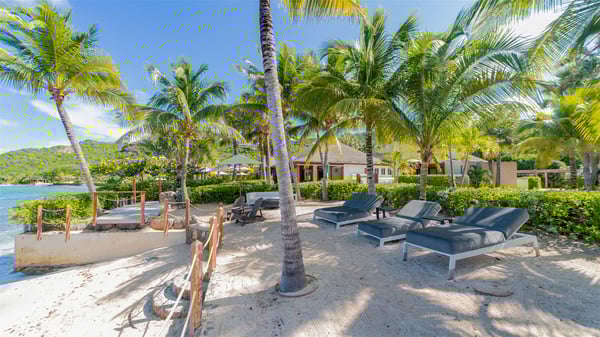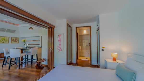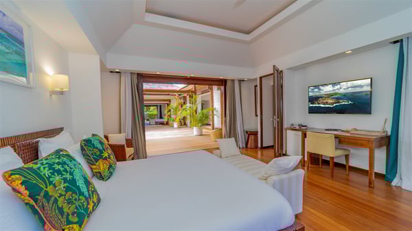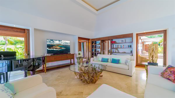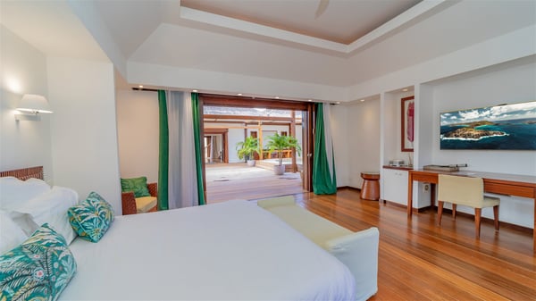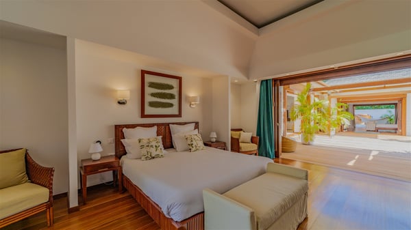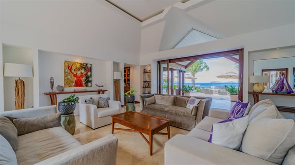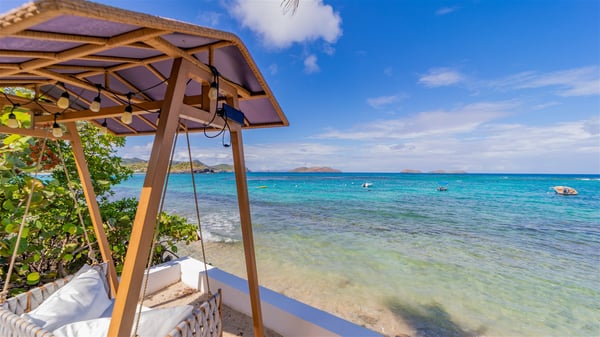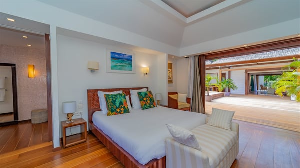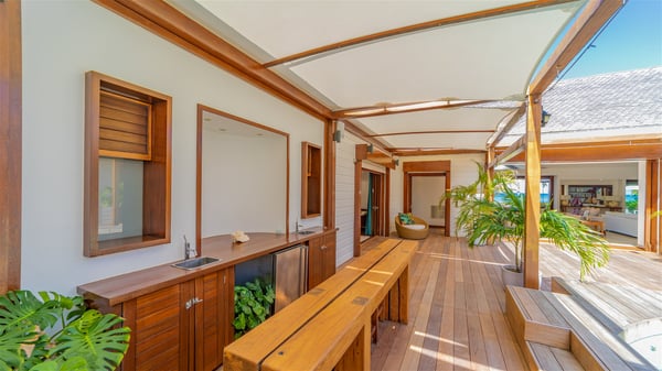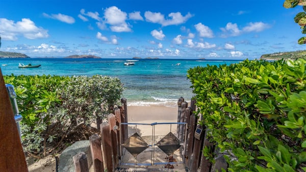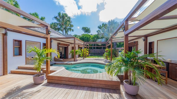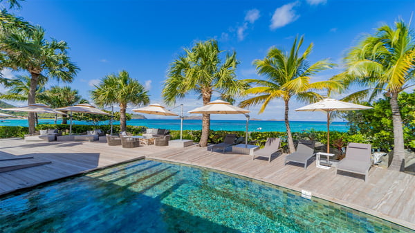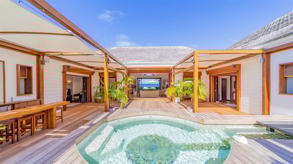 The luxury villa La Plage is a sumptuous property located on Lorient Beach in a very private setting. It offers a panoramic ocean view in a heavenly atmosphere for a fourteen-person stay. The pool, Jacuzzi, patio and large terraces make this seven-bedroom villa the perfect place for an unforgettable stay in St-Barths. Built on one level, the beachfront villa La Plage welcomes guests in utmost luxury and comfort. Well equipped with upscale amenities, this prestigious property offers air-conditioned spaces, with a living room furnished with sofas and a magnificent grand piano. In the tropical breeze, the modern kitchen is perfectly equipped for a personal chef whenever you wish to call upon one through our concierge service. As the bay windows overlook the terrace that runs around the villa, the atmosphere is soothing and relaxing, the right place to rest in the quiet and wonderful Caribbean. At the front, the terrace offers a large, sparkling swimming pool on two sides of the villa. Under the umbrellas, comfy deck chairs invite guests to rest in the gentle trade winds, close to the al fresco dining room located under the covered area. You will love walking on the nearby beach which can be accessed through the private path leading to the fine sand, under St-Barth's lush palm trees. An outdoor tub is also available on the side of the villa for private relaxation sessions. In front of the ocean, Fregate and Bonhomme islands, you will enjoy watching and marvelling at the beauty of nature. What’s more, in the center of the villa, there is a patio with a spa which can accommodate ten people in a private and cozy atmosphere. The vacation villa rental La Plage consists of seven bedrooms and seven bathrooms spread throughout the property. Five of them are located in the main building and open onto the patio, three of which on one side and two on the other one. They feature terraces and dressing rooms with soft fabrics. The other two bedrooms are in an independent guest house with a kitchen and a comfy living room, perfect for staff or teenagers. In an exclusive setting in front of the ocean, the villa rental in St-Barths La Plage is a perfect beachfront home for a luxurious stay in the Caribbean.