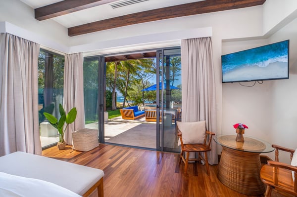 Construction is taking place nearby and may create some noise issues. Contact a Rental Escapes villa specialist for more information about how this may impact your stay. Welcome to Casa Costa Blanca, this Mansion for large groups or multiple families, that transforms going to the beach into simply opening the door, with a thoughtful layout that includes a spacious main level, a private upstairs suite, and a detached guesthouse—all set in Hacienda Pinilla gated beachfront community. Standout Features: • Beachfront on Playa Bonita, steps from a semi-private beach, between Playa Avellanas and Playa Langosta. • Luxury amenities: infinity pool, Jacuzzi, sun terrace, large windows, and a barbecue rancho for outdoor living. • Ideal for large groups, featuring a spacious main level, private upstairs suite, and detached guesthouse. • Includes beach essentials: towels, chairs, umbrellas, snorkel gear, and a cooler.