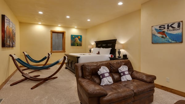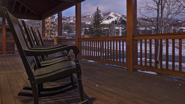 Ski Butlers offers you the best rental experience in the industry. No more lines. Ski Butlers is a full-service ski and snowboard company that delivers the equipment to you. Contact a villa specialist for more information. Guests at Rocking Chair Lodge will love this stunning seven-bedroom residence at The Porches, a luxury home community at the gateway to the Steamboat Ski Area. With 10,400 finished square ft., this home provides an amazing opportunity for a multi-family or corporate group to spend time together. The custom finishes are top-of-the-line throughout, including beautiful wood and stone floors, floor-to-ceiling tile in all bathrooms, and four gas fireplaces with custom ironwork. The large great room is open to the floor above with exposed wood beams creating an expansive and inviting space. Your group can relax on the oversized couches while enjoying the fireplace or TV. Out on the deck, complete with an outdoor fireplace, drink in the mountain views from the home's signature rocking chairs. A professional kitchen is any chef’s dream. It is equipped with Sub-Zero double refrigerators, freezer drawers, an ice maker, and wine and beverage refrigerators. Beautiful new Wolf ranges with the iconic red control knobs boast three ovens, ten gas burners, and an infrared dual griddle. To finish out the chef’s fantasy, there are two Asko dishwashers, a built-in Miele espresso maker, a convection oven/microwave, copper farm sinks, and a double island made of stunning banded ironstone. The outside island has seating for four people and a large wall-mounted TV adds even more ambiance. For indulging in the food your chef has put together, there is a gorgeous new 14-person dining table with luxurious chairs, stylish lighting, and incredible artwork. This is a beautiful dining space to gather and entertain. The primary suite on the main floor features a massive, one-of-a-kind, custom, 90 sq. ft. bed, a rock fireplace, a desk area, and access to the front patio. The spacious and luxurious jade-green marble ensuite boasts plentiful counter space, dual sinks, a towel warmer, and a large jetted tub. An enormous closet boasts a center island, plentiful clothing storage, mirrors, and access to the laundry room. Circle around to a large gear storage room and access to the garage and kitchen. The upper level of the home has five additional bedrooms, including an apartment-sized queen suite with a full kitchen, sitting area, ensuite bath, and access to the upper deck with a hot tub. A fun bunk room has three twin and three full beds, a private ensuite, and access to the deck and hot tub. Down the hall are two more suites, one with a queen bed and one with a king bed and deck access. In the hall is a large roll-top desk and chair. A queen suite sits off the upper loft and has access to a small deck with ski area views and a shared bathroom. A stunning upstairs sitting area loft overlooks the great room and offers a desk area for remote workers and a beautiful place to relax. The lower level of this home is where entertaining is at its best. The huge family room offers a zebra-striped billiards table and a large projection movie screen with eight reclining theater seats for the ultimate movie night. For your refreshments, enjoy a full wet bar with a beverage refrigerator and freezer and barstool seating for eight. A round game table is perfect for cards, or enjoy seating by the nearby fireplace. An adjacent bedroom suite has a king bed, two hammocks, a sitting area with a wall-mounted TV, and an attached ensuite with a closet, dual sinks, and a large walk-in shower. Perfect for an executive retreat, just past the family room is a new, large conference room ready for business meetings. A gorgeous U-shaped conference table has 12 plush swivel chairs, a wall-mounted TV, and whiteboards for brainstorming. Down the hall is a powder bath on the way to the adjacent game room, which has a ping pong table, shuffleboard, a keyboard, and couches to relax on in front of another wall-mounted TV. Next to the game room is an incredible gym with a 14-foot high climbing wall, a climbing rope, rings, floor mats, and a foosball table. In addition to all the lower-level fun and incredible bedroom suites, Rocking Chair Lodge boasts the largest deck at The Porches with an outdoor fireplace and a magnificent view of the ski mountain. The Porches amenities are one of the biggest attractions to this neighbourhood and include a 6000 square foot "barn" with a heated outdoor pool and hot tubs, outdoor BBQ deck and fire pit, fitness center, kids' playroom, business center, and great room. This home enjoys complimentary use of the shuttle, mid-November through mid-April, using the convenient shuttle app to schedule pickups. Skip the hassle of a rental car and let us take you where you need to go. This home does not have air conditioning. Colorado's cool summer nights will keep this home comfortable by opening windows after the sun goes down, and then closing the windows and blinds during the day. Utilizing the overhead fans, if available, keeps airflow moving, and additional floor fans can be found in many bedroom closets. Can't live without it? A/C units may be available for rent for an additional fee. Guests at the Porches enjoy access to a community pool, hot tub, and fitness center.