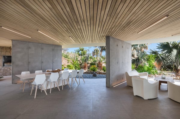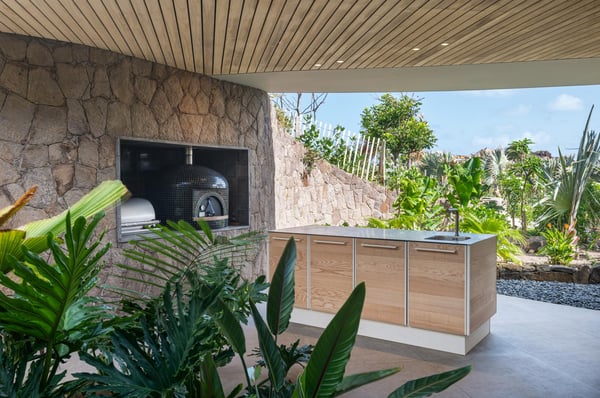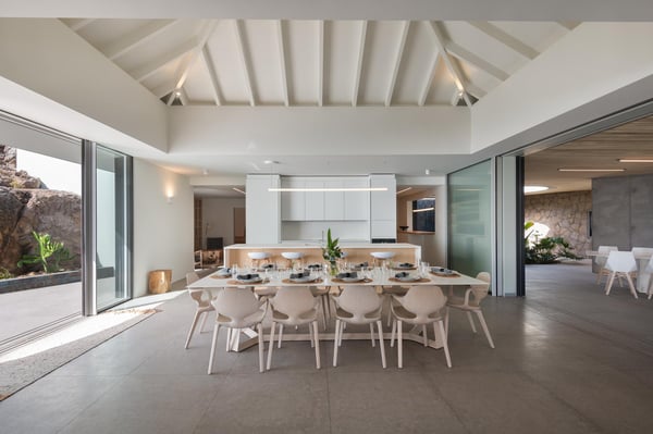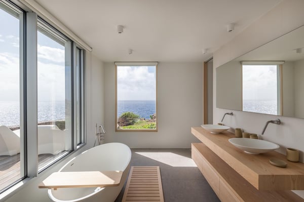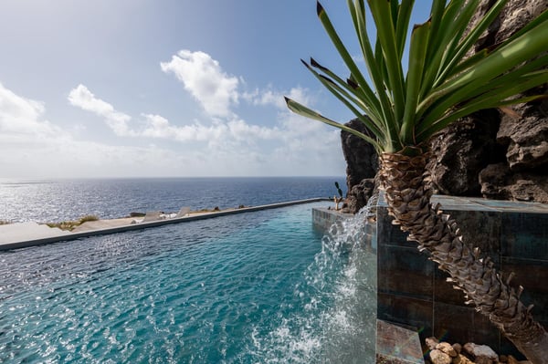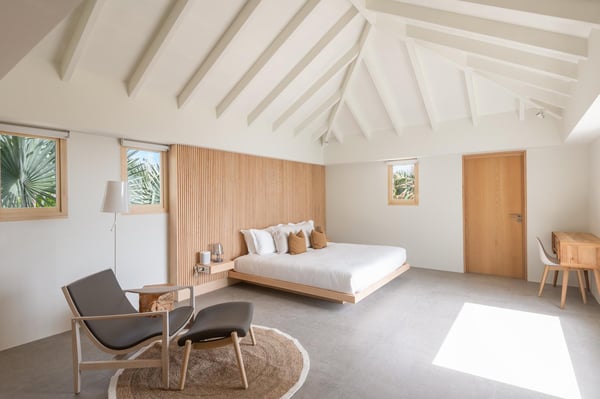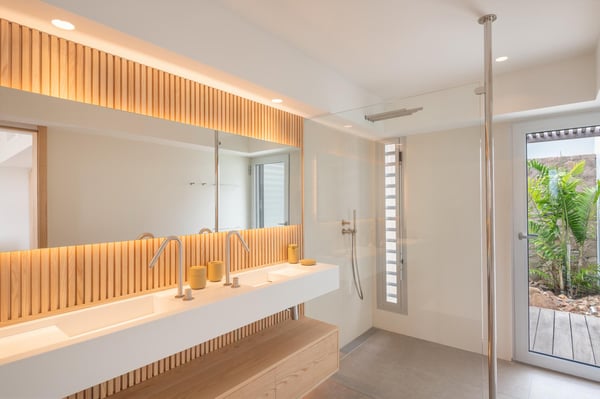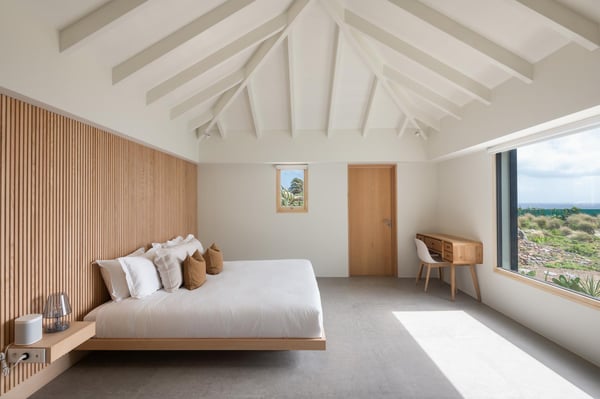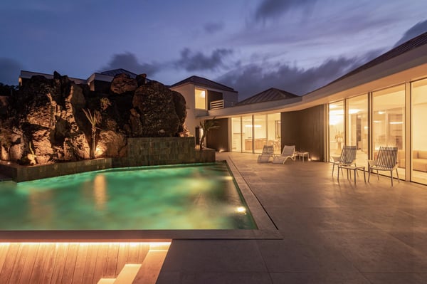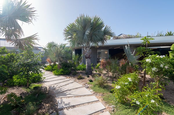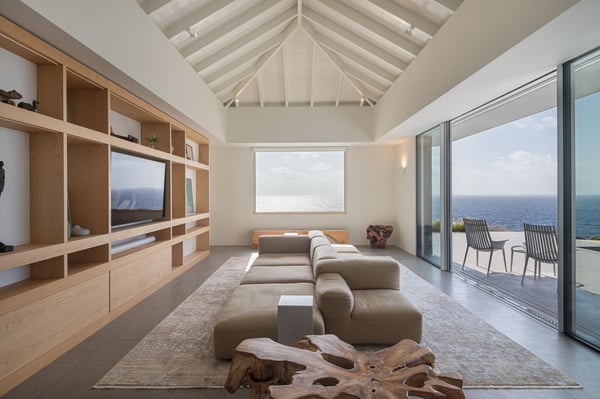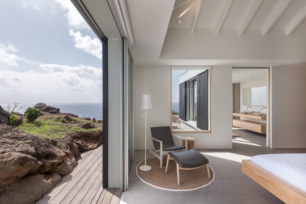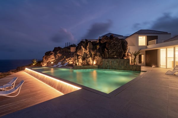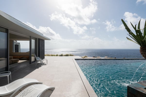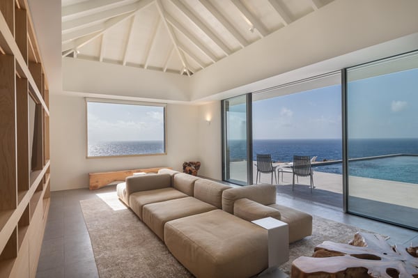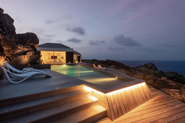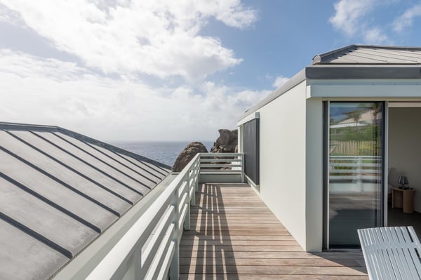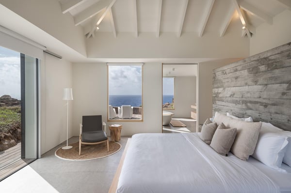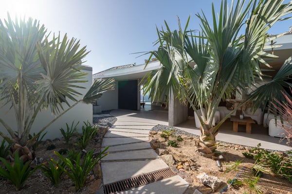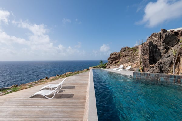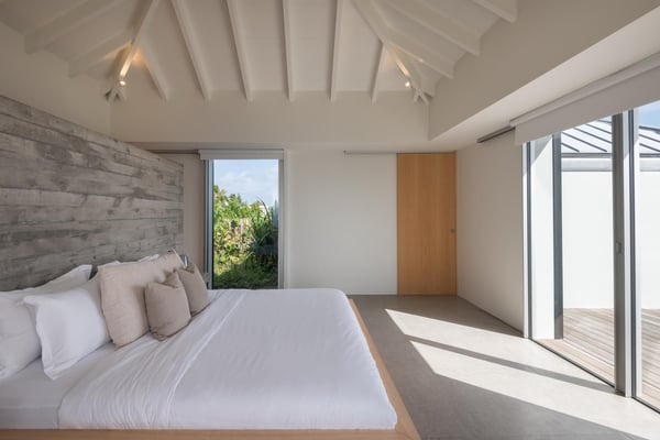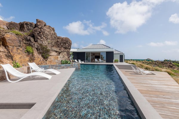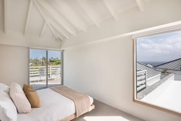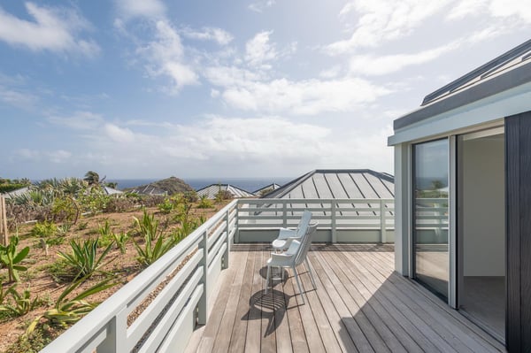 The holiday rental Paulista is a sumptuous property located in Petit-Cul-de-Sac in Levant private estate. Combining gracefully indoor and outdoor spaces, this vacation rental home offers upscale amenities for an exceptional stay on the cliffside overlooking the ocean. The heated swimming pool and the beautiful garden make Villa Paulista the exclusive place for a fantastic vacation for up to eight people in St-Barths. Built over two levels and designed through pathways and a lovely garden, villa Paulista is a true gem of architectural beauty. The many touches of light wood combined with the striking white furnishings create a luxurious and refined ambience you’ll love enjoying. Open both onto the front terrace overlooking the ocean, and onto the side terrace overlooking the tropical garden, Paulista's living room features a lounge with a sofa and HD screen, a dining room for up to ten guests and a modern, fully-equipped kitchen. There is a second dining room next to the garden terrace with a barbecue and pizza oven for delightful dinners under the stars. All bay windows open onto the ocean and the extraordinary glow of the Caribbean, creating a quiet atmosphere, perfect for relaxing and unwinding. The front terrace offers breathtaking panoramic views. Facing the shimmering, deep-blue ocean, you’ll find lovely deckchairs close to the geometrically-shaped heated swimming pool, with charming small waterfalls. On the side of Villa PAULISTA, the second terrace opens onto the garden planted with palm trees, local shrubs and blooming plants. A lounge with armchairs and sofas is also at your disposal facing the garden, with comfy and exquisite furnishings in an idyllic scenery. The vacation villa rental Paulista consists of four air-conditioned bedrooms with king-size beds, en suite bathrooms and breathtaking ocean views. Two of them are on the main level, one with an additional outdoor shower. The other two bedrooms are upstairs, accessible via an indoor staircase. Downstairs, there's a library with a reading area you’ll love enjoying whenever you wish to have a rest. Both upstairs bedrooms feature private terraces, and one also has a bathtub. The decor of all bedrooms is fine, bright and elegant. In utmost luxury facing the sparkling ocean, villa Paulista is the ideal location for a fantastic and unforgettable eight-people stay in St-Barths.