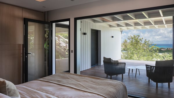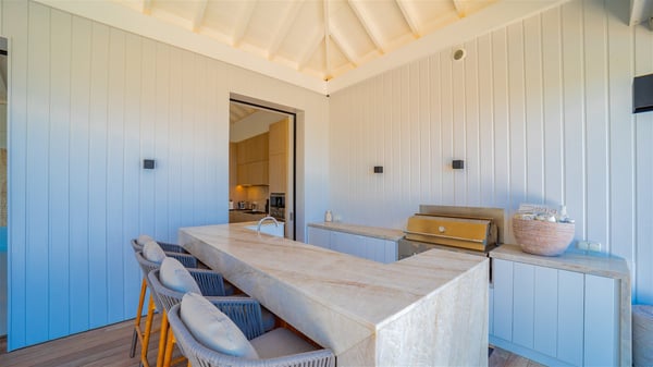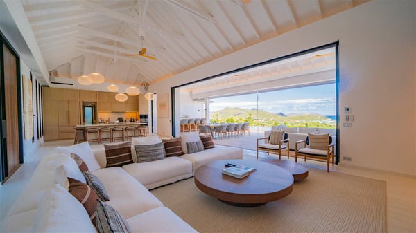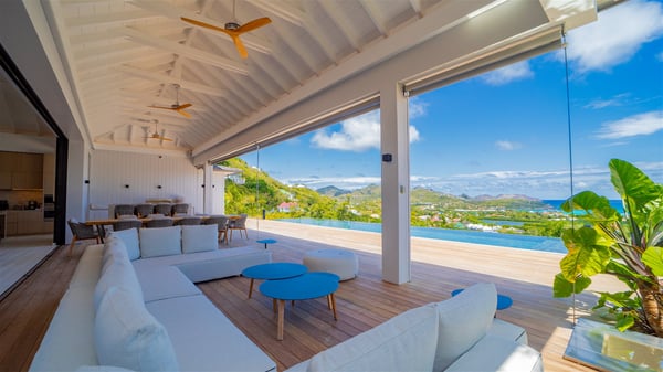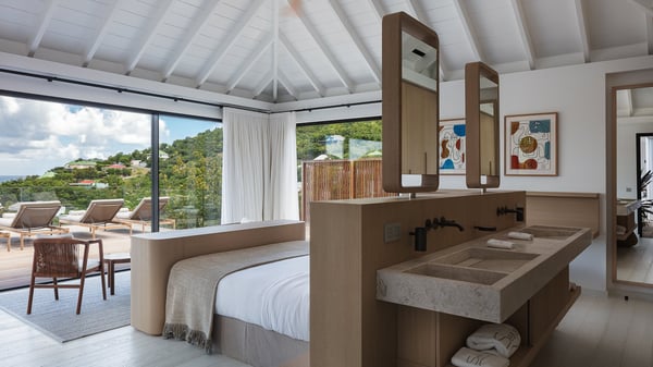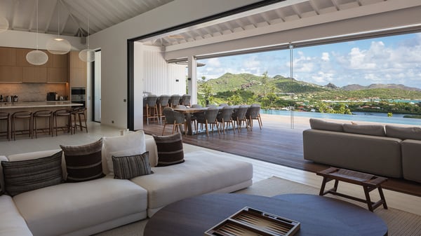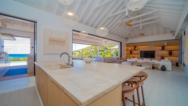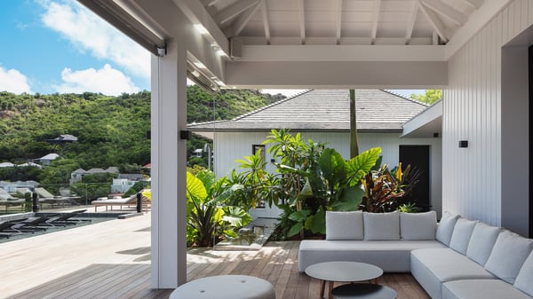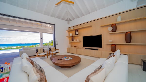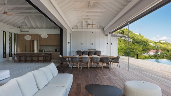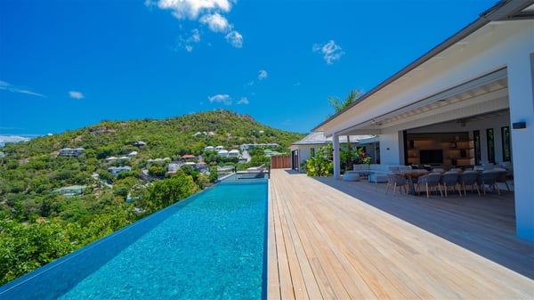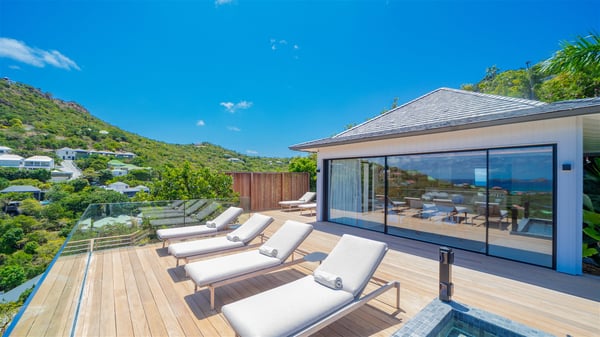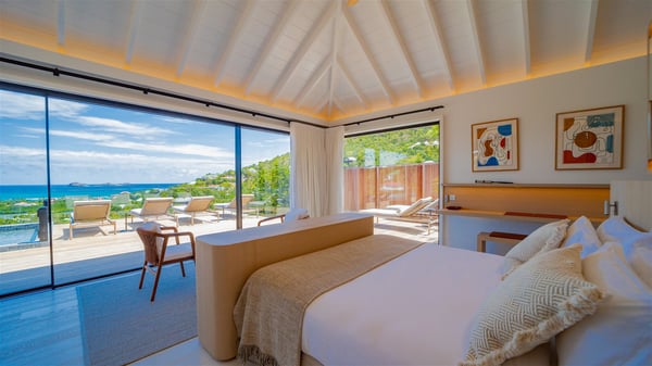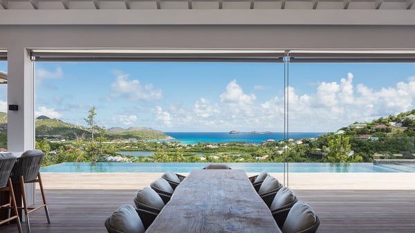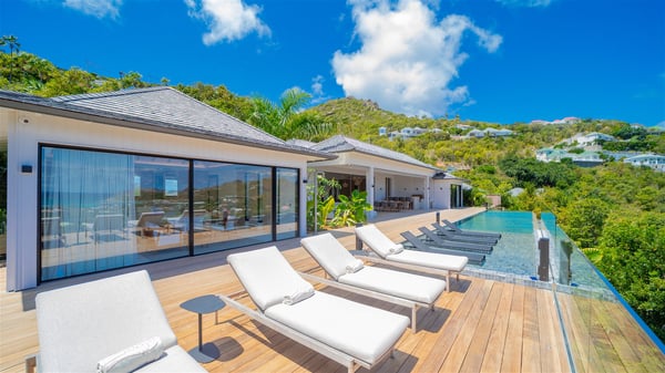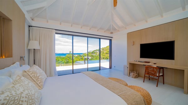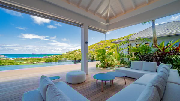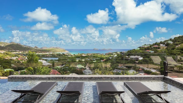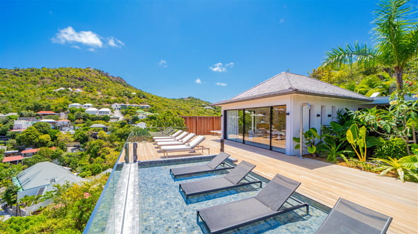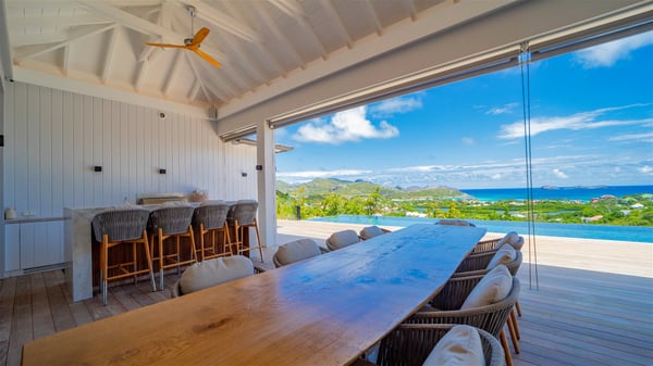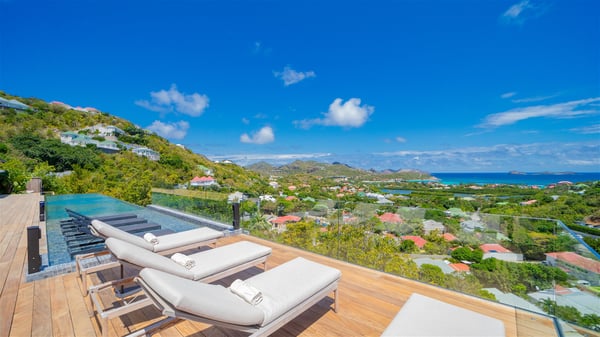 The villa rental Seala is a prestigious five-bedroom property with fantastic views over St-Jean Bay. Luxurious and very spacious, this vacation rental with a heated swimming pool and a fitness room offers upscale amenities for an outstanding stay. Set in a tropical environment with the blue hues of the sky and the ocean, Villa Seala is a true architectural gem for an unforgettable vacation in St-Barths. Built over three levels, the vacation rental in St-Barths Sealawelcomes guests in its wide spaces facing the panoramic view over St-Jean Bay. On the main level, you’ll find the magnificent lounge with sofas and a flat-screen TV, close to the fully-equipped kitchen with breakfast bar and central island, as the exceptional St-Barths’ light illuminates the indoor spaces; a second professional kitchen is at the disposal of your private chef. The decor is elegant, with light wood accents and bleached parquet flooring. The large windows open onto the covered terrace, furnished with an al fresco dining area for ten guests, as well as a barbecue for delightful evenings. The whole is chic and refined, to quietly relax in a very private atmosphere. At the front, the terrace offers an extraordinary panoramic ocean view. The heated infinity swimming pool sparkles in the sunshine and features a shallow end with underwater loungers. Sun loungers are also available on the side of the pool, for pleasant reading sessions in utmost calm. You'll enjoy the gentle rustle of palm and local shrubs’ leaves as the trade winds blow and bring an exotic touch to this exceptional villa. The vacation rental villa Seala consists of five air-conditioned bedrooms with en suite bathrooms. Two are on the main level, including one in an independent bungalow near the main building. The third one is a few steps down, and the other two are on the lower level, close to the well-equipped fitness room. All open onto St-Jean Bay and are furnished with king-size beds in a linen and wood decor, the best place to rest in a soothing, private atmosphere. Facing the extraordinary view over St-Jean Bay and the rolling hills, Villa Seala welcomes guests for an exceptional stay for up to ten people in St-Barths.