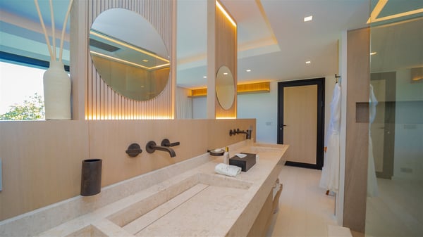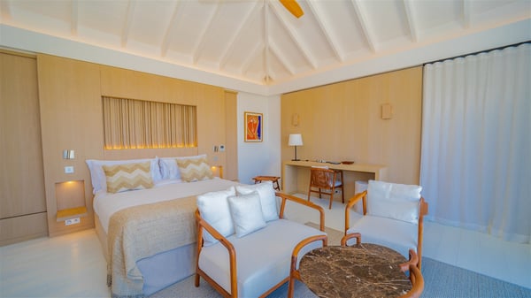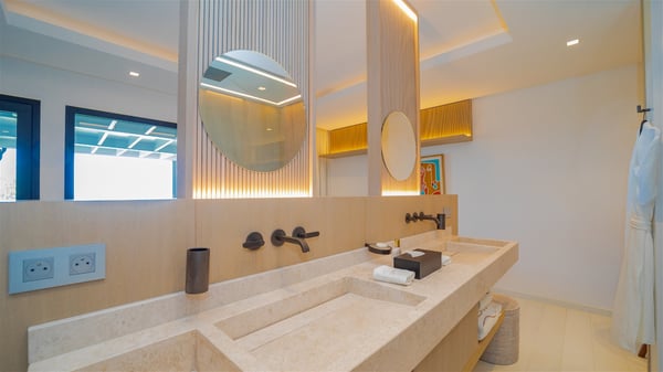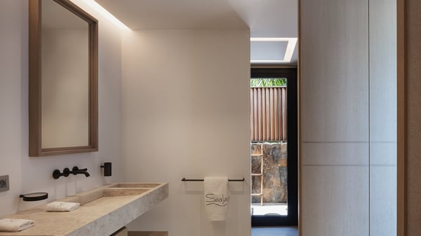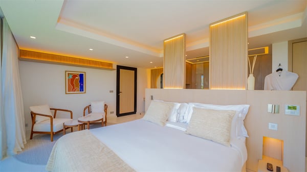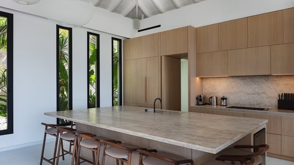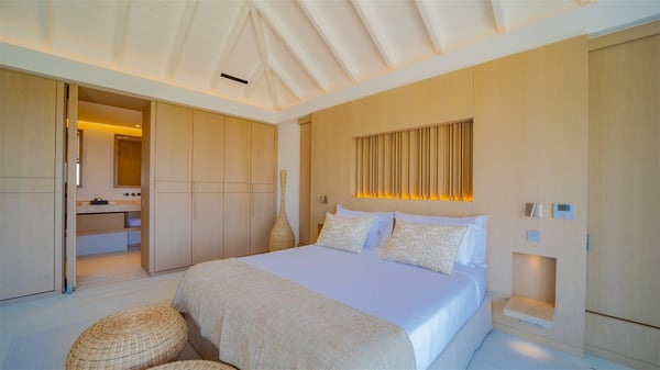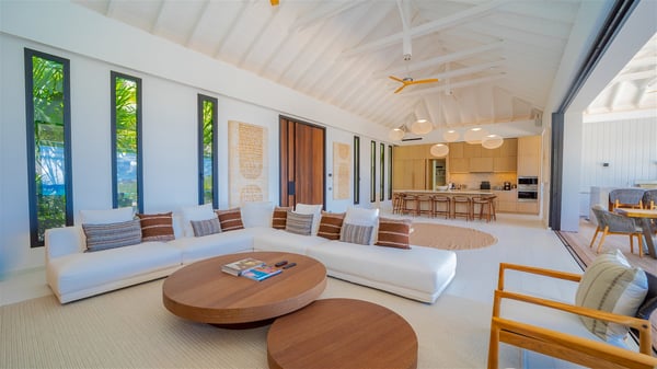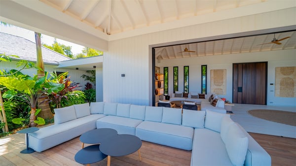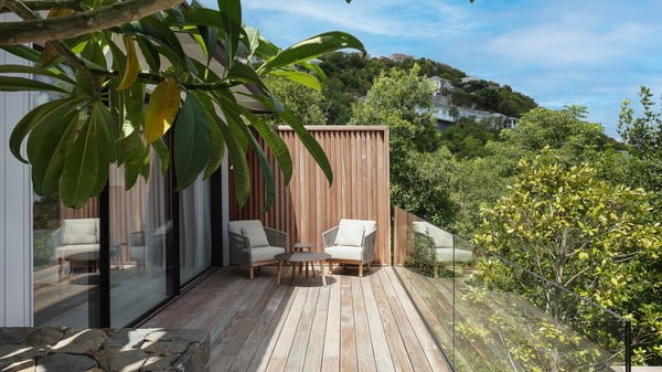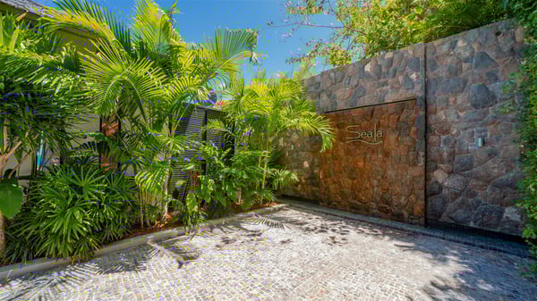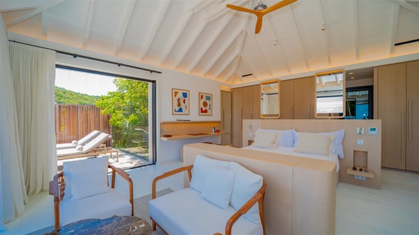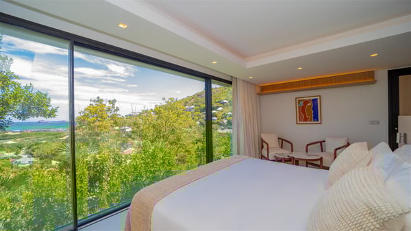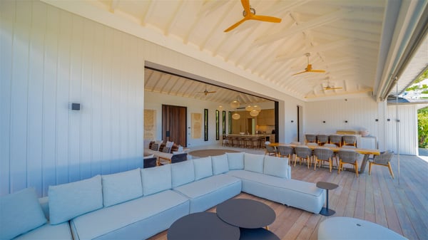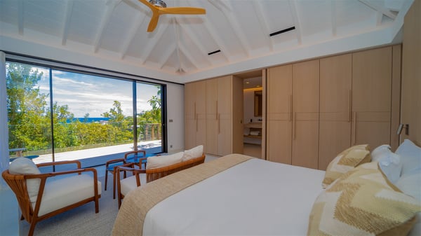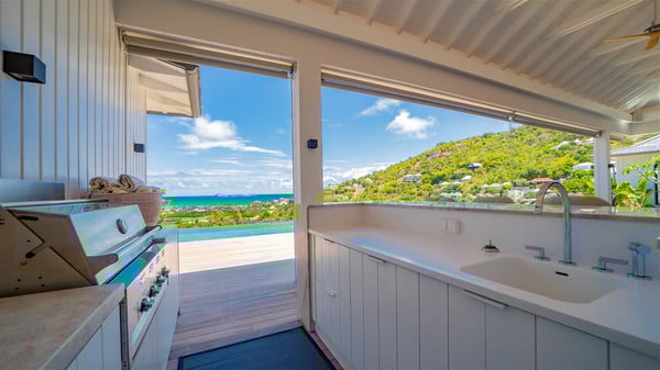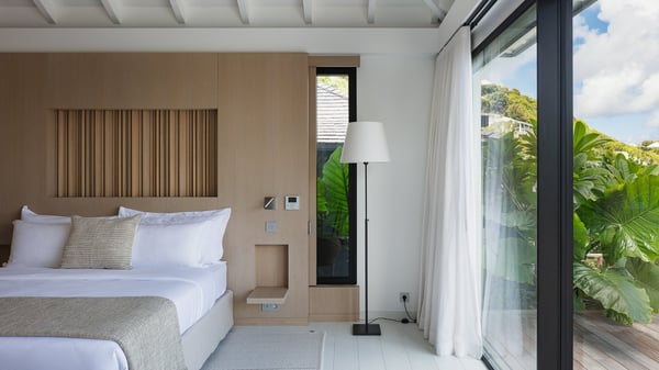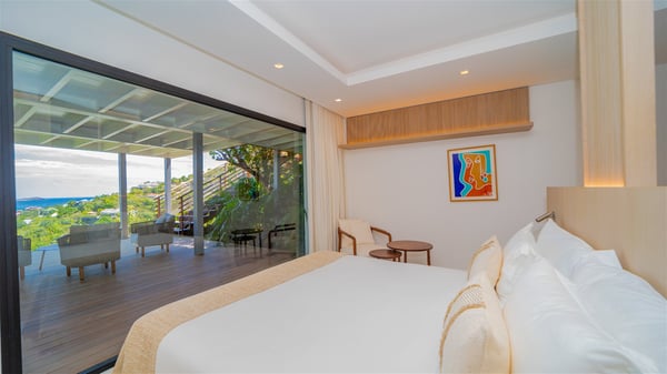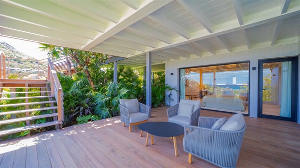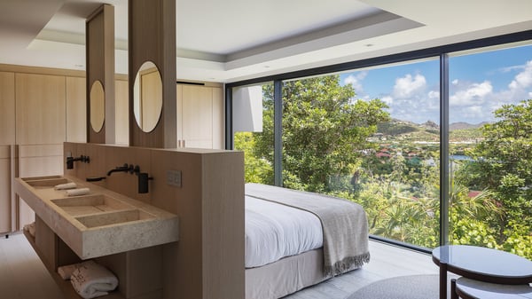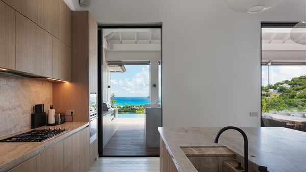 The villa rental Seala is a prestigious five-bedroom property with fantastic views over St-Jean Bay. Luxurious and very spacious, this vacation rental with a heated swimming pool and a fitness room offers upscale amenities for an outstanding stay. Set in a tropical environment with the blue hues of the sky and the ocean, Villa Seala is a true architectural gem for an unforgettable vacation in St-Barths. Built over three levels, the vacation rental in St-Barths Sealawelcomes guests in its wide spaces facing the panoramic view over St-Jean Bay. On the main level, you’ll find the magnificent lounge with sofas and a flat-screen TV, close to the fully-equipped kitchen with breakfast bar and central island, as the exceptional St-Barths’ light illuminates the indoor spaces; a second professional kitchen is at the disposal of your private chef. The decor is elegant, with light wood accents and bleached parquet flooring. The large windows open onto the covered terrace, furnished with an al fresco dining area for ten guests, as well as a barbecue for delightful evenings. The whole is chic and refined, to quietly relax in a very private atmosphere. At the front, the terrace offers an extraordinary panoramic ocean view. The heated infinity swimming pool sparkles in the sunshine and features a shallow end with underwater loungers. Sun loungers are also available on the side of the pool, for pleasant reading sessions in utmost calm. You'll enjoy the gentle rustle of palm and local shrubs’ leaves as the trade winds blow and bring an exotic touch to this exceptional villa. The vacation rental villa Seala consists of five air-conditioned bedrooms with en suite bathrooms. Two are on the main level, including one in an independent bungalow near the main building. The third one is a few steps down, and the other two are on the lower level, close to the well-equipped fitness room. All open onto St-Jean Bay and are furnished with king-size beds in a linen and wood decor, the best place to rest in a soothing, private atmosphere. Facing the extraordinary view over St-Jean Bay and the rolling hills, Villa Seala welcomes guests for an exceptional stay for up to ten people in St-Barths.
