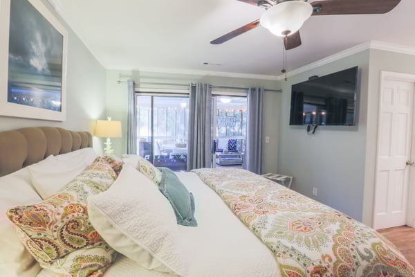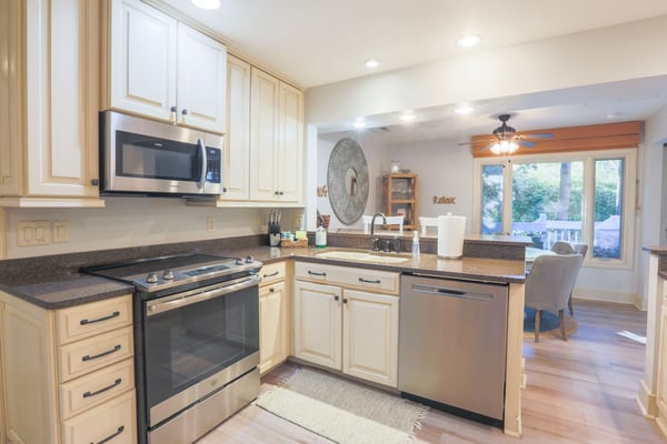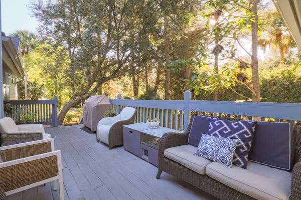 This wonderful, renovated home within the gated Wild Dunes Resort boasts an impressive list of perks and amenities for its guests. Marine House features two primary suites, is a short 10-minute walk to the beach and, best of all, provides a quiet and peaceful retreat within the sun-drenched, bird-filled woods on its screened porch and backyard oasis. Decorated in a coastal casual vibe with soothing interior colour schemes and furnishings, making you feel right at home as soon as you enter the front door or spend any amount of time on the home's screened porch, back deck and backyard area. This comfortable home is a great getaway for a group of family or friends, as there are multiple separate seating areas throughout the home for you and your guests to hang out together and also have the option to relax separately on your own. Guests enter the property via the exterior stairs in the front yard to the front door of this elevated home. Once you enter the front door, you will find a large living room with comfortable seating, laminate hardwood floors and cable TV; a kitchen with granite countertops, white cabinetry and stainless steel appliances and a dining area. On one side of the living room, you will find one of the home's primary suites, the queen guest bedroom, the twin trundle guest bedroom and a hallway bathroom with shower/tub combo. You can access the home's screened porch and backyard area from the living room and one of the home's primary suites. On one side of the kitchen, you will find the home's second primary suite and the bunk bedroom suite. There is a full-sized washing machine and dryer in a closet in the kitchen. Off-street parking on the driveway for up to 4 cars is included.
