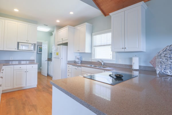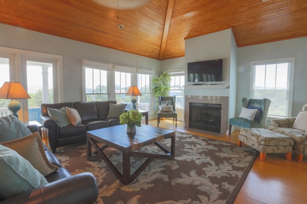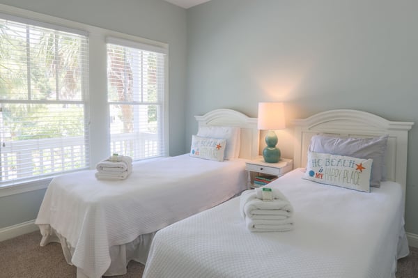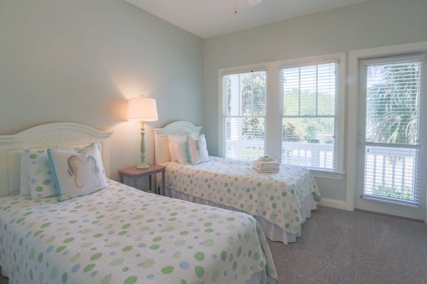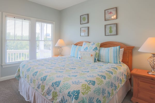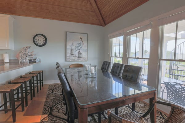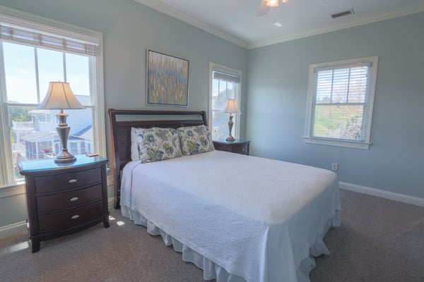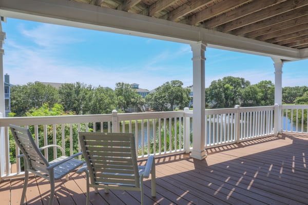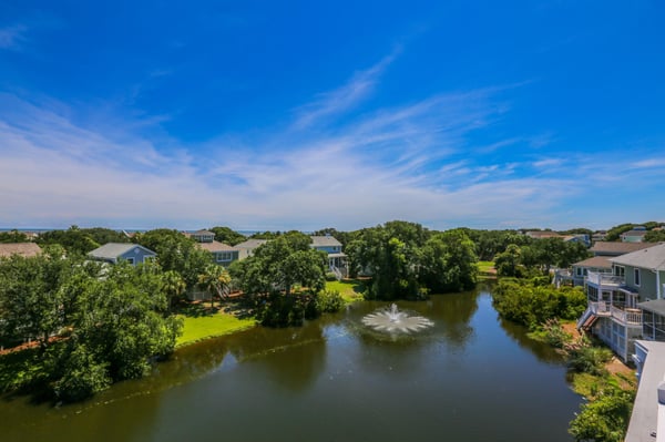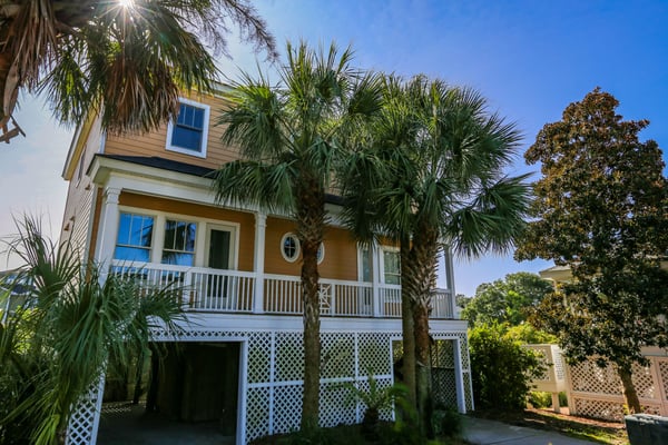 This phenomenal 5 bedroom home within the Pelican Bay community in Wild Dunes Resort, has been treasured by generations of vacationing families for its central location (only a 5 minute walk to the private, spacious Atlantic Ocean beach); renovated community pool (which is only 100 yards from the home); water views (the bedrooms, great room and decks alongside the back of the home have stunning water views of the lagoon) and its open & airy, light filled second floor (the home's kitchen, living room & dining room are all located on the top floor). Each of the 5 bedrooms have their own private bath, and there are two porches and as well as a roof deck loacted at the back of the home -- you'll love the incredible views of the Atlantic Ocean & surrounding area from the roof deck! Guests can enter the property via the the front door in the carport area of the home where stairs will take you to the first floor. On the first floor, you will find four of the home's five bedrooms (each with their own private bathroom) and a den with a queen sized sleeper sofa. You may access the covered deck off the first floor of the home from the den and two of the first floor bedrooms. On the second floor, you will find the home's large living room, dining room and kitchen. There is a half bath tucked away behind the kitchen. The home's master suite is located just off of the living room. Best of all, the second-level deck stretches alongside the entire back of the home and has stunning views of the lagoon below. A stairwell on the second-level deck takes you to the home's observation deck, which features sweeping views of the lagoon and the Atlantic Ocean. Off-street parking on the driveway for up to 2 cars is included in the rental.
