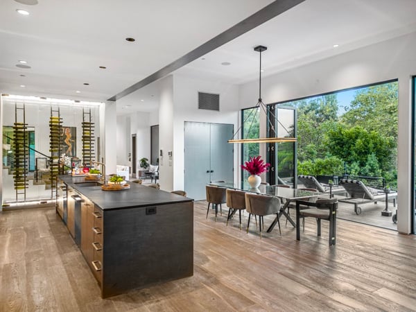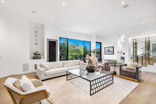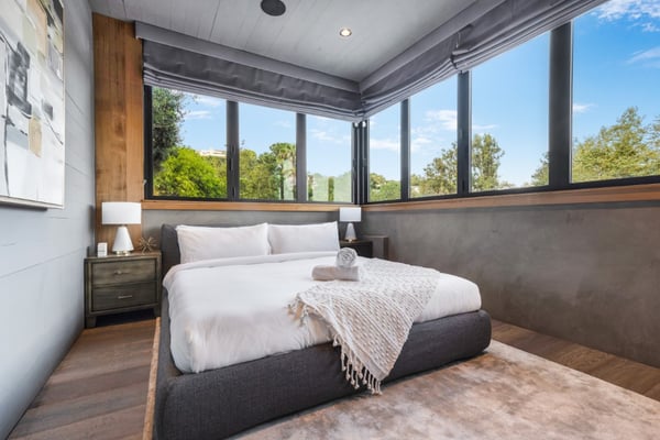 This property is only available for monthly stays with a minimum of 31 nights. If you are interested in short-term stays, please contact a villa specialist for your luxury travel needs. Situated less than half a mile North of Sunset, above Beverly Glen, hidden behind a gate and high trees, this Contemporary compound was rebuilt in 2018/2019. Private gates open to an 10 car motor court with cascading water wall, mature landscaping and four-car garage. The formal entry boasts high ceilings and a vast living/entertaining area. Features include an eat-in chef's kitchen with professional appliances, and multiple indoor and outdoor dining areas with a wall of retractable glass that opens to the pool deck. The large living room includes a cozy fireplace, with access to two backyards, secluded fire pits with custom built-in seating. A resort-like primary offers custom walk-in closets and spa-like ensuite bathroom with his and hers showers and water closets, dual vanities and marble upgrades. Three additional guest suites include a beautiful junior primary. Additional highlights include state of the art A/V upgrades and infinity pool with deck and sitting areas.
