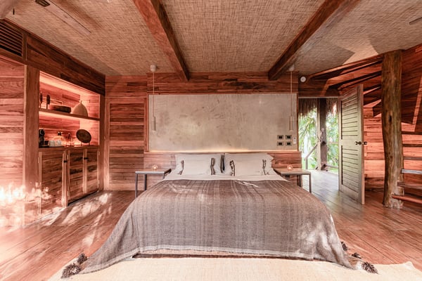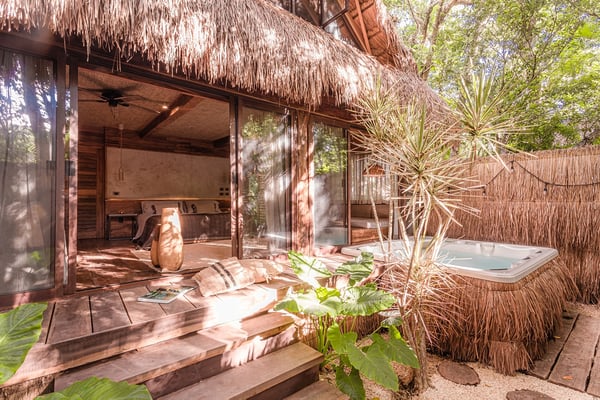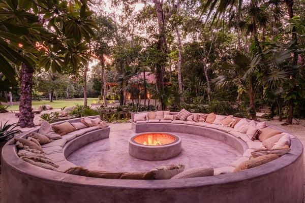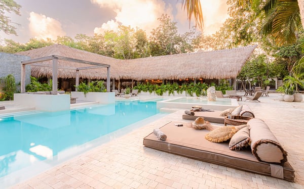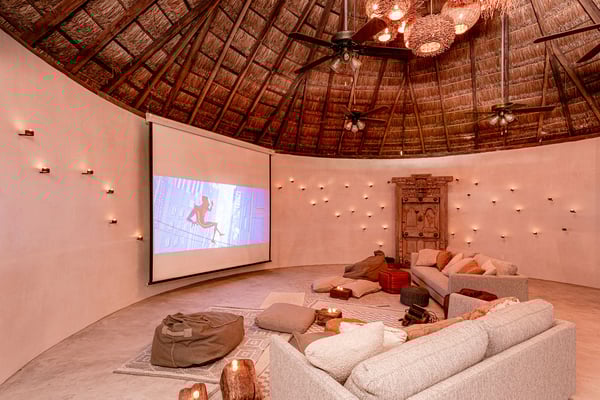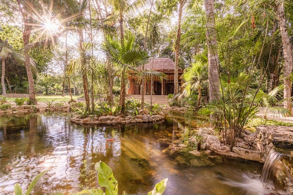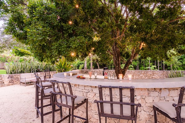 Nestled amidst the serene beauty of Xpu Ha beach and the Mayan jungle, Villa Onze emerges as a hidden gem just a stone’s throw away from the vibrant Playa del Carmen. This exquisite haven offers an idyllic backdrop for grand events and cherished weddings. As you step onto the jungly paths of Xpu Ha, you’ll find yourself transported to a world of tranquillity and seclusion, making Villa Onze the perfect canvas for unforgettable gatherings. Villa Onze seamlessly blends rustic charm with modern sophistication in its architecture and interior design. Local stone and materials harmonize with contemporary accents, creating an ambiance that is both inviting and elegant. With 7 spacious bedrooms accommodating up to 23 guests, this sanctuary provides ample space for relaxation and celebration. One of the details that make this villa unique is that you will be able to dive into the crystal-clear waters of its own private cenote, an underground river that truly sets this property apart. Indulge in the serenity of Villa Onze by starting your day with tranquil morning yoga sessions in its charming rustic studio. For some afternoon entertainment, make your way to the fully-equipped media room, where you can unwind and enjoy your favourite films or shows. As the day transitions to evening, immerse yourself in the enchanting atmosphere of the villa’s half-moon-shaped bar, or savour a delightful meal al fresco on the rustic dining deck, offering panoramic views of lush gardens and the quaint chapel—perfect for intimate weddings and celebrations alike. The property is a family-friendly space with a children’s playground, in-ground trampoline, swings and Arial silks, plus a Pickleball and basketball court. There is a huge lawn space perfect for games like cricket, baseball, football, croquet, and volleyball and large soft foam play structures can be set up for toddlers. Beyond the villa’s confines, the captivating wonders of Xpu Ha and its surroundings await your exploration. Dive into the enchanting cenotes, soak in the vibrant energy of Playa del Carmen, or embark on a journey to the ancient ruins of Tulum. Whether you seek adventure or tranquillity, Villa Onze is the perfect starting point for your Mexican getaway.