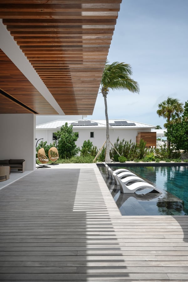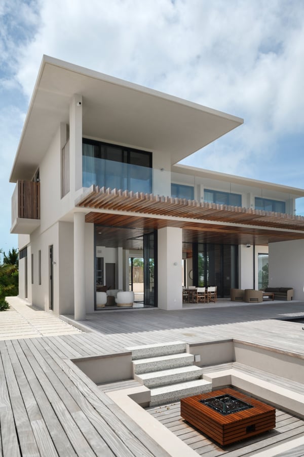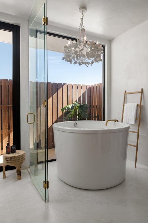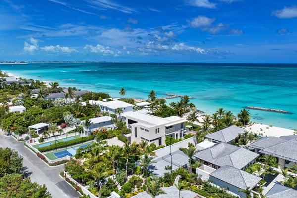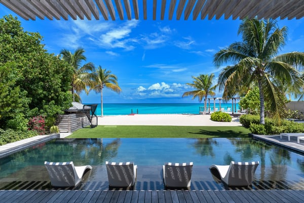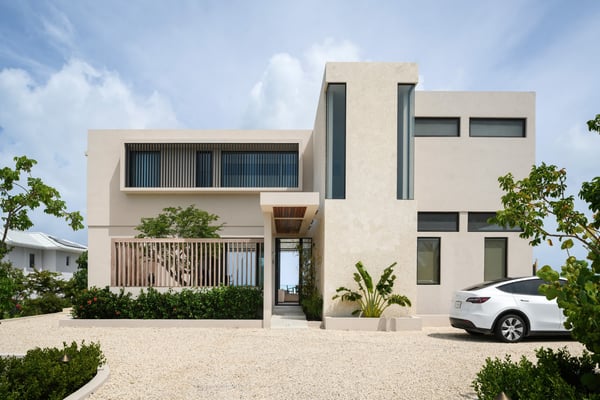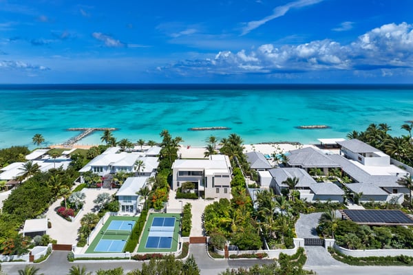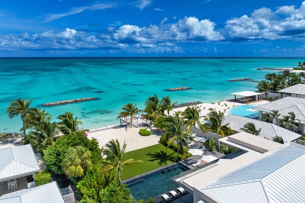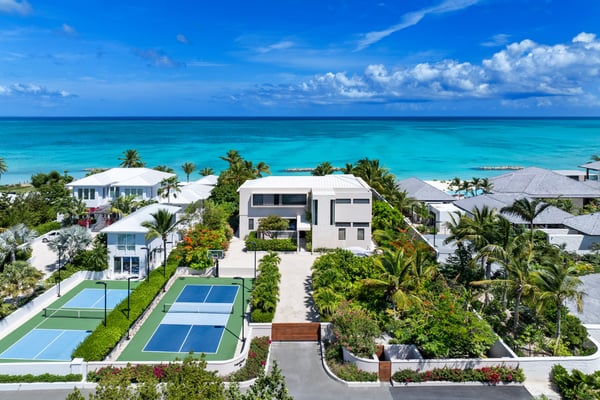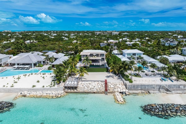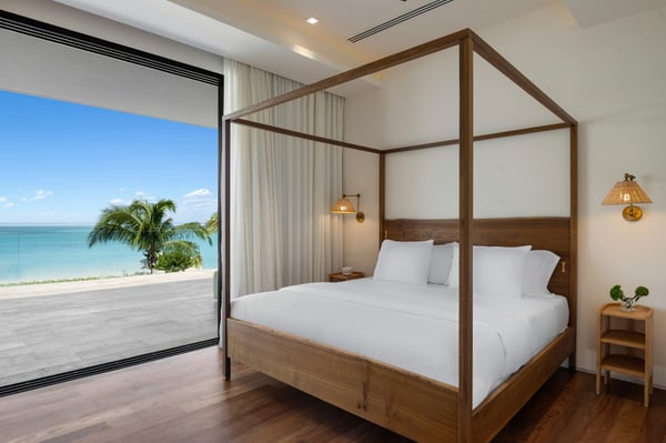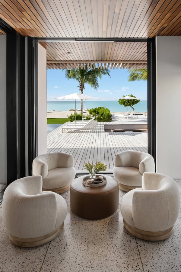 With its bold design and beachfront position Villa Marahuyo delivers distinctive style on world-renowned Grace Bay. The clean lines, wall-to-wall glass and lofty ceilings of Villa Marahuyo carry from the entry through the main living areas and out onto the magazine-worthy main deck, where a dramatic black lava stone pool stands in stark contrast to the white sands and turquoise hues of the beach beyond. With lounge chairs positioned on a shelf in the pool, sun beds lined up alongside it, and hanging cocoon chairs on the deck, there’s no shortage of spots to soak up the sun, while a deep overhang offers ample space to dine or relax in the cool shade. Kayaks, snorkel gear and a pickleball court offer plenty of ways to stay active by day. Come nightfall, the sunken firepit, with its views of the ocean, is an inviting space to sip a sundowner and plan the next day’s adventures. Timber-clad ceilings and terrazzo floors lend the modern interiors a warm aesthetic and fully pocketing doors across the living room bathe the interior in natural light. A vast sectional sofa offers ample space for a full house to get comfortable indoors, a circular dining table is ideal for convivial meals, and the full bar means your butler can mix any cocktail you could dream of. Keen cooks have a spacious, well-equipped kitchen at their disposal and for those who prefer simple fare, there is also a barbecue on the deck. The six bedrooms are tastefully decorated with lots of timber and organic materials and all feature elegant ensuite bathrooms with brass fixtures. One bedroom is located on the main level with direct access to the pool terrace; the remainder, all with beautiful hardwood floors, are located upstairs. Four of these open onto a shared balcony with ocean views and the principal suite includes a luxurious bathroom with indoor and outdoor showers and a circular bathtub.