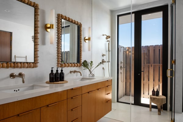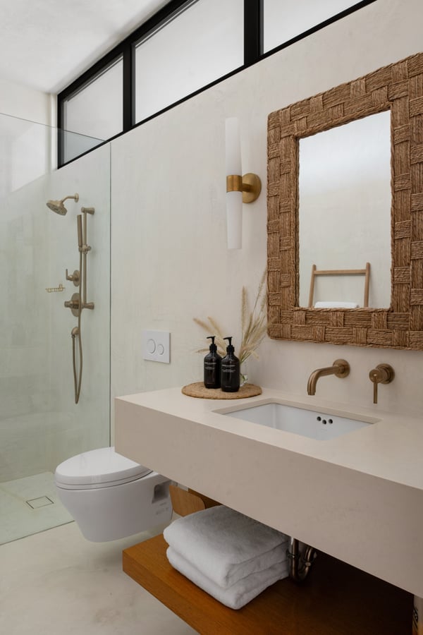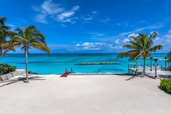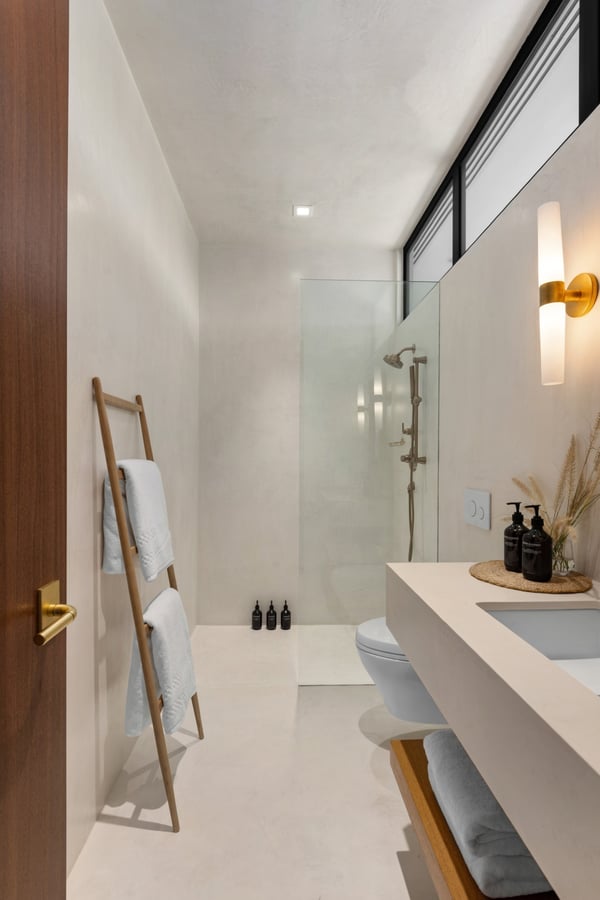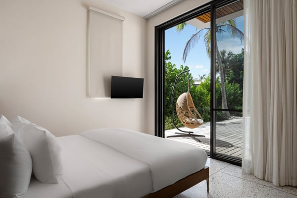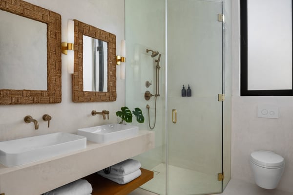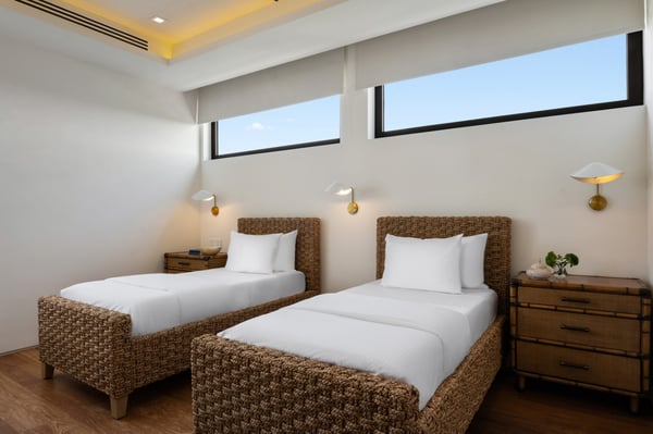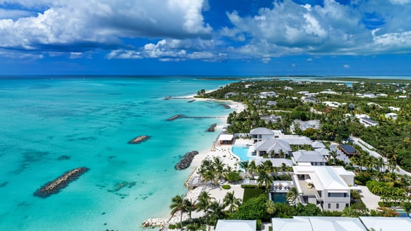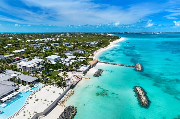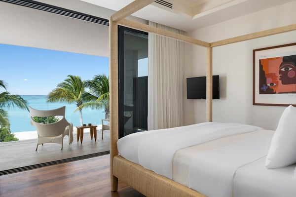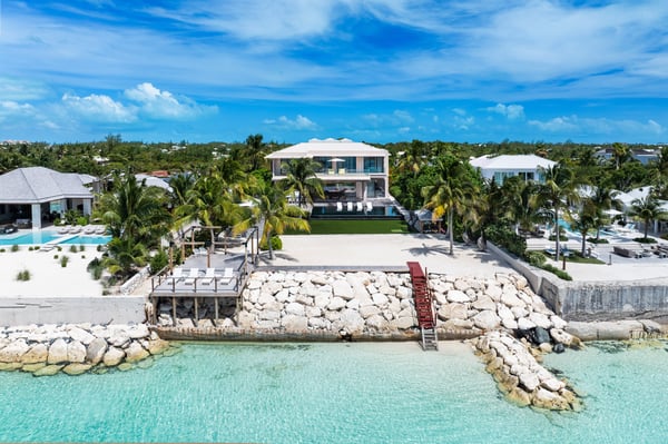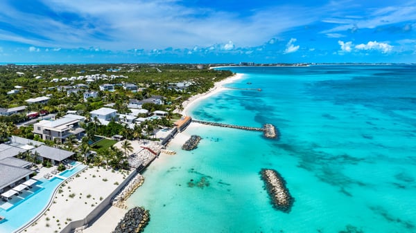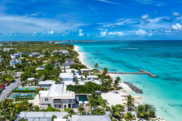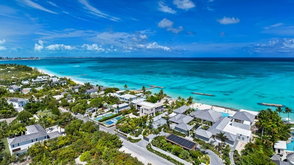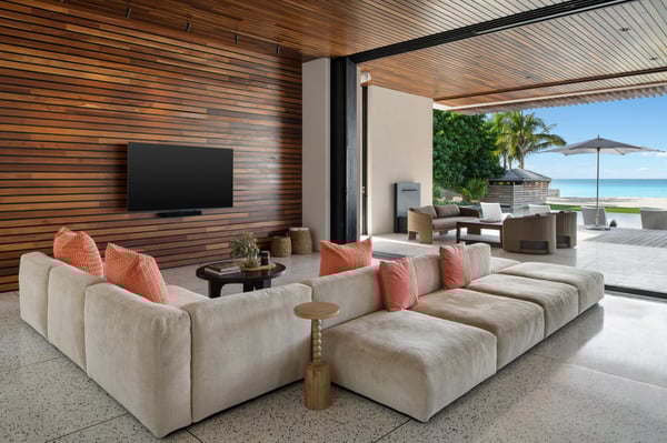 With its bold design and beachfront position Villa Marahuyo delivers distinctive style on world-renowned Grace Bay. The clean lines, wall-to-wall glass and lofty ceilings of Villa Marahuyo carry from the entry through the main living areas and out onto the magazine-worthy main deck, where a dramatic black lava stone pool stands in stark contrast to the white sands and turquoise hues of the beach beyond. With lounge chairs positioned on a shelf in the pool, sun beds lined up alongside it, and hanging cocoon chairs on the deck, there’s no shortage of spots to soak up the sun, while a deep overhang offers ample space to dine or relax in the cool shade. Kayaks, snorkel gear and a pickleball court offer plenty of ways to stay active by day. Come nightfall, the sunken firepit, with its views of the ocean, is an inviting space to sip a sundowner and plan the next day’s adventures. Timber-clad ceilings and terrazzo floors lend the modern interiors a warm aesthetic and fully pocketing doors across the living room bathe the interior in natural light. A vast sectional sofa offers ample space for a full house to get comfortable indoors, a circular dining table is ideal for convivial meals, and the full bar means your butler can mix any cocktail you could dream of. Keen cooks have a spacious, well-equipped kitchen at their disposal and for those who prefer simple fare, there is also a barbecue on the deck. The six bedrooms are tastefully decorated with lots of timber and organic materials and all feature elegant ensuite bathrooms with brass fixtures. One bedroom is located on the main level with direct access to the pool terrace; the remainder, all with beautiful hardwood floors, are located upstairs. Four of these open onto a shared balcony with ocean views and the principal suite includes a luxurious bathroom with indoor and outdoor showers and a circular bathtub.