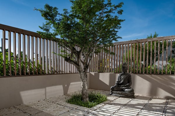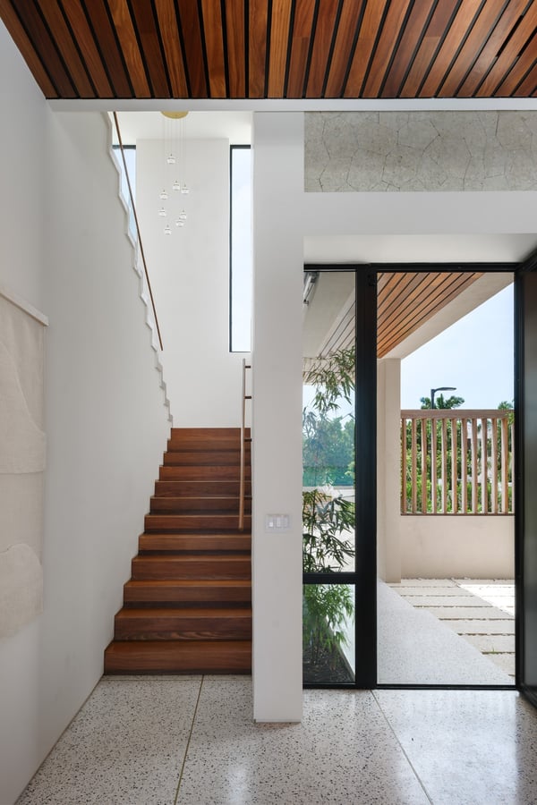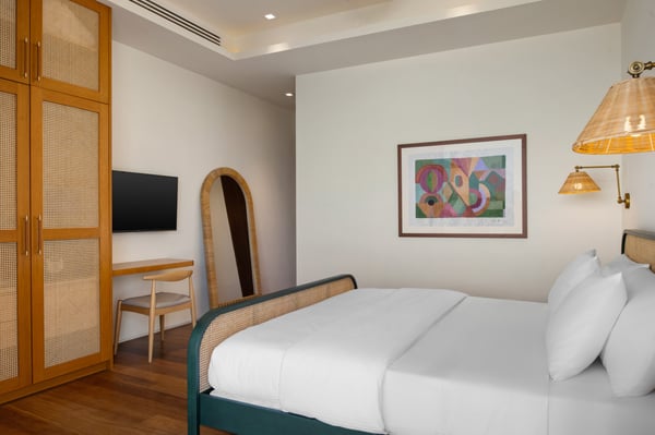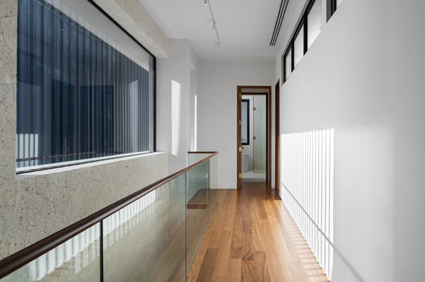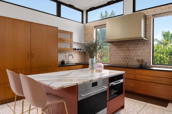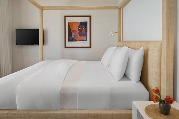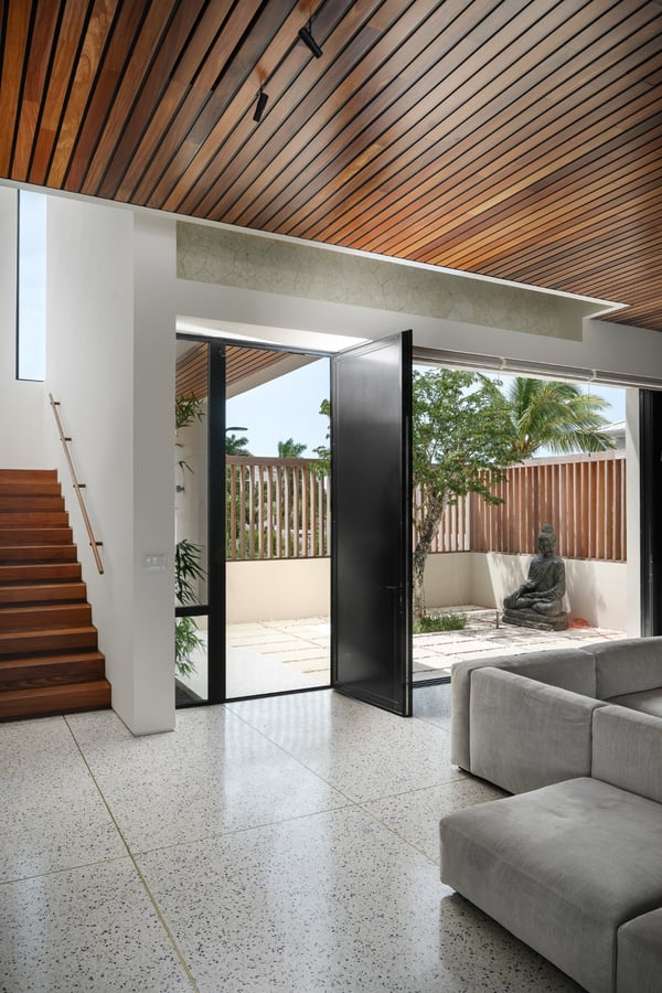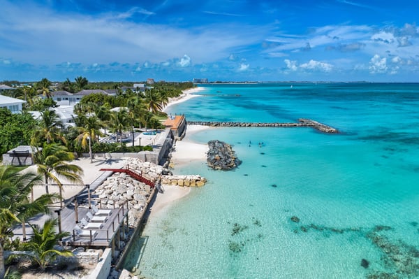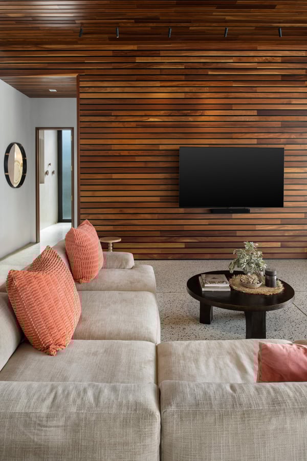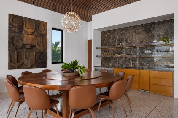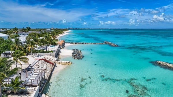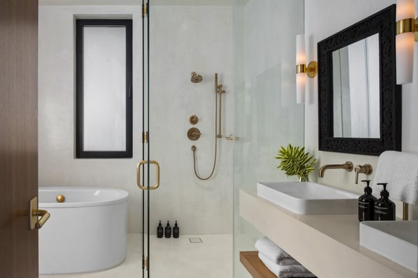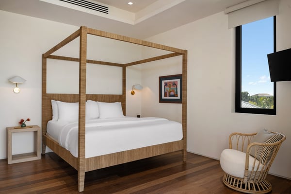 With its bold design and beachfront position Villa Marahuyo delivers distinctive style on world-renowned Grace Bay. The clean lines, wall-to-wall glass and lofty ceilings of Villa Marahuyo carry from the entry through the main living areas and out onto the magazine-worthy main deck, where a dramatic black lava stone pool stands in stark contrast to the white sands and turquoise hues of the beach beyond. With lounge chairs positioned on a shelf in the pool, sun beds lined up alongside it, and hanging cocoon chairs on the deck, there’s no shortage of spots to soak up the sun, while a deep overhang offers ample space to dine or relax in the cool shade. Kayaks, snorkel gear and a pickleball court offer plenty of ways to stay active by day. Come nightfall, the sunken firepit, with its views of the ocean, is an inviting space to sip a sundowner and plan the next day’s adventures. Timber-clad ceilings and terrazzo floors lend the modern interiors a warm aesthetic and fully pocketing doors across the living room bathe the interior in natural light. A vast sectional sofa offers ample space for a full house to get comfortable indoors, a circular dining table is ideal for convivial meals, and the full bar means your butler can mix any cocktail you could dream of. Keen cooks have a spacious, well-equipped kitchen at their disposal and for those who prefer simple fare, there is also a barbecue on the deck. The six bedrooms are tastefully decorated with lots of timber and organic materials and all feature elegant ensuite bathrooms with brass fixtures. One bedroom is located on the main level with direct access to the pool terrace; the remainder, all with beautiful hardwood floors, are located upstairs. Four of these open onto a shared balcony with ocean views and the principal suite includes a luxurious bathroom with indoor and outdoor showers and a circular bathtub.