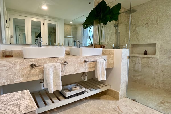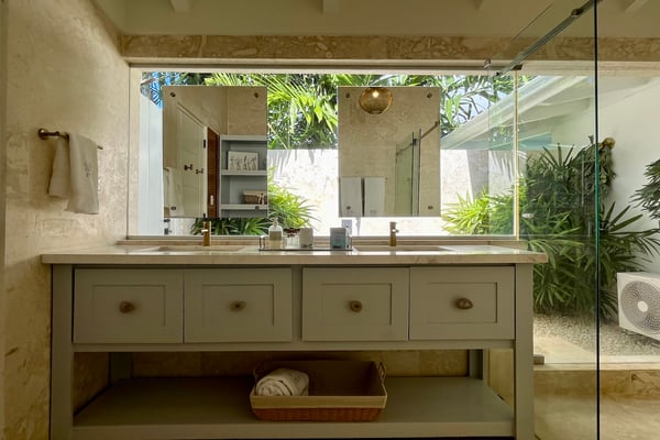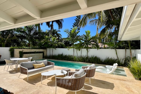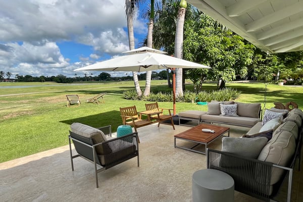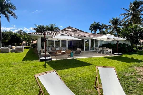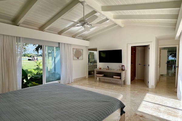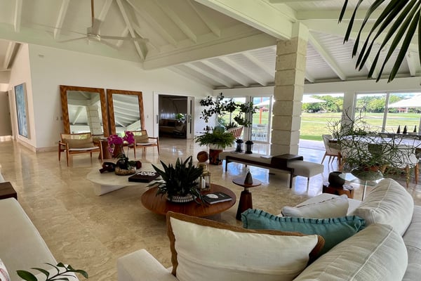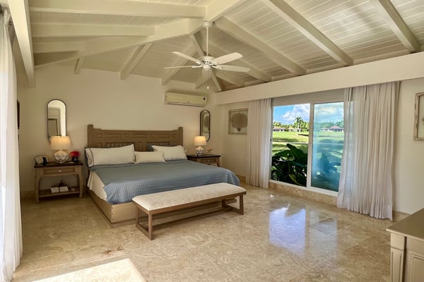 All guests must register with the Casa de Campo Concierge office, and for a small daily fee ($30 per adult per night & $15 per child per night), are granted access to resort areas and amenities. Casa de Campo Resort facilities and amenities include golf courses ($), the fitness centre ($), racquet center ($), restaurants ($) and bars ($). Contact Rental Escapes for more information about pricing. Golf Villa V is a luxurious retreat designed to immerse you in the Caribbean lifestyle, perfect for gatherings with family and friends. The villa’s peaceful terrace offers stunning golf course and lake views, ideal for enjoying cocktails while taking in unforgettable sunsets. The villa’s standout feature is the private king suite, complete with a double shower tower, garden shower, cedar walk-in closet, and anti-noise glass windows framing serene golf course views. A separate glass door leads directly to the heated pool, surrounded by swaying palm trees, creating a true tropical oasis. In addition to the king suite, the villa includes four additional bedrooms, each with two queen-size beds, private bathrooms, cedar-lined closets, ceiling fans, and individually controlled silent air conditioning. The open-concept living and dining areas, along with a cozy study, provide panoramic views of the golf course and lake. The fully equipped kitchen is a chef’s dream, featuring Calacata quartz countertops, oak cabinets, stainless steel appliances, and a breakfast nook for four. Outdoor cooking enthusiasts will appreciate the BBQ area with dual gas tanks. To elevate your stay, the villa offers dedicated service from a skilled cook and a professional waiter/bartender, ensuring a seamless and pampered experience. With WiFi throughout, Golf Villa V combines comfort, elegance, and exceptional service for an unforgettable Caribbean escape.
