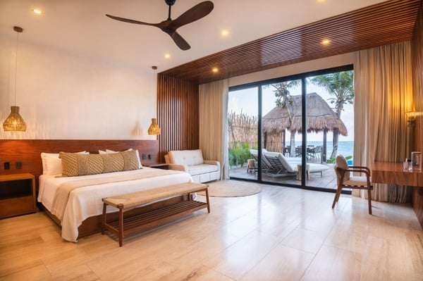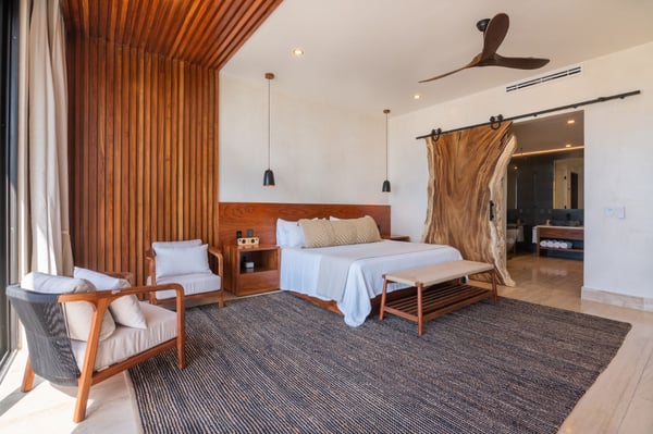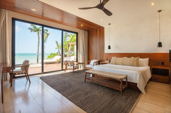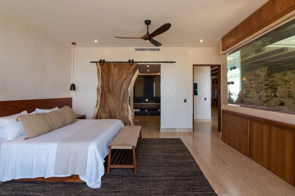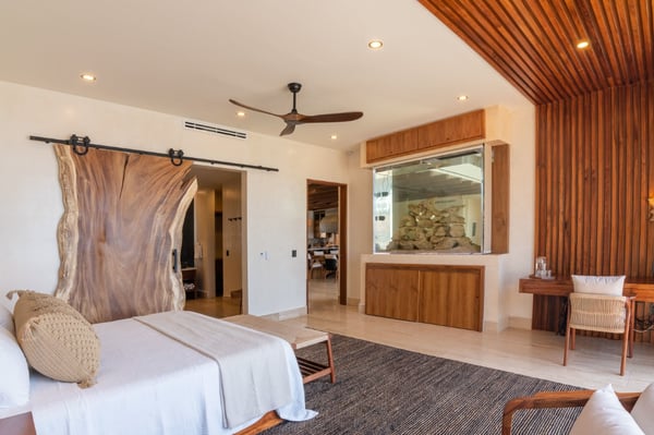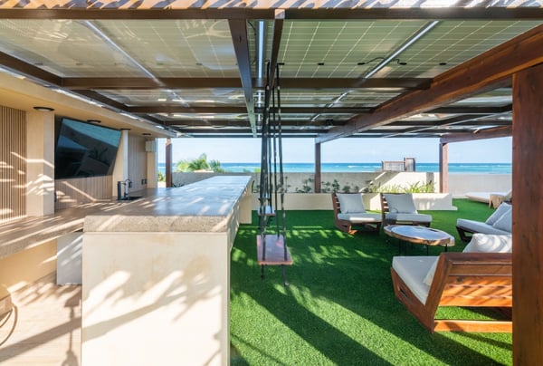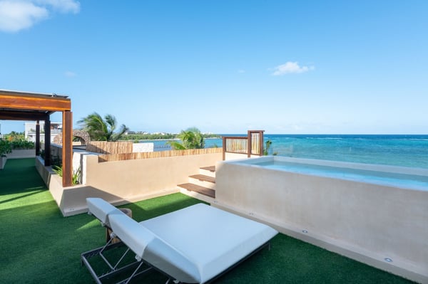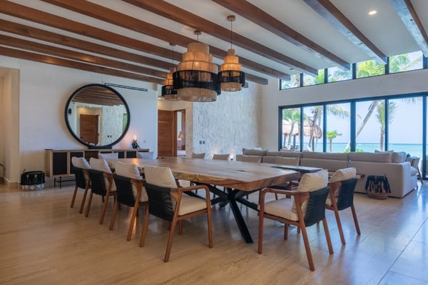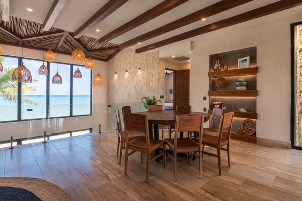 Introducing the exquisite 10,000 sqft. all-inclusive and luxurious oceanfront 6-bedroom, 6 full bath, 4 ½ bath villa. The epitome of opulence and sophistication. Immerse yourself in the beauty of the ocean with uninterrupted, breathtaking views. The house is a fully sustainable green energy home complete with solar panels, rainwater collection and reverse osmosis water filtration. Indulge in the lavishness of six spacious bedrooms, each meticulously designed and furnished with the finest materials to ensure absolute comfort and relaxation. The villa has a perfect blend of contemporary and traditional elements, with sleek modern amenities integrated with classic architectural features. Each bedroom includes an en-suite bathroom, Bluetooth speaker, bathrobe, hair dryer and shower amenities. You will also find a workspace with a floating desk and chair in all the king bedrooms. Designed to captivate and enchant, the tropical fish tank adds an unmatched allure to your stay. Its expertly crafted display seamlessly blends artistry and nature, creating a mesmerizing visual symphony that complements the opulent ambiance of the rental. The tank’s carefully maintained conditions ensure the health and happiness of its inhabitants, providing an authentic glimpse into the wonders of the underwater realm. The lower level is the place for you to indulge in the incredible chef’s creations at either the exquisite marble island that seats 8 or the uniquely extravagant custom wood dining table that seats 16. We also have 2 sofa lounging areas where you can enjoy some TV or lounge on the sofa in front of the infinity pool and the Caribbean. Step out onto the expansive terrace and revel in the serenity of the ocean breeze as you relax in the luxurious outdoor living spaces. Take a dip in the sparkling infinity pool or soak up the sun in the spa-style chaise loungers while admiring the stunning panoramic views. We also have a beautiful Mexican palapa dining area in front of the ocean to enjoy meals alfresco. With sophisticated high-speed internet, a mesh system and 11 routers strategically placed throughout the villa you will never have to disconnect, even though we suggest you do! Don’t forget to play your favourite tunes on our SONOS state-of-the-art WIFI-based speaker system. With music throughout the entire villa, you will find 4 SONOS Systems: 1st-floor living room, 2nd-floor TV lounge, Pool deck, and Rooftop. The second level sports the private gym complete with top-of-the-line equipment, a TV for entertainment and air conditioning to keep you comfortable during your exercise routine. The gym includes a range of weights to select from and a workout bench, chin-up bar, treadmill, rowing machine and exercise bike. Step out of the gym to the fun game room where you can play foosball, ping pong, cards or play one of the board games. If you just want to be close to the action and relax you can sit on the game room sofa or the adjacent TV room sofa. the rooftop boasts the most incredible views where you can sip your soothing tropical drink at the rooftop swing bar. Have the professional staff mix up one of their refreshing and delicious cocktails while enjoying the game on the 65″ TV. That’s not all, our rooftop area has many areas to enjoy including 4 hammocks, lounge chairs and our comfortable rustic weaved dome bed. Then when it’s time to cool off you can take a dip in the rooftop jacuzzi/plunge pool. The dedicated staff is on hand to ensure that your every desire is catered for, from daily housekeeping, chauffeur with vehicle (Suburban that seats 7), private chef services, and much more…… With a commitment to providing unparalleled service, your stay in the luxurious oceanfront villa will be nothing short of extraordinary. Villa Tulumar was also built with ADA-compliant standards for the first floor. We have an entrance ramp to the home and everything is single-level and wheelchair accessible all the way to the palapa dining on the beach. We provide a roll-in shower chair and raised toilet with grab bars. Villa TuluMar is also self-sustaining. We collect our rainwater and have a well with a reverse osmosis desalination plant for purified drinking water, biodigester, Solar Panels with batteries, and an electric generator plant. We also maintain 2 Internet ISPs with cellular data backup. We have done everything possible to ensure you always have water, power, a/c, and internet. PLEASE NOTE: Tulum is booming. Like most of Tulum, there is an active construction nearby that is scheduled to be completed in February 2024. There is a 10-foot privacy wall. The building is in the interior phase of construction (plumbing, electrical, flooring, etc) and all the concrete has been poured. The heavy machinery phase of construction is completed. Noise cannot be heard inside the Villa due to hurricane-grade windows and concrete walls, but there is some hand tool noise outside from 9 am-5 pm during the work week.