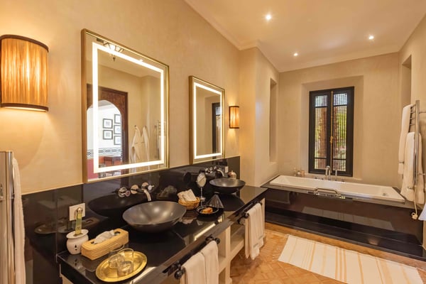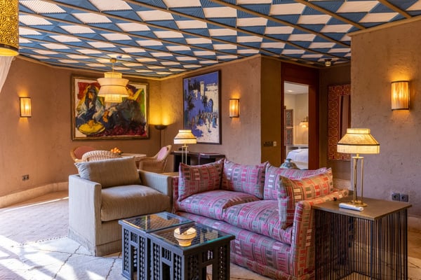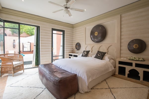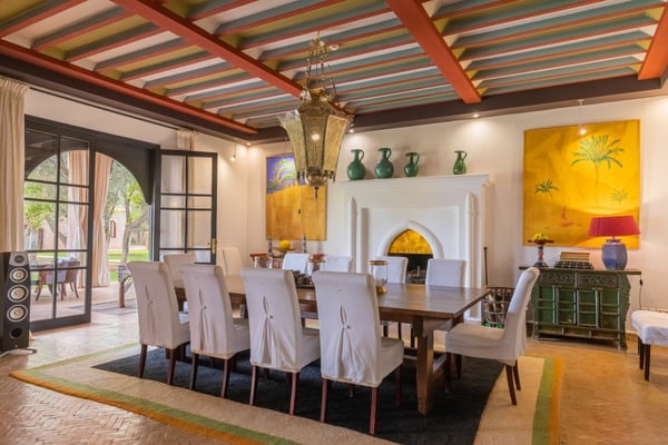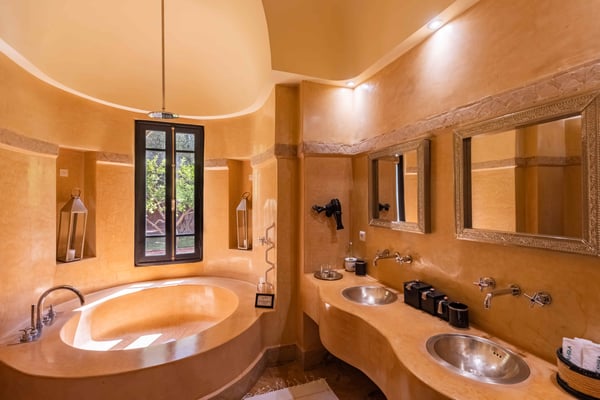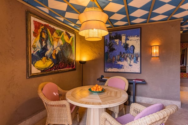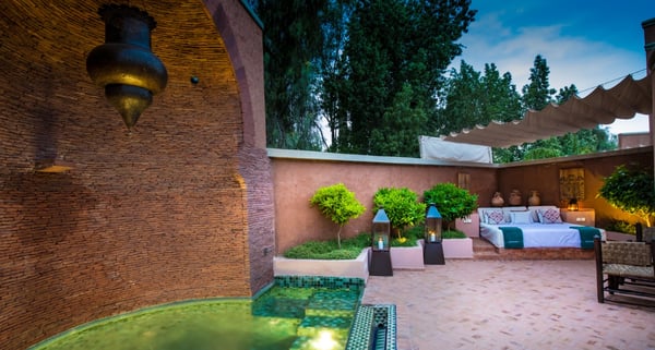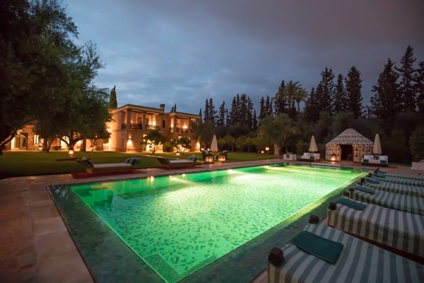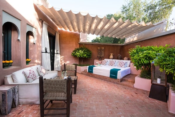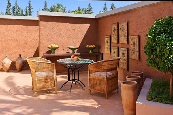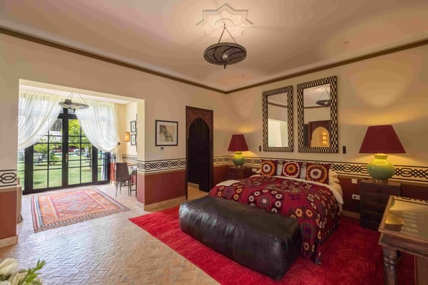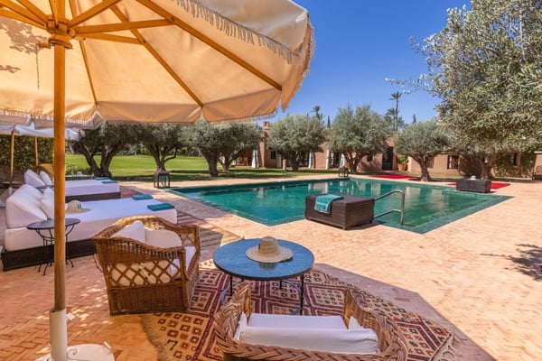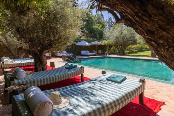 Ezzahra Estate is 15 mins from the centre of Marrakesh, are in 20,000 square metres of fully landscaped gardens with ancient olive trees, date palms and orange and pomegranate trees. Villa Ezzahra sleeps fourteen, Owner’s Pavilion sleeps two,Villa Alkhozama sleeps four, Villa Azzaytouna sleeps six, and Villa Azeer sleeps three. Each house is secure and independent from the others with private access, pools and gardens. The villas, which come fully staffed, can be hired individually or together, which with the owner’s pavilion, can accommodate up to 29 guests on the estate. Stays at the Ezzahra estate includes all the spa treatments, food chosen from our a la carte menu, soft drinks, a guided and accompanied tour to the medina, laundry service, heated swimming pool and one return airport transfer irrespective of numbers.